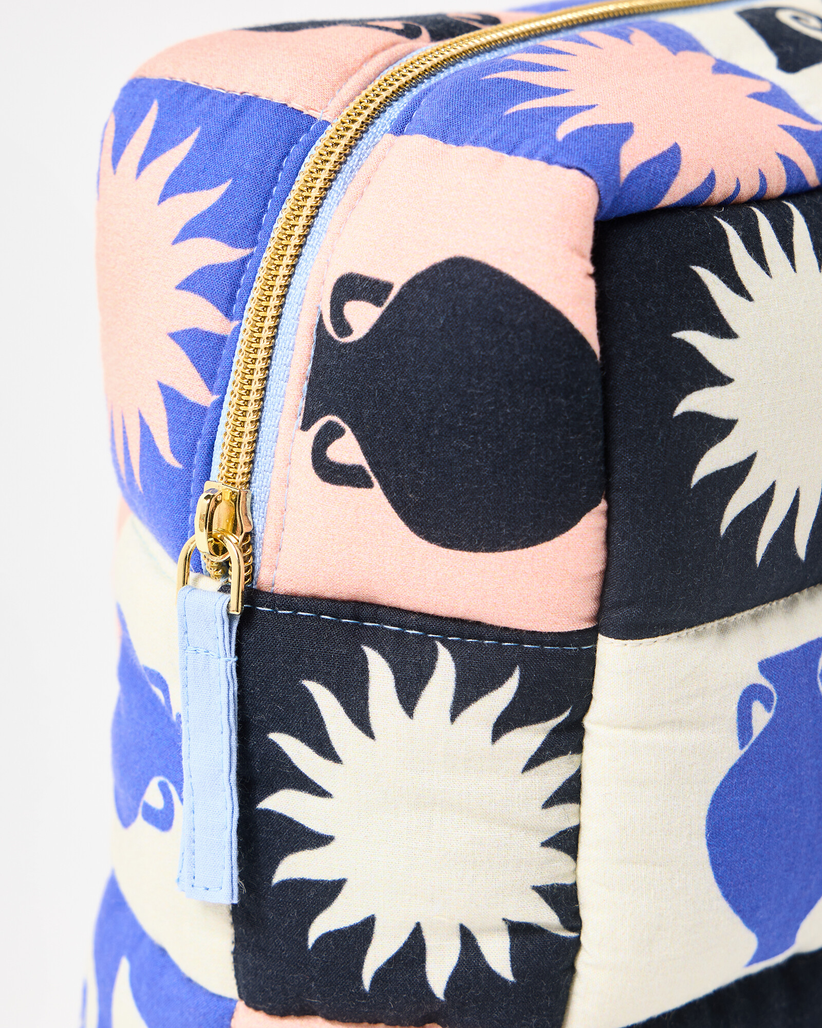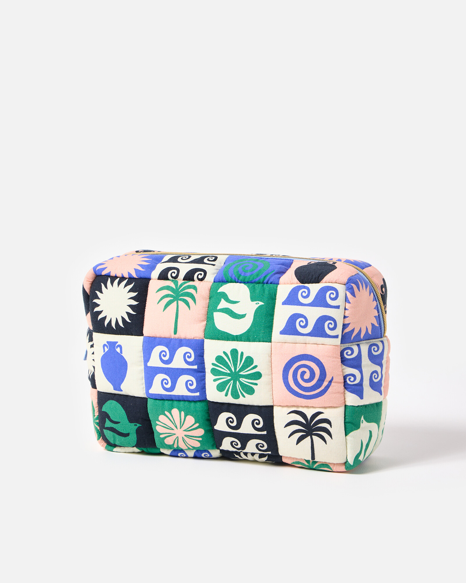 Large quilted wash bag in blue, white and green hues, featuring a blue lining with inner slip pockets, a zip closure and blue fabric pull. The tiled patchwork design features motifs inspired from an OB trip to Marrakesh, and includes wave, sun, palm tree, spiral and bird block print silhouettes hand drawn by our in-house design team. Use to store beauty and cosmetic items on your travels.