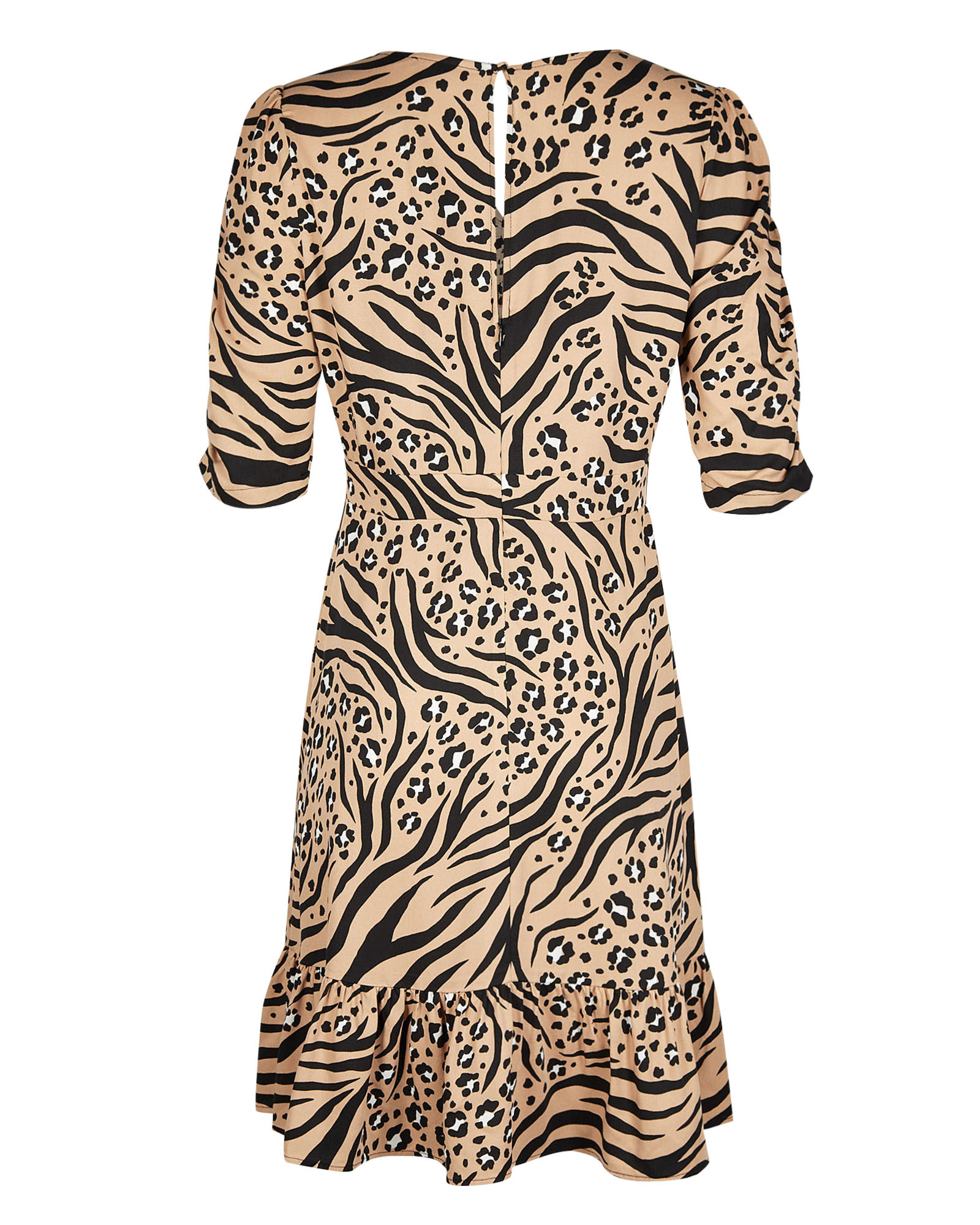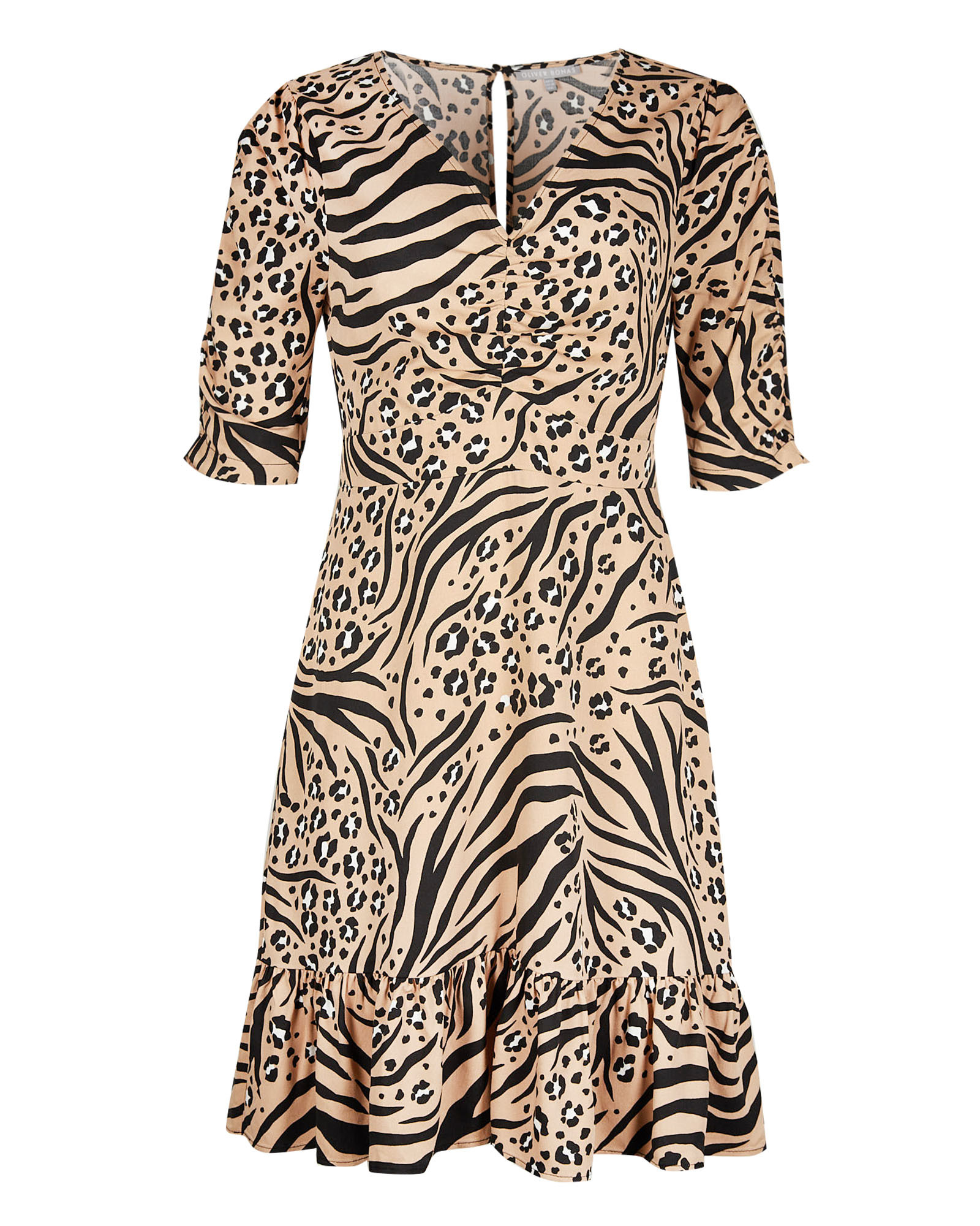 In a fit & flare style with a ruffle hem, this mini dress combines a mixed animal print in brown and black tones with ruched detailing. In an A-line fit, this mini dress is completed with fitted short sleeves and a V-neckline with a keyhole button fastening in the back neck.
