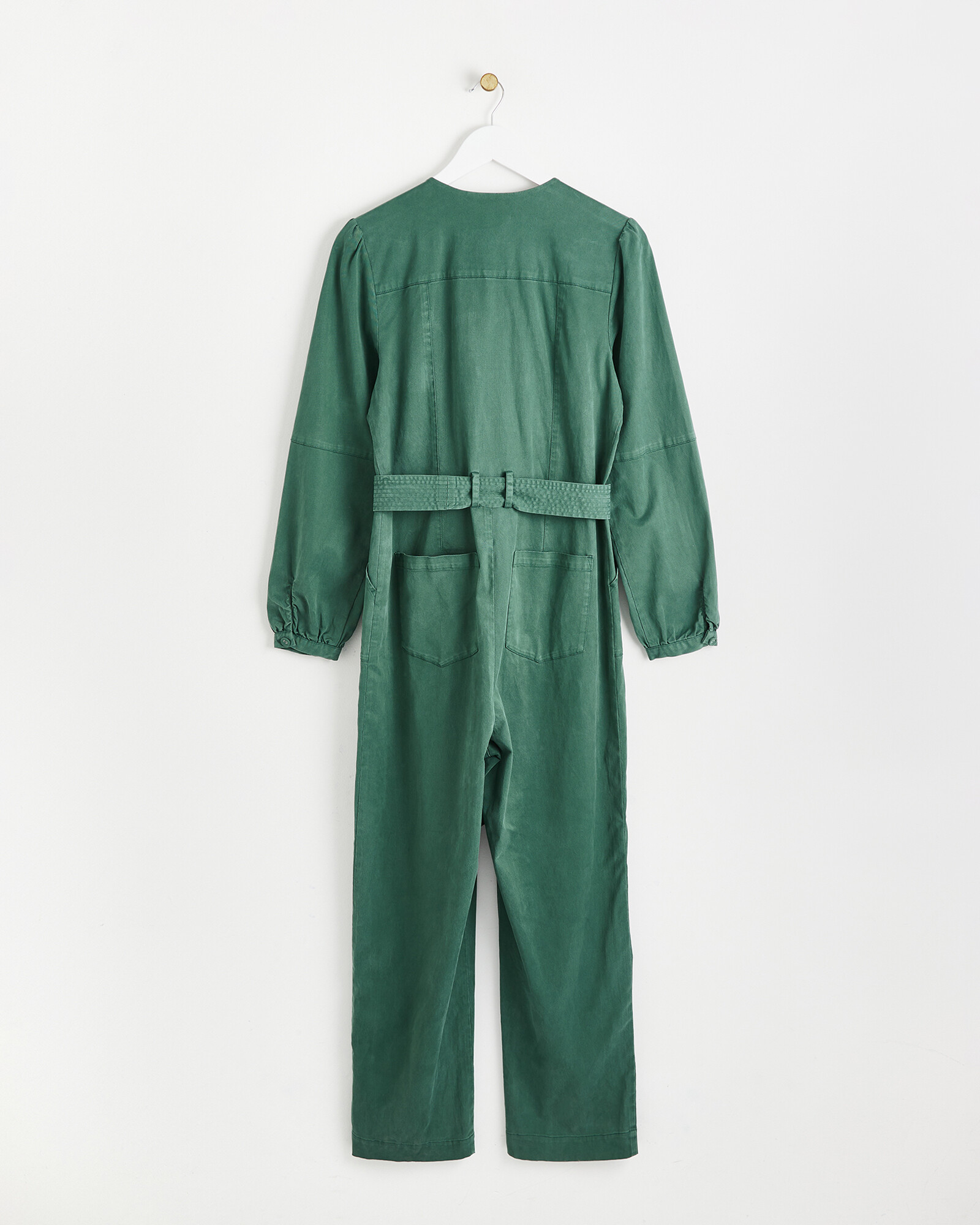 In a forest green, this shirt-style jumpsuit will quickly become a wardrobe staple. With an asymmetrical neckline and off-centre buttons, a belt sits at the waist to accentuate the fit. Gathered sleeves and pleated shoulders add to the look, complet with two front pockets.