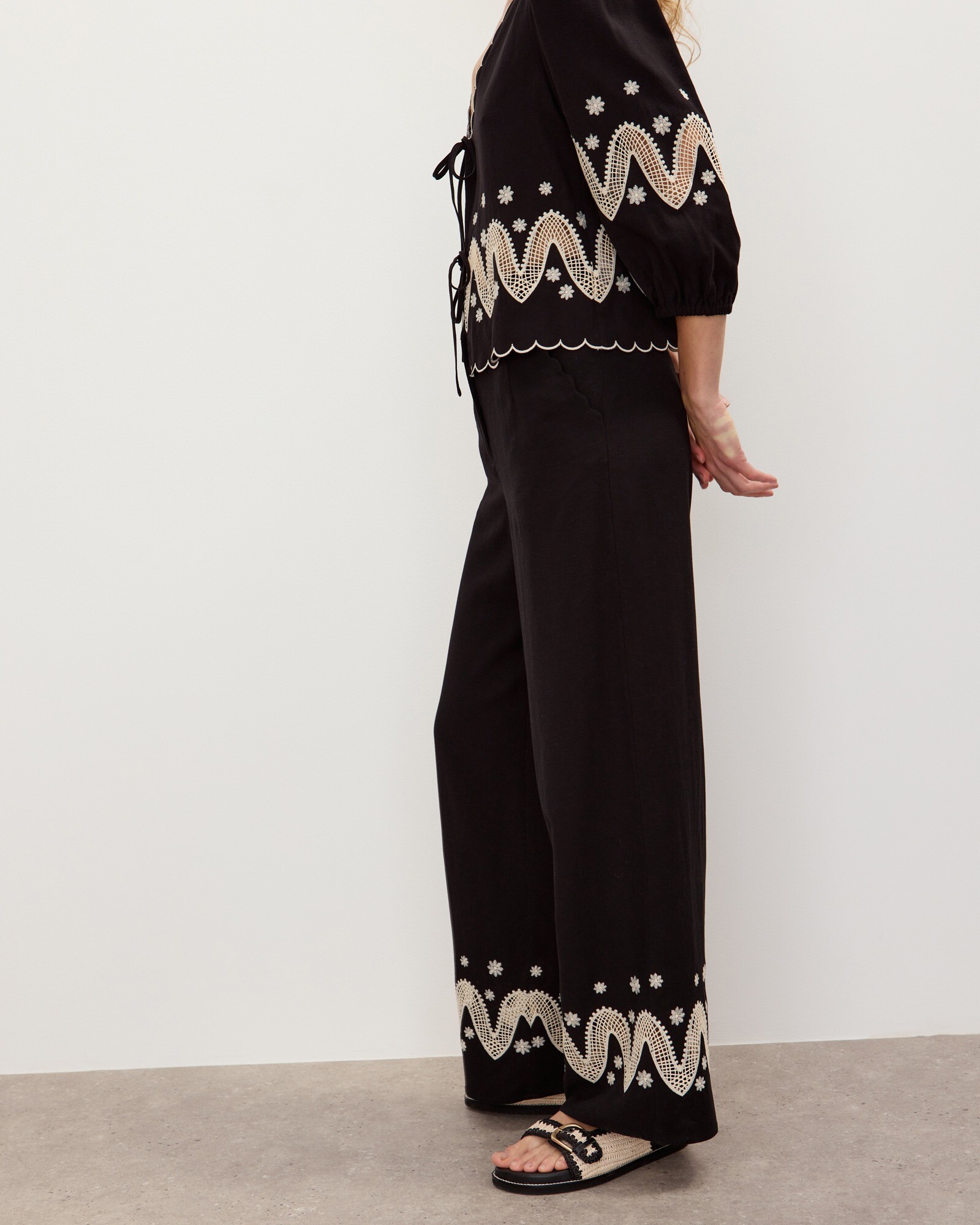 Black & Cream Cutwork Embroidered Wide leg Trousers
