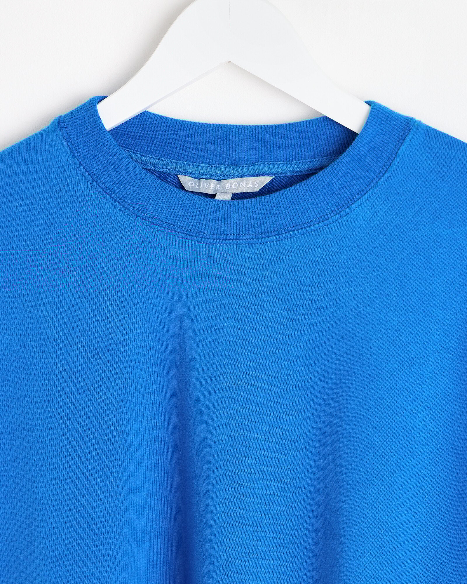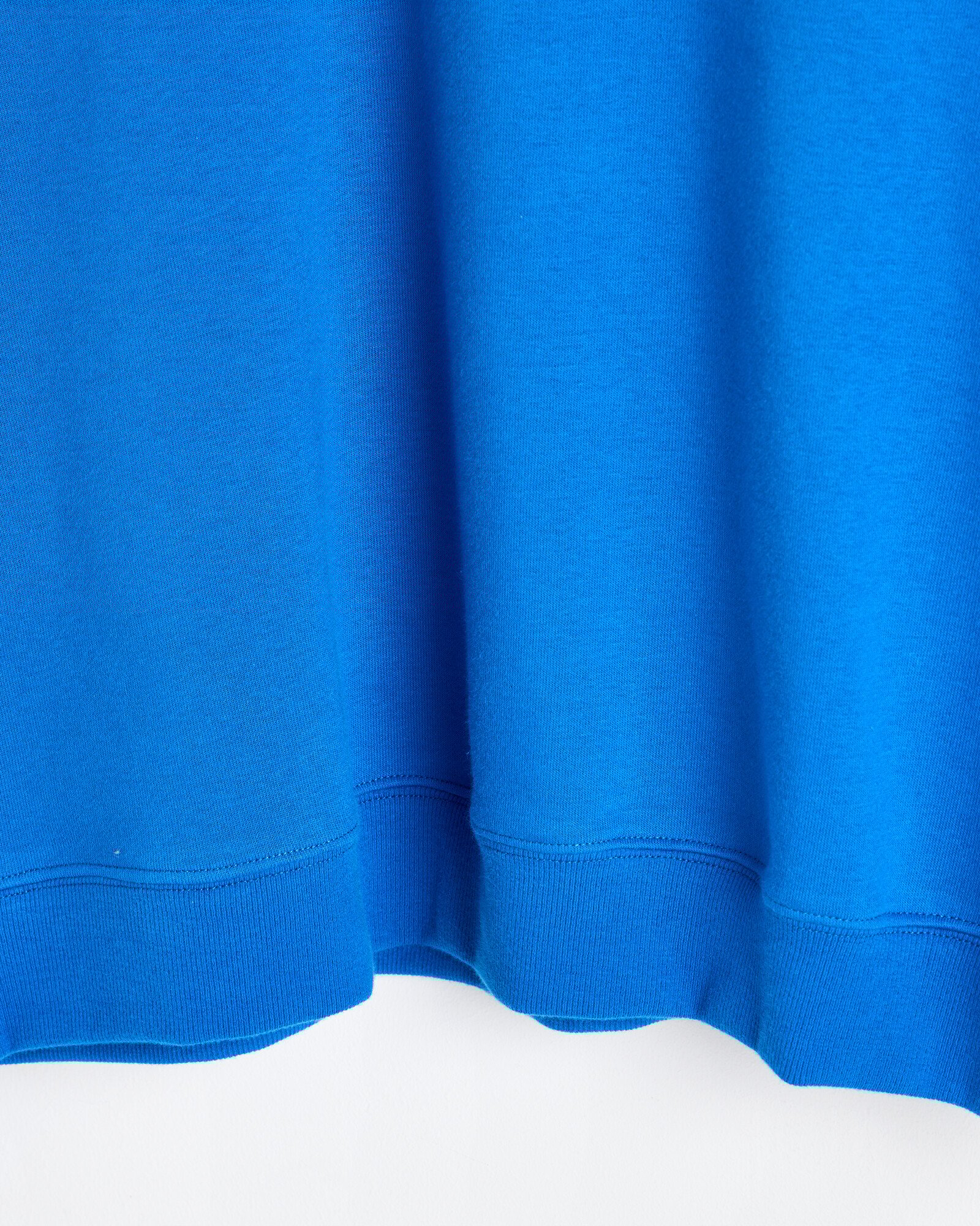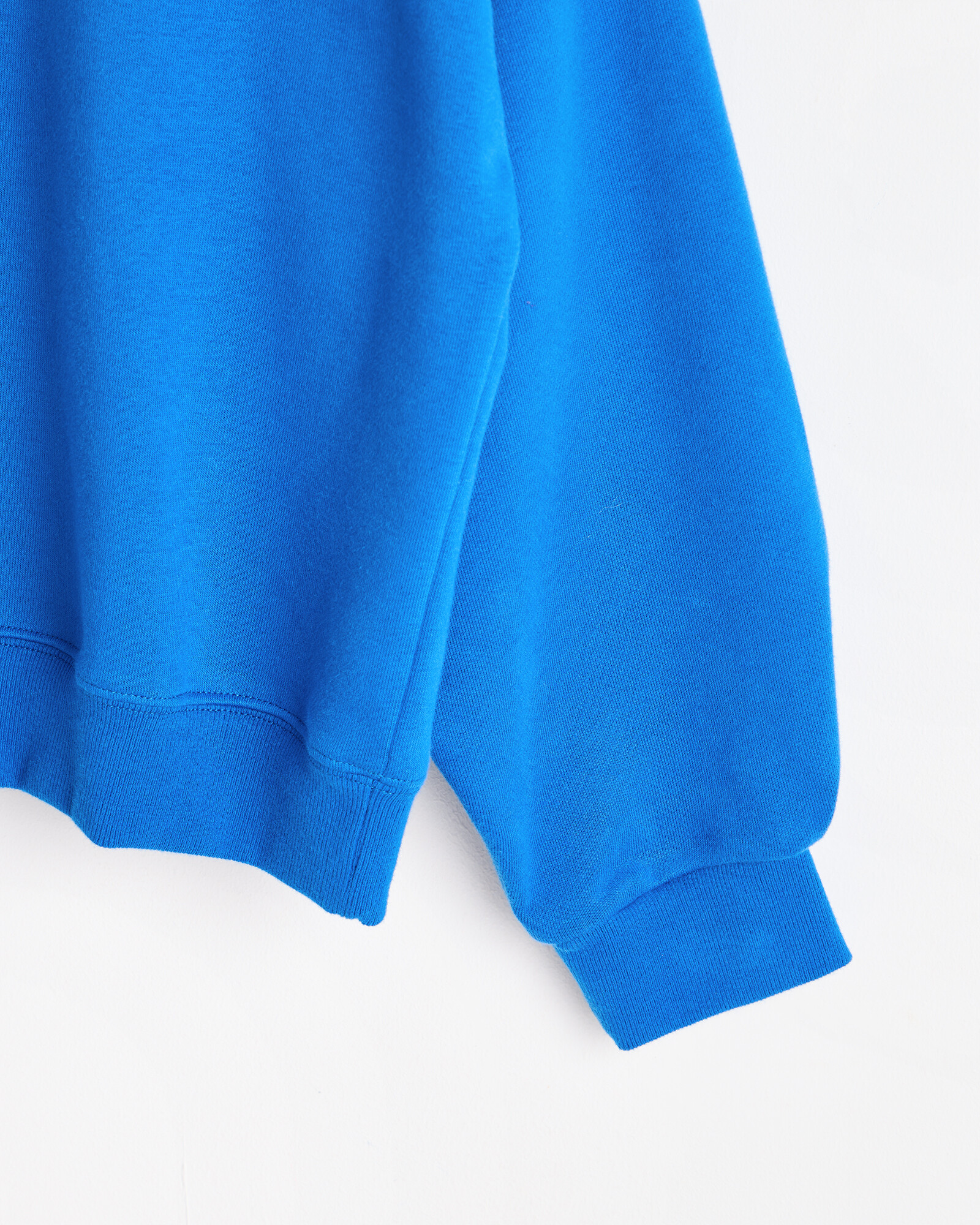 Bright blue sweatshirt with drop shoulders and a relaxed fit.
