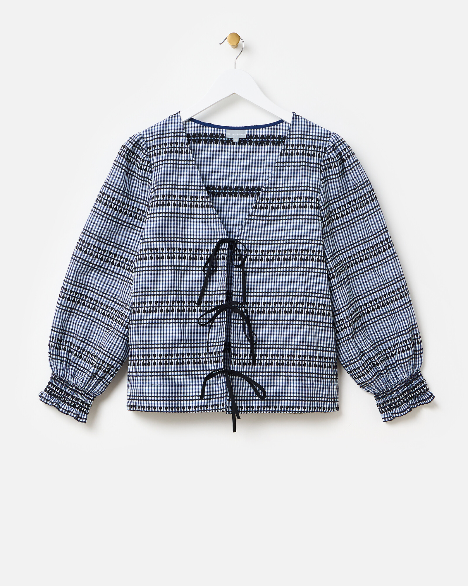 Blue Gingham Embroidered V-Neck Tie Front Top