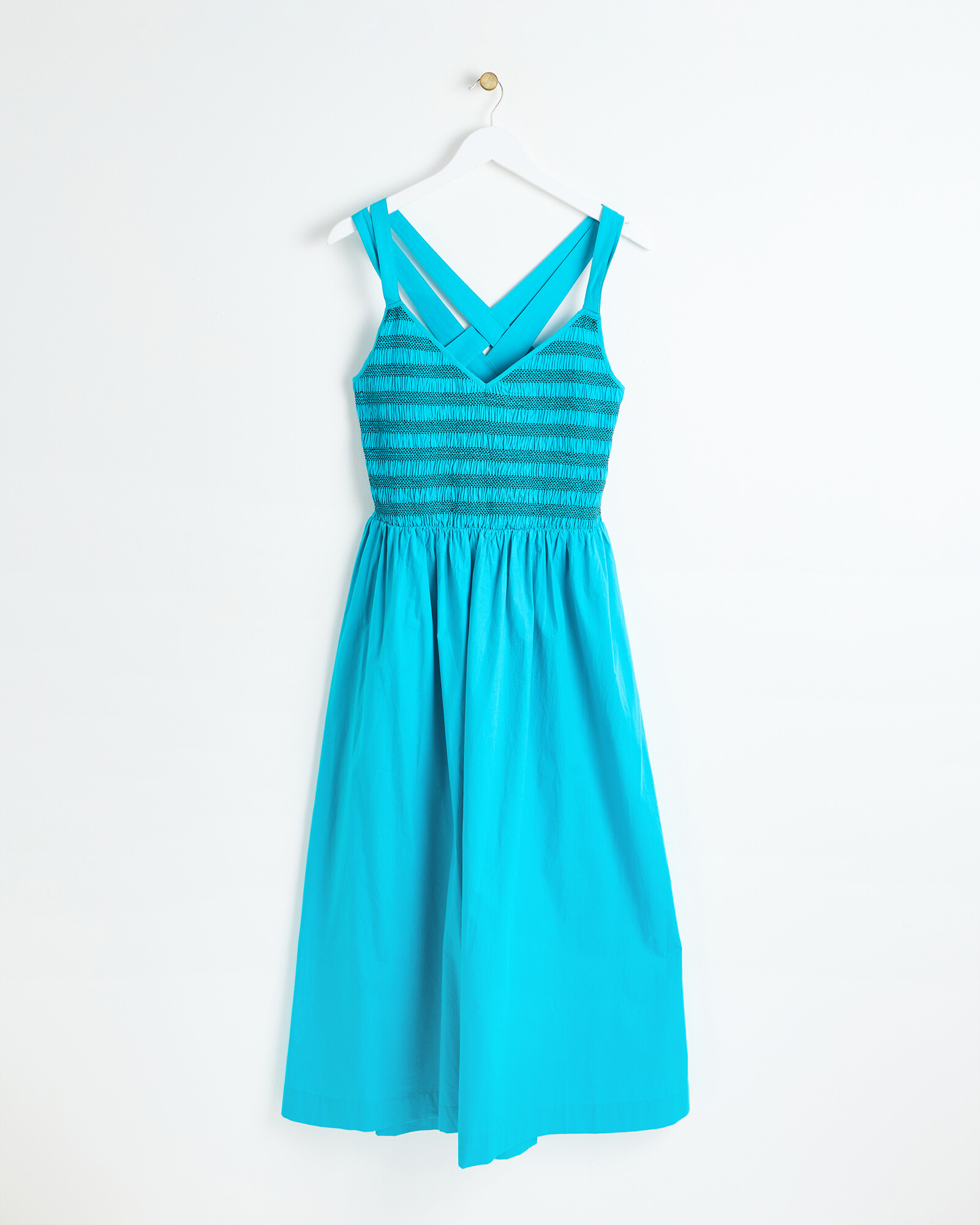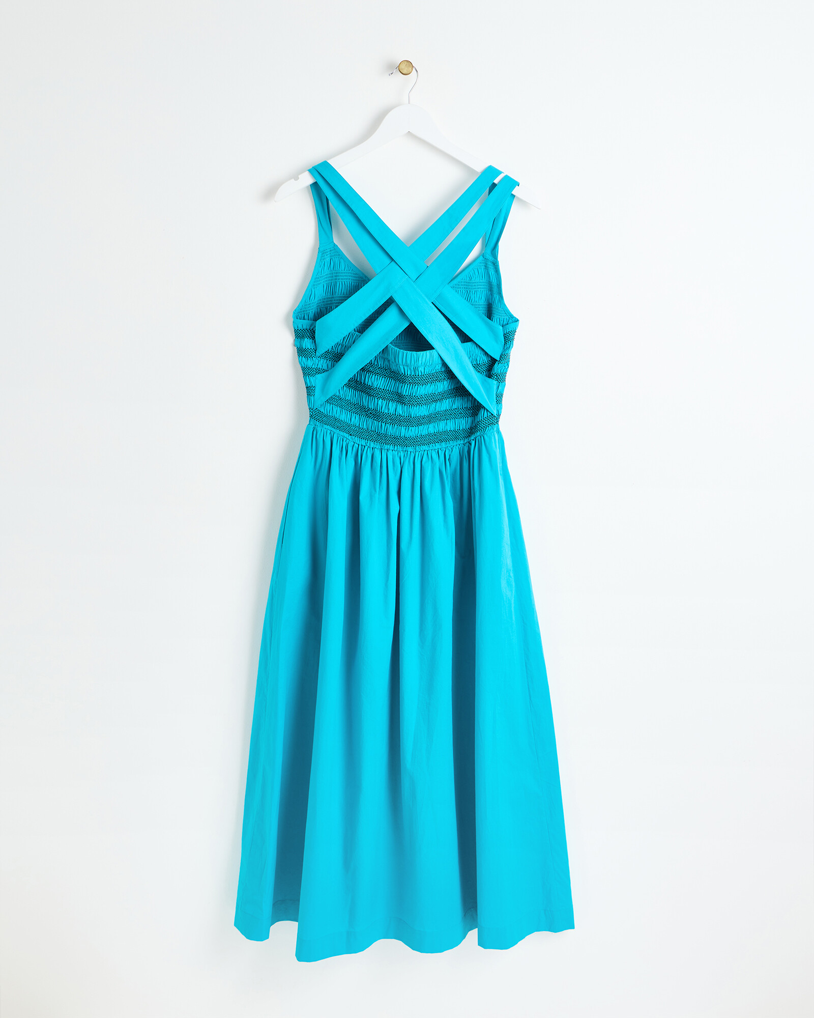 Blue Shirred V-Neck Open Back Midi Dress