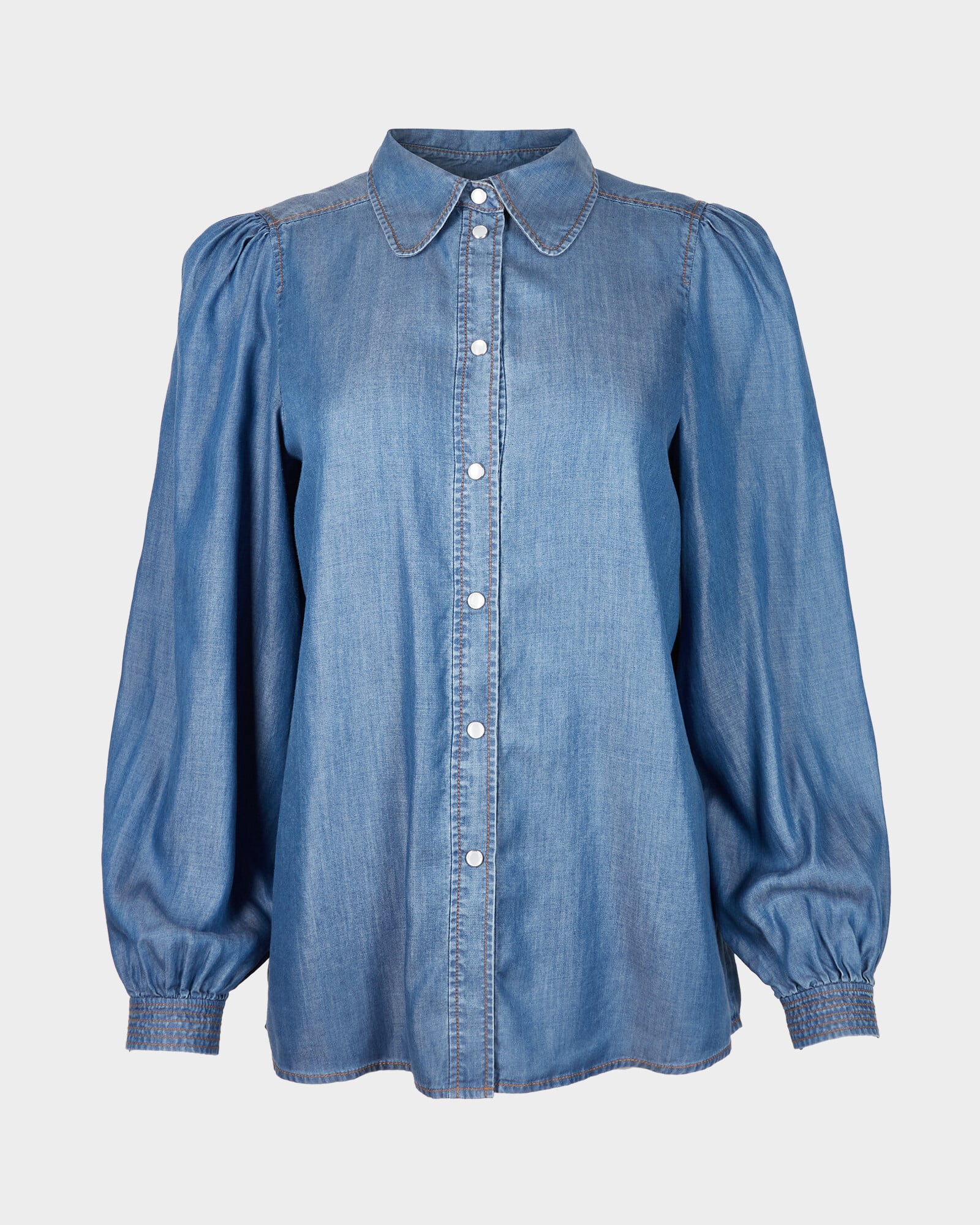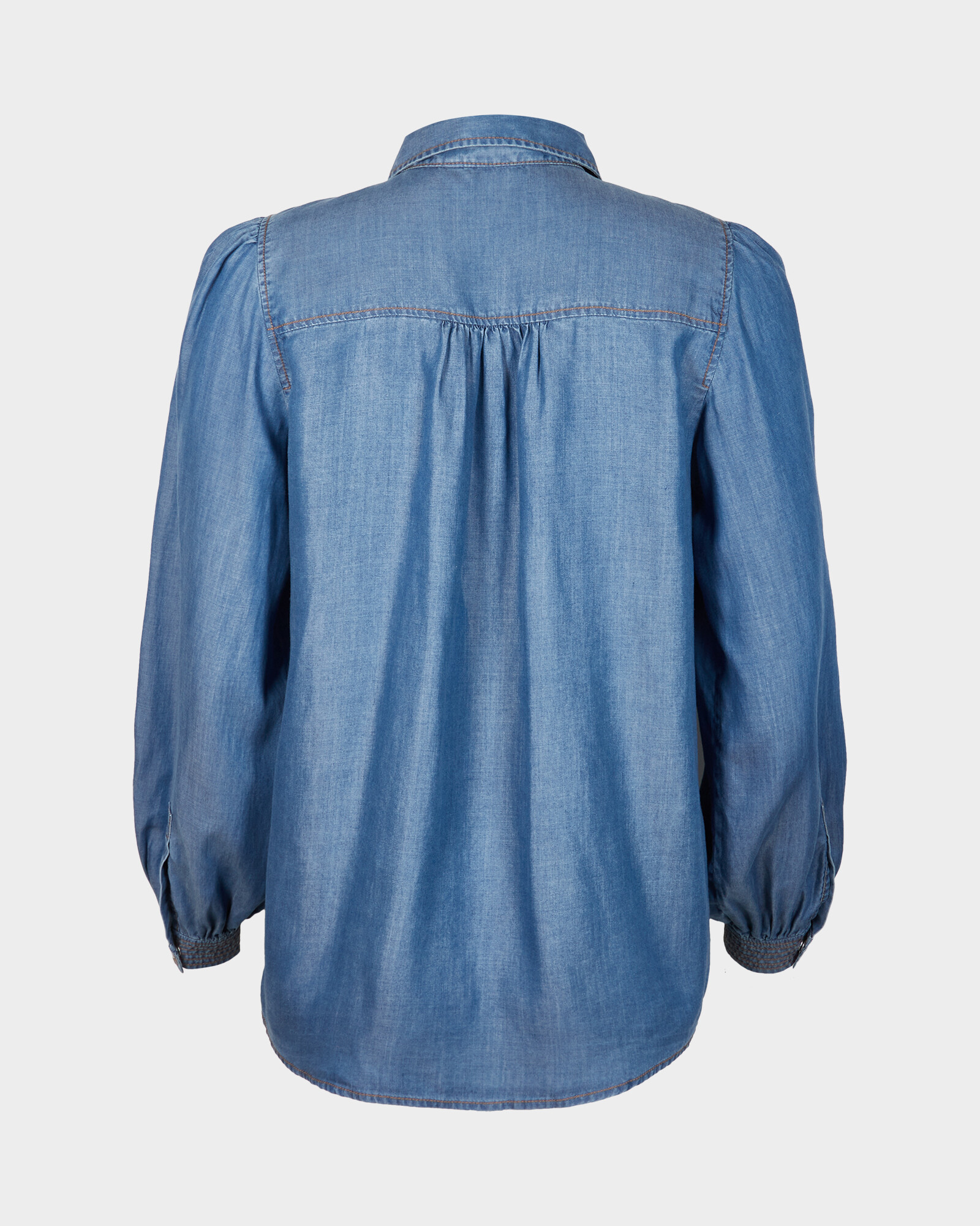 Style: ShirtDesign: Blue chambray denimShape: StraightNeckline: CollarSleeves: LongFastening: Popper buttonPleat detailingFitted cuffs