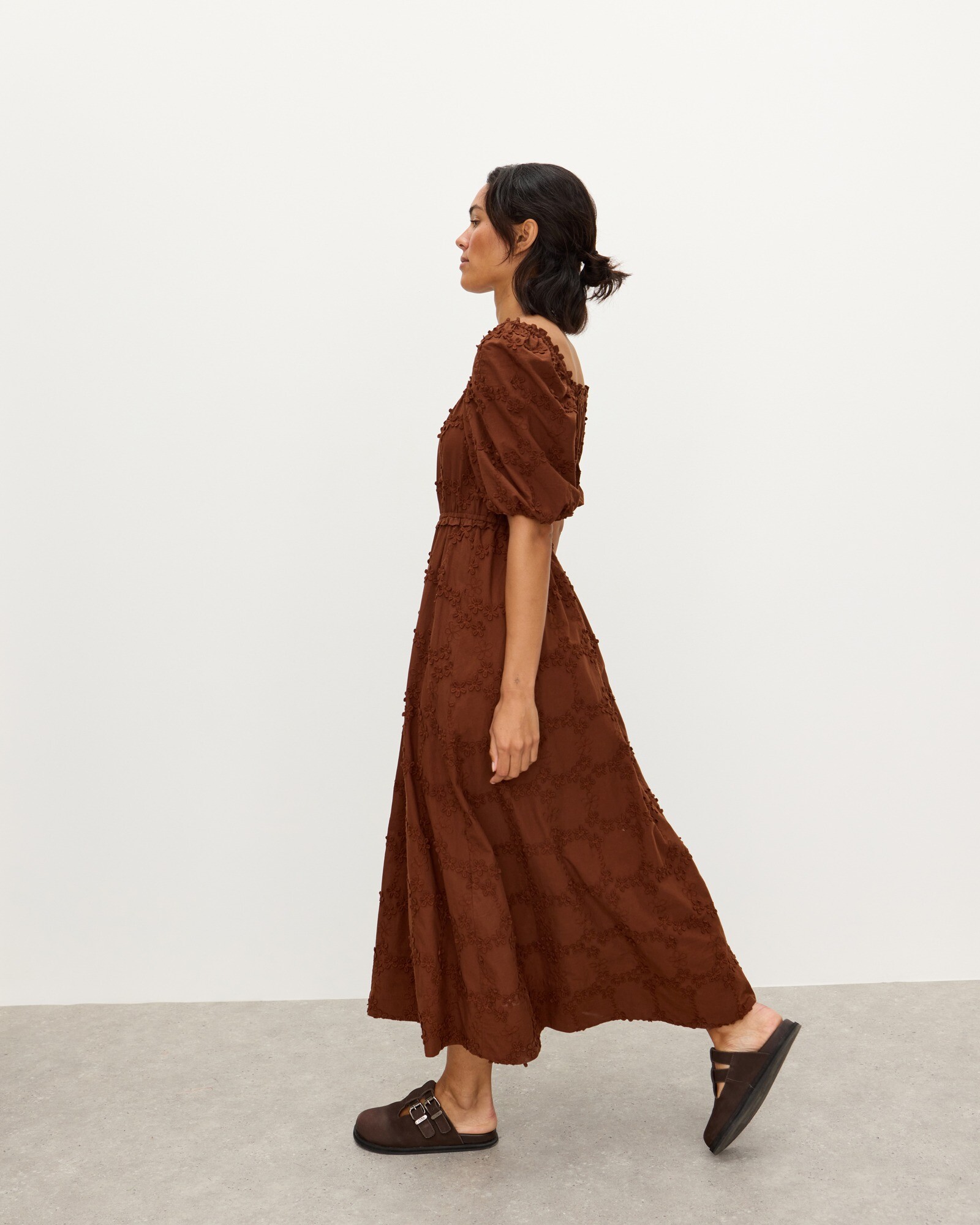 Chocolate Brown 3D Floral Textured Bardot Midi Dress
