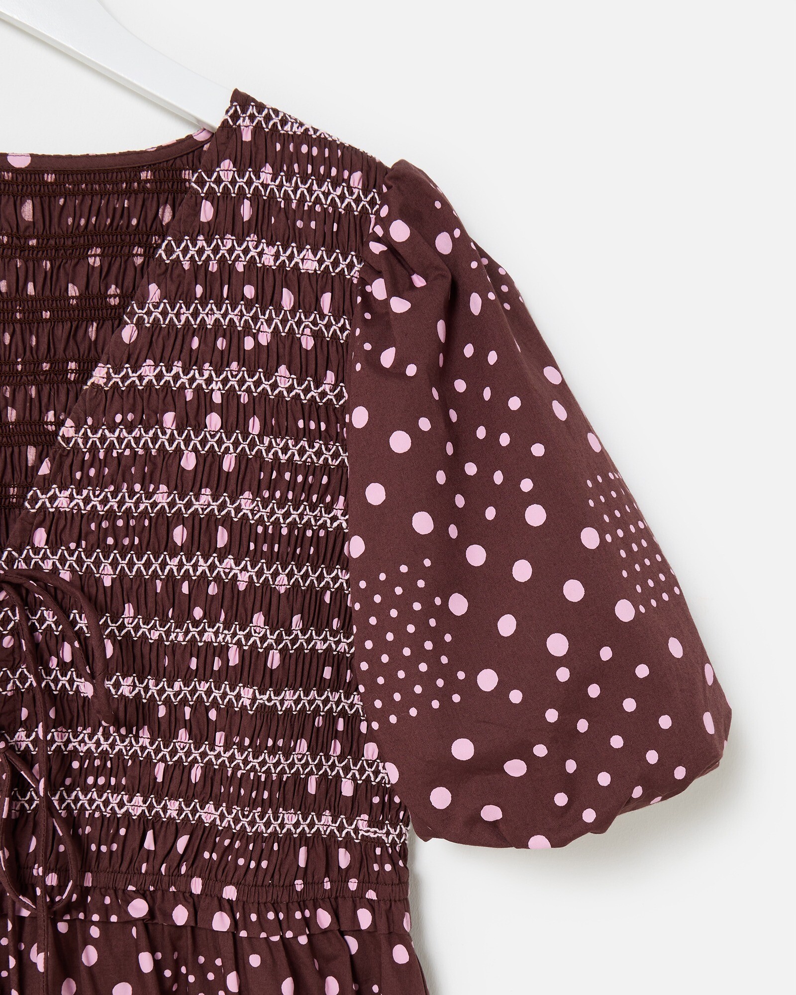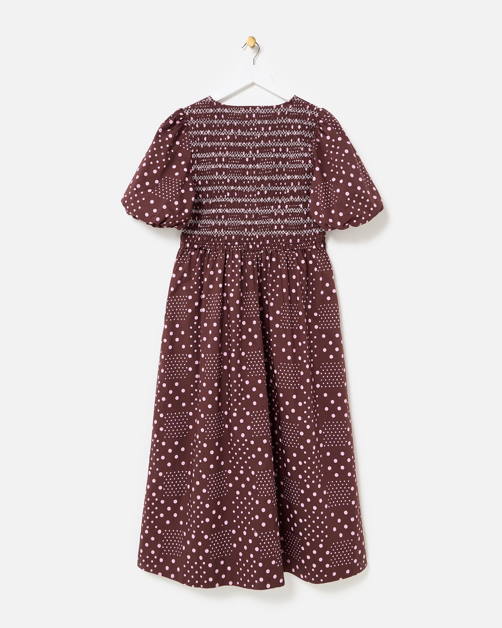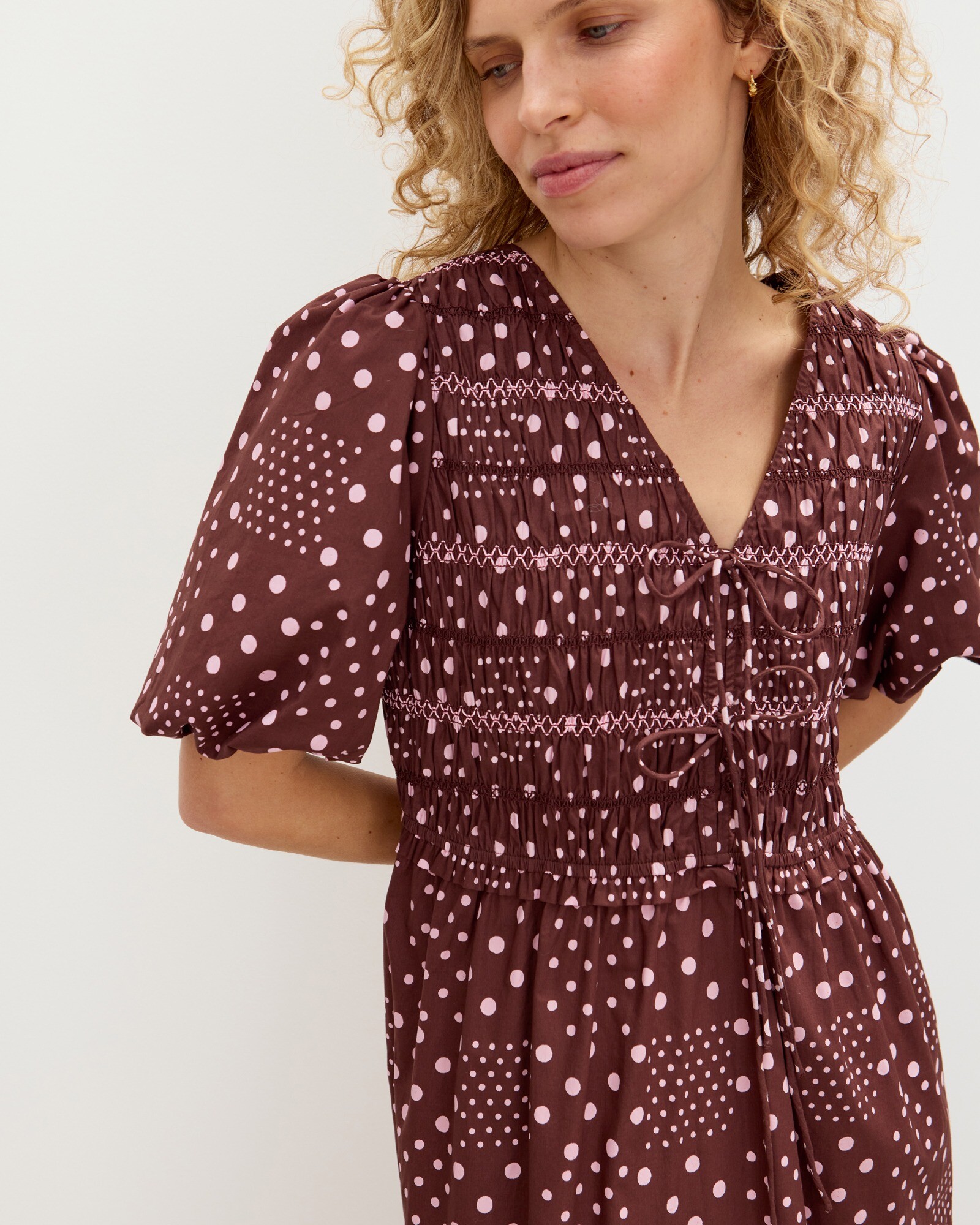 Chocolate Brown & Pink Polka Dot Puff Sleeve Midi Dress