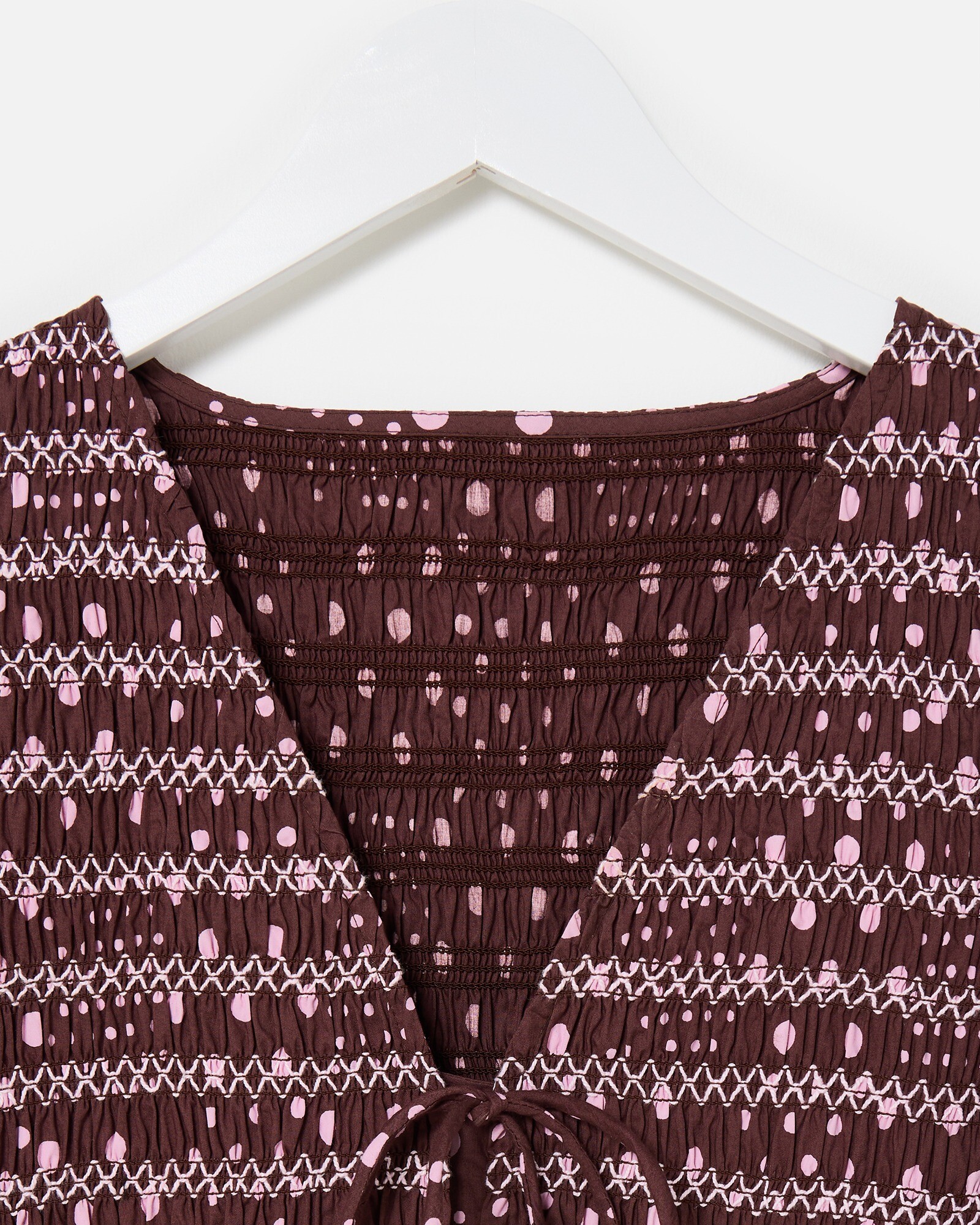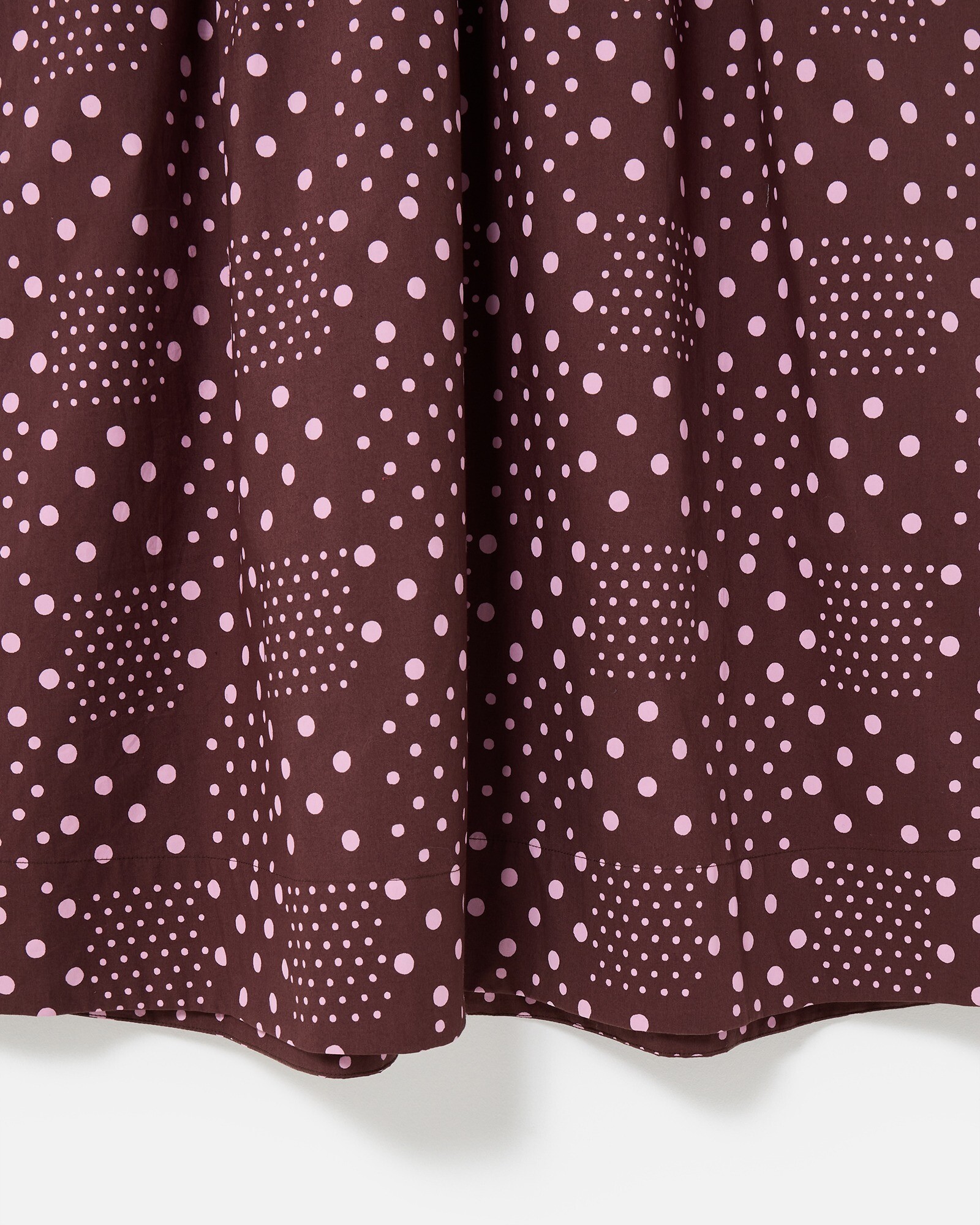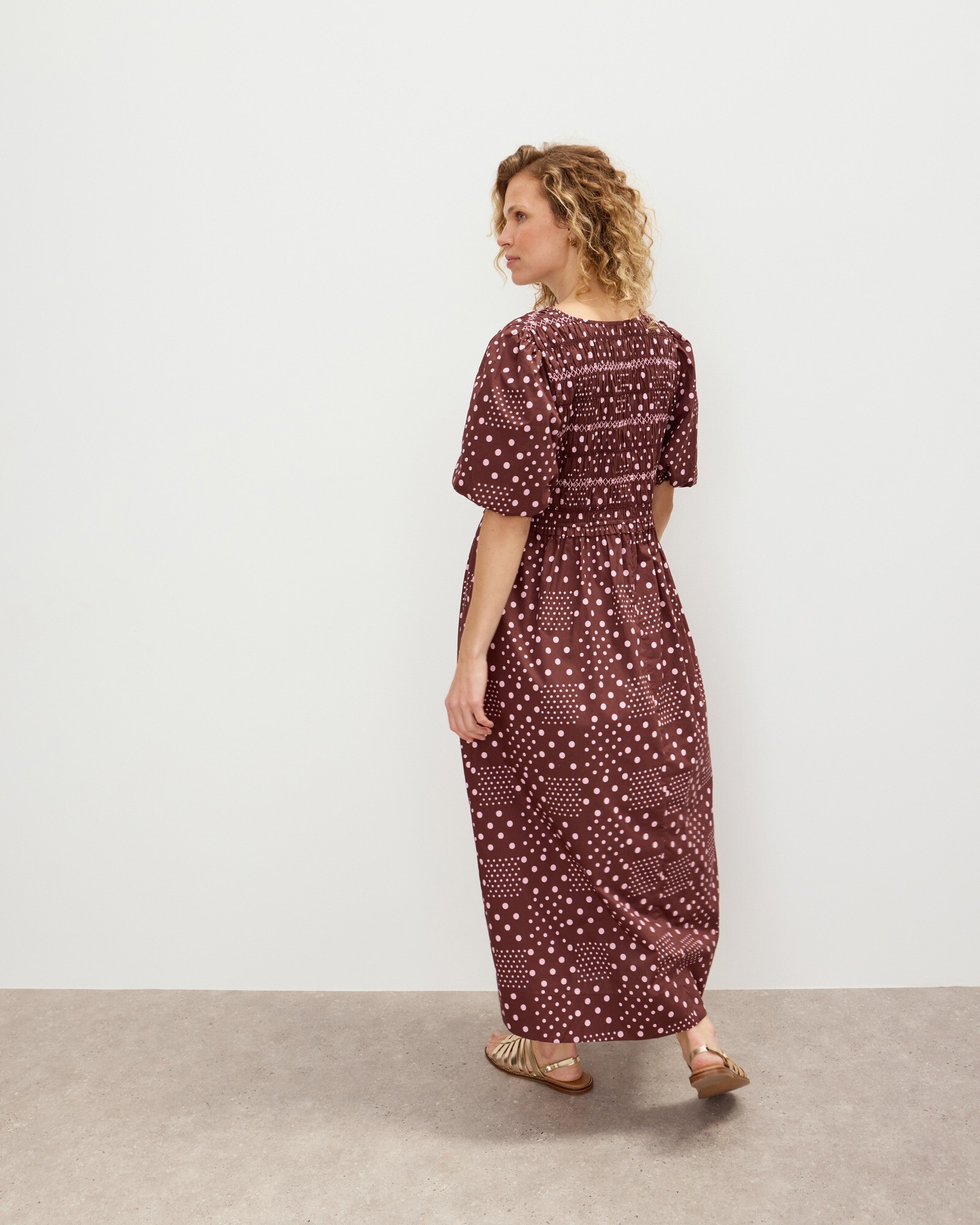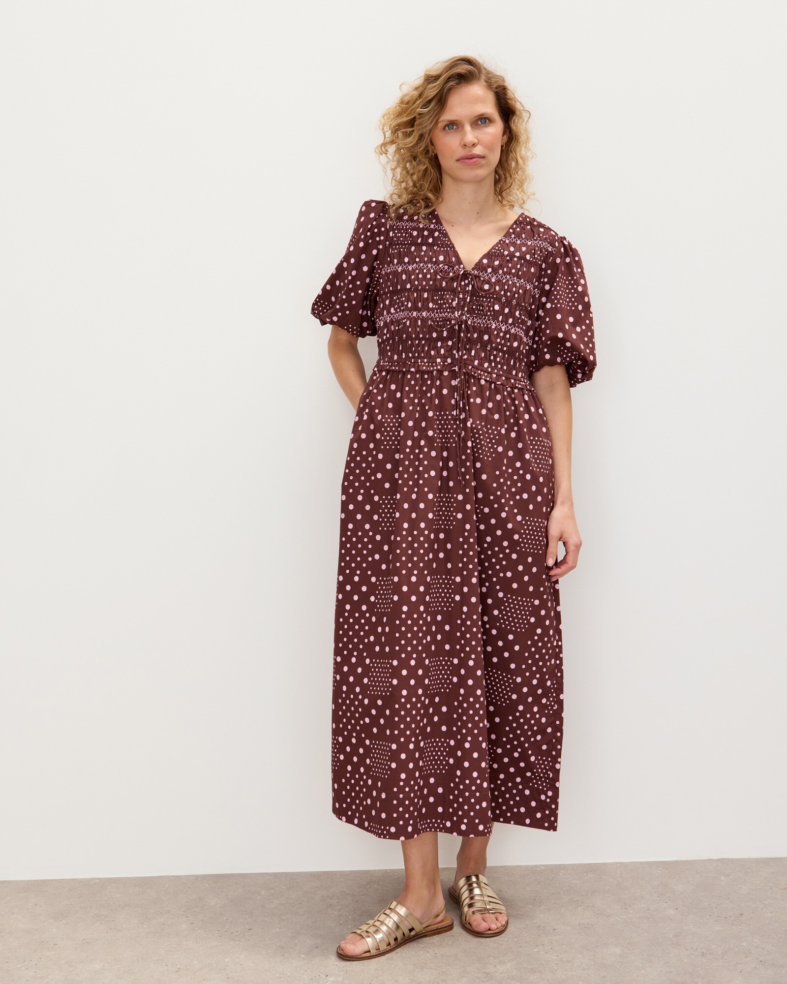 Chocolate Brown & Pink Polka Dot Puff Sleeve Midi Dress