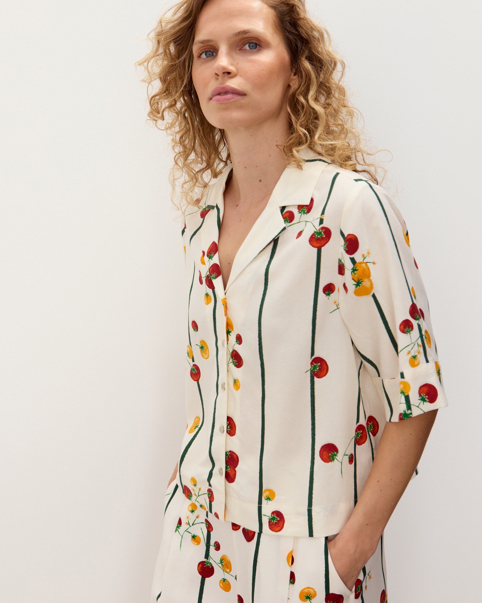 Cream & Green Striped Tomato Print Short Sleeve Shirt