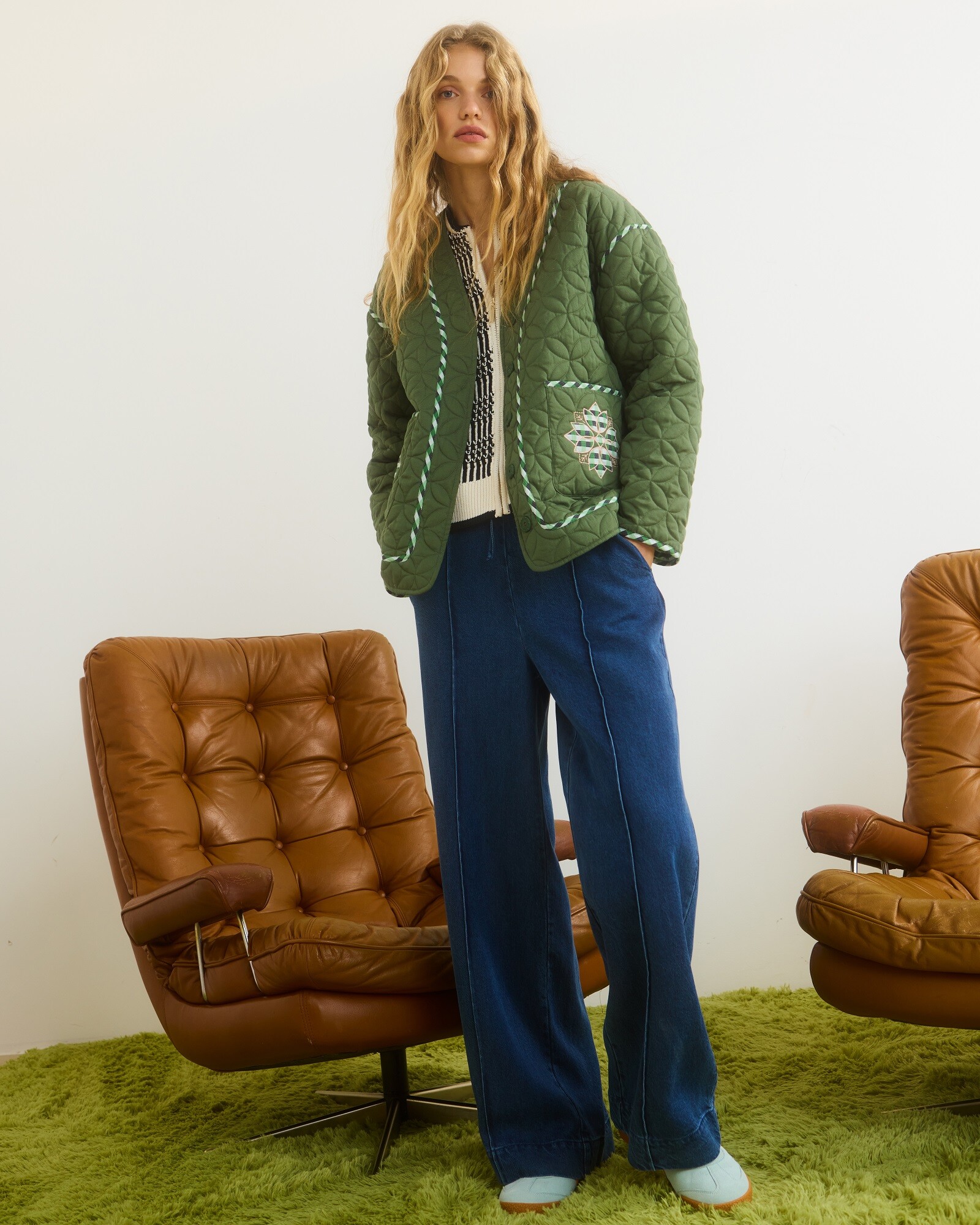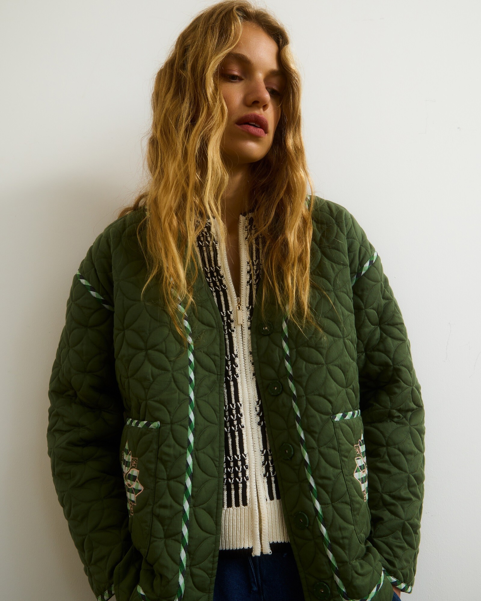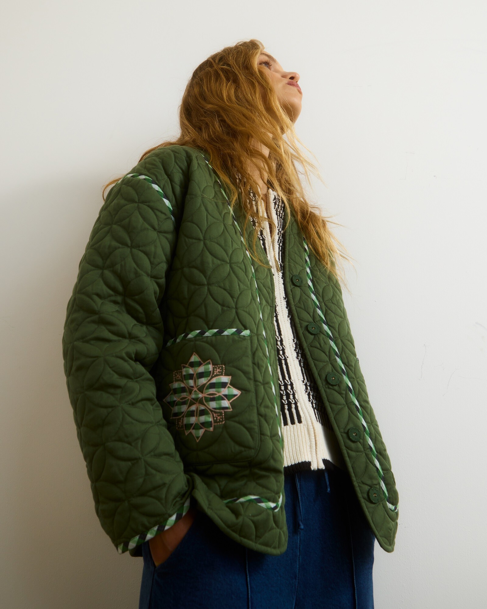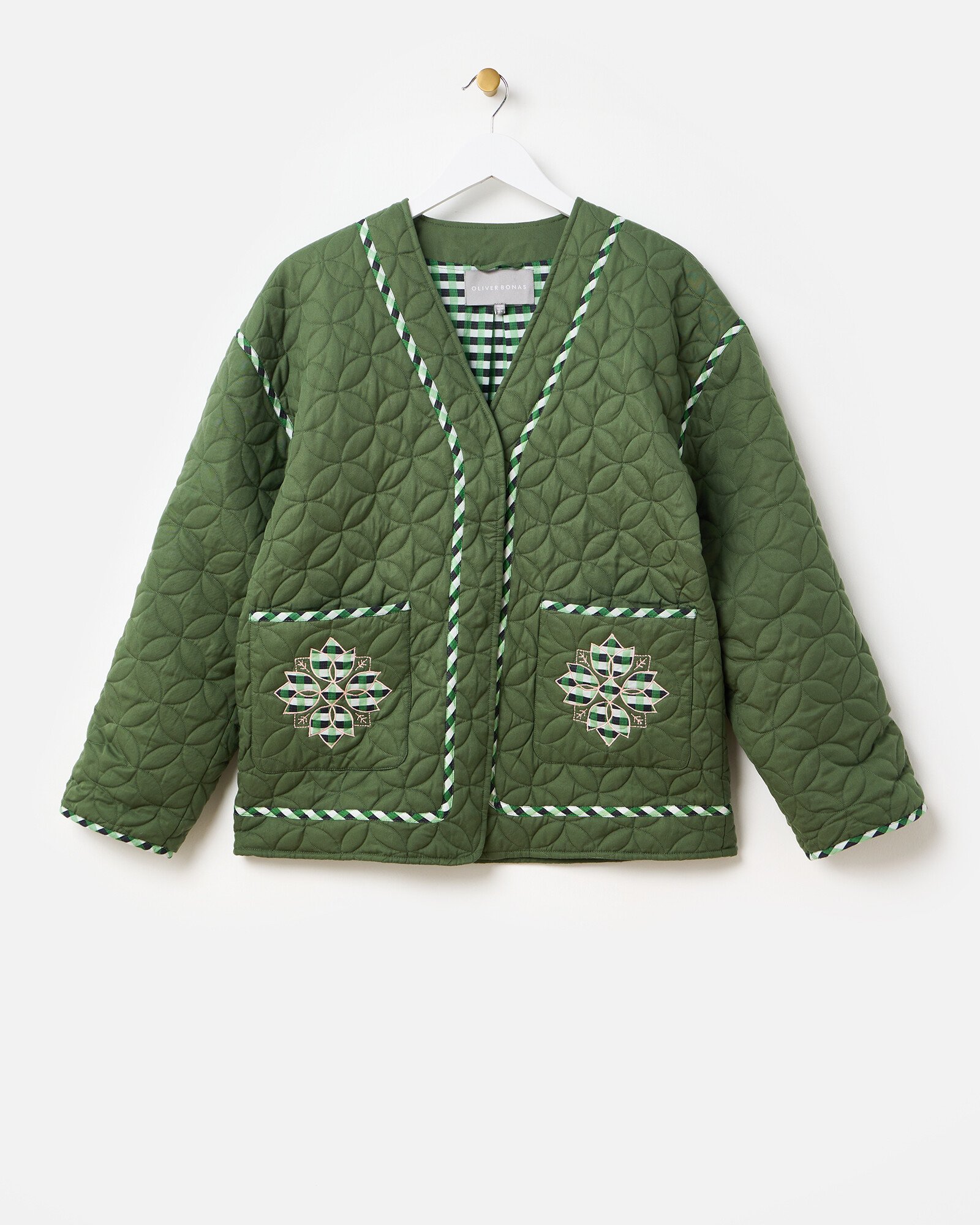 Dark Green Checked Patchwork Quilted Jacket
