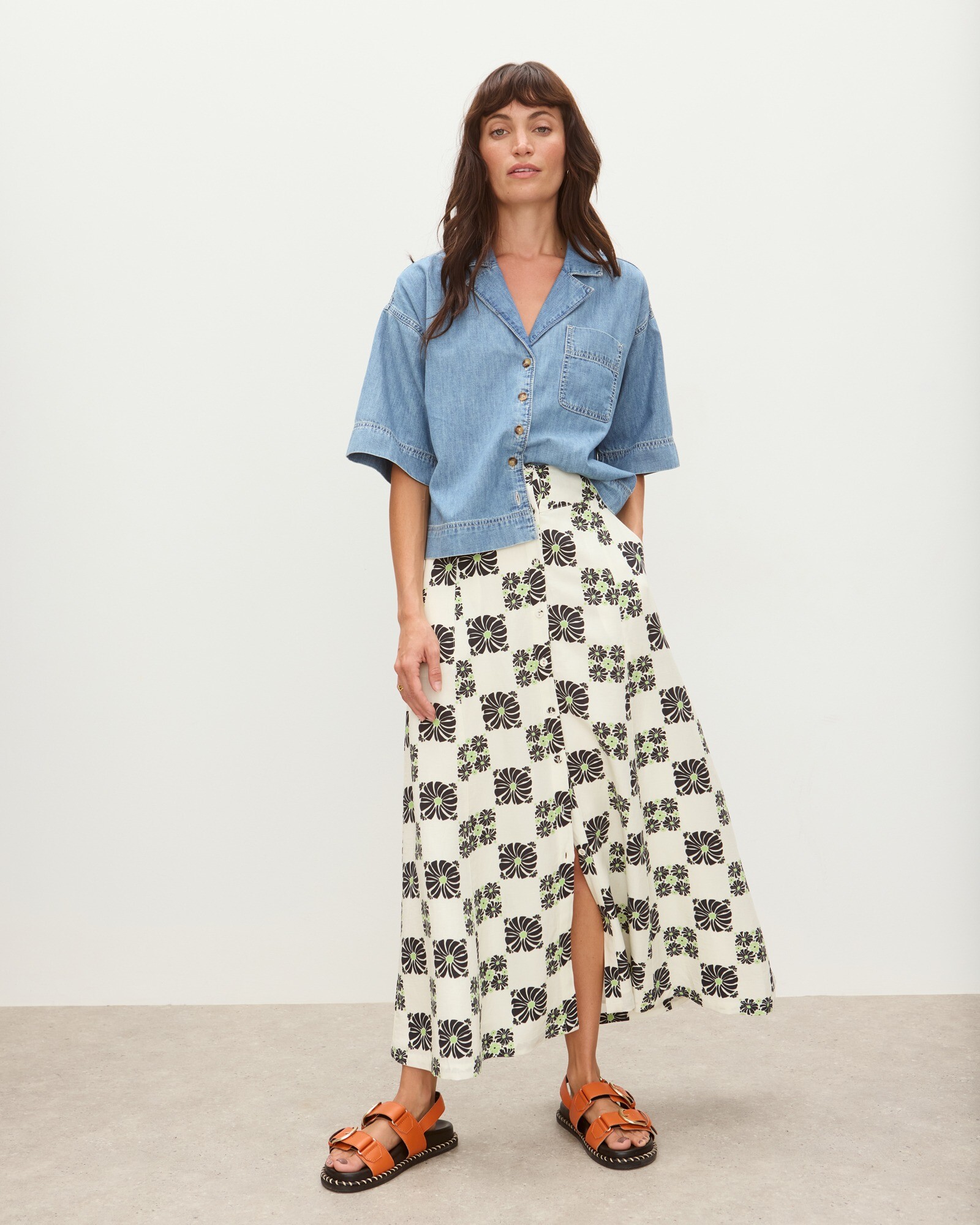 Ecru Cream & Black Floral Tile Print Button Through Midi Skirt