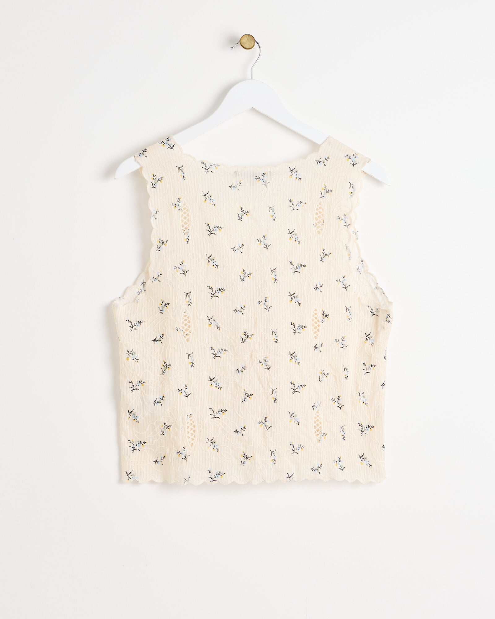 Cream waistcoat top with an embroidered floral pattern, scalloped trim and tie fastening.