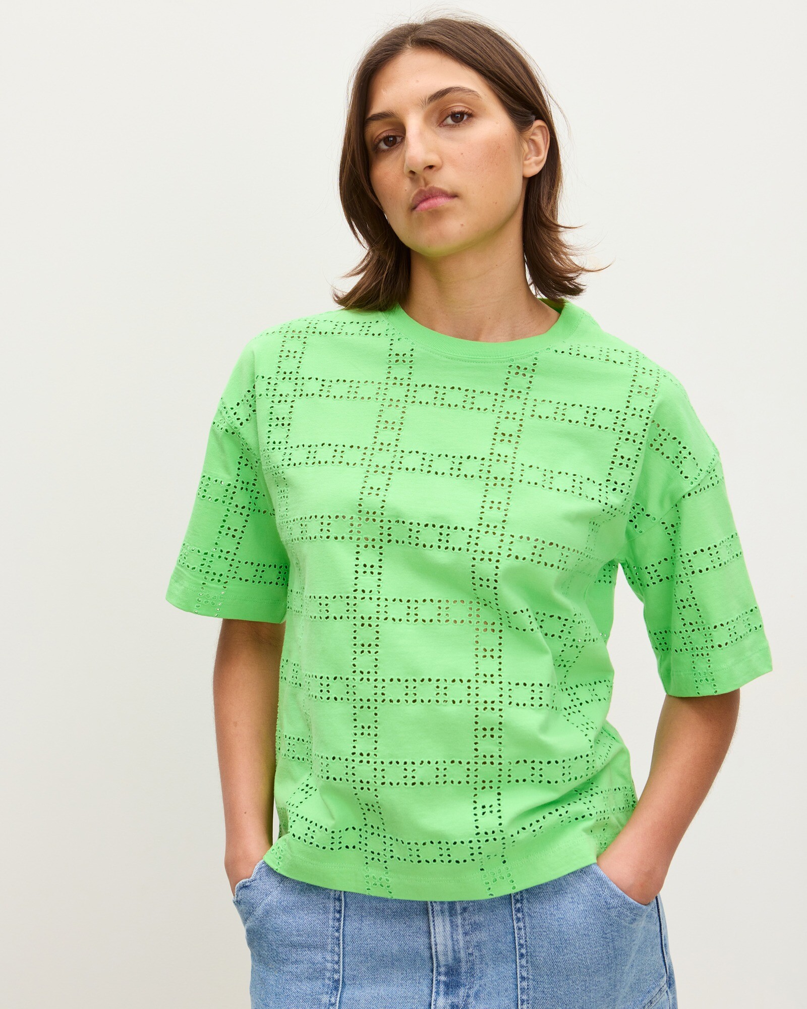 In a boxy, relaxed fit with a crew neckline and short sleeves, our lime green T-shirt features cut-out broderie detailing in a chequerboard design. Made from 100% cotton for a soft, breathable feel, it's an easy, casual piece that adds a mood-boosting zestiness to your summer wardrobe.