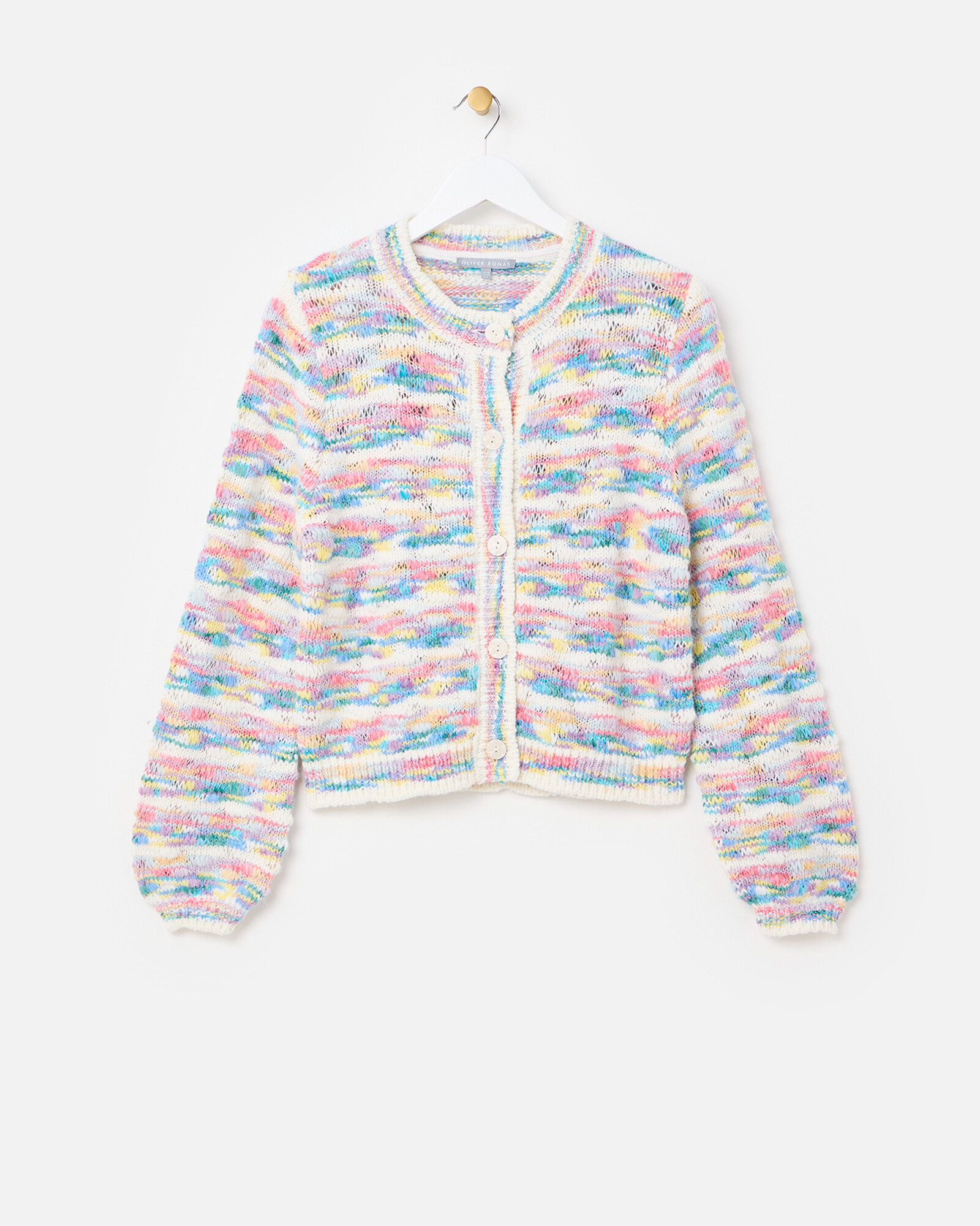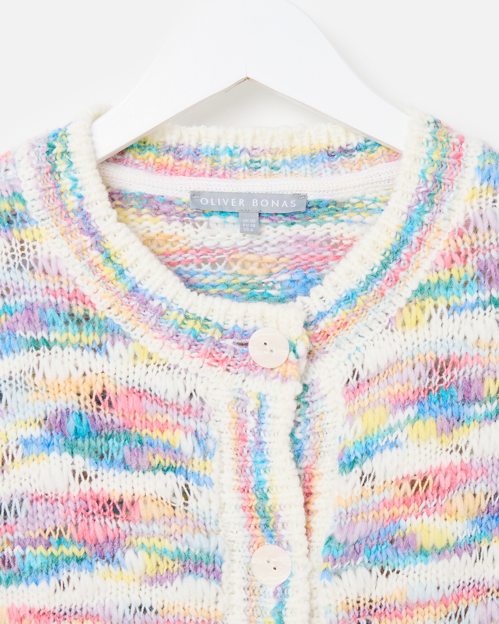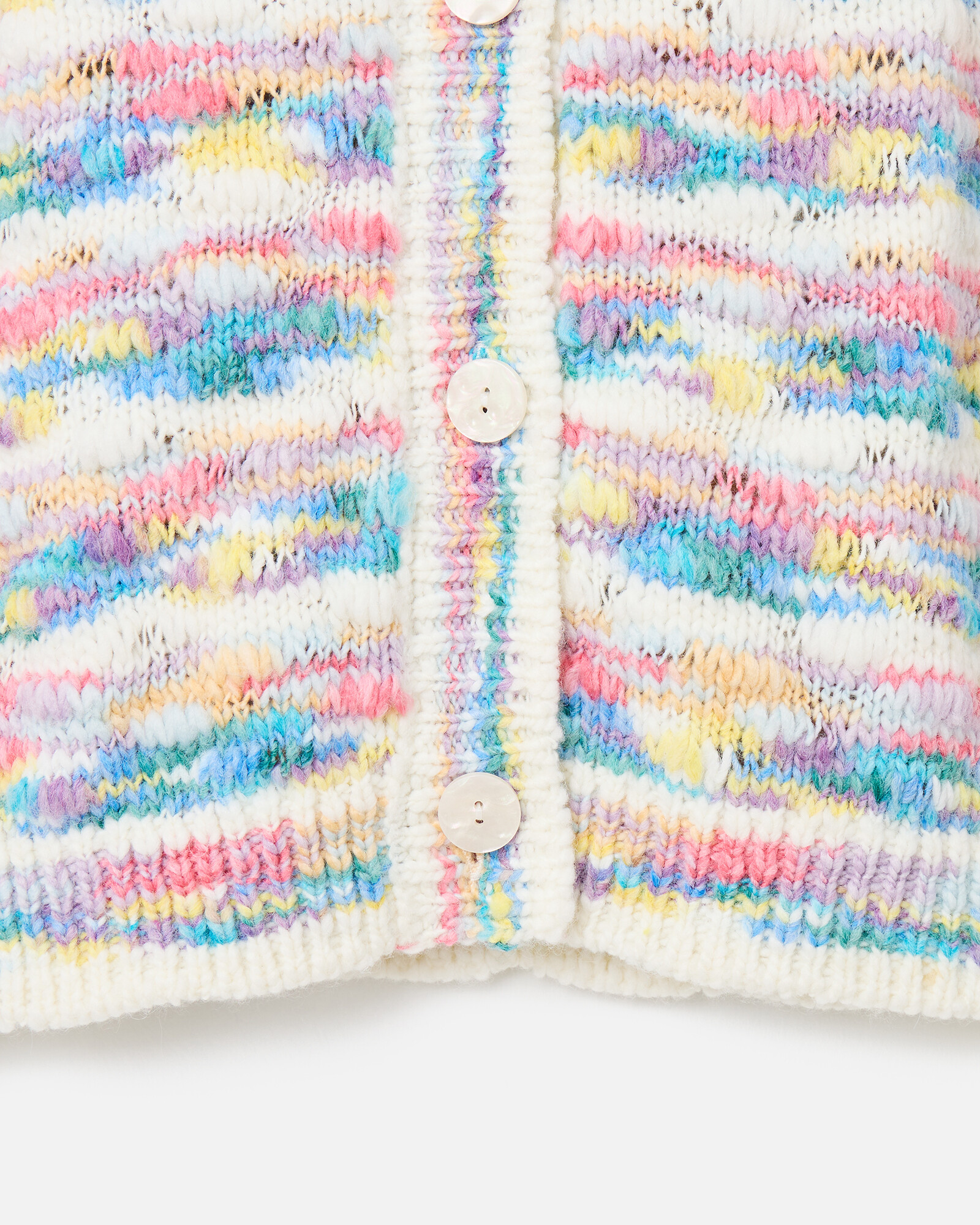 White textured cardigan knitted in a pastel abstract striped pattern with a crew neckline and white buttons down the front in a pearlescent finish.