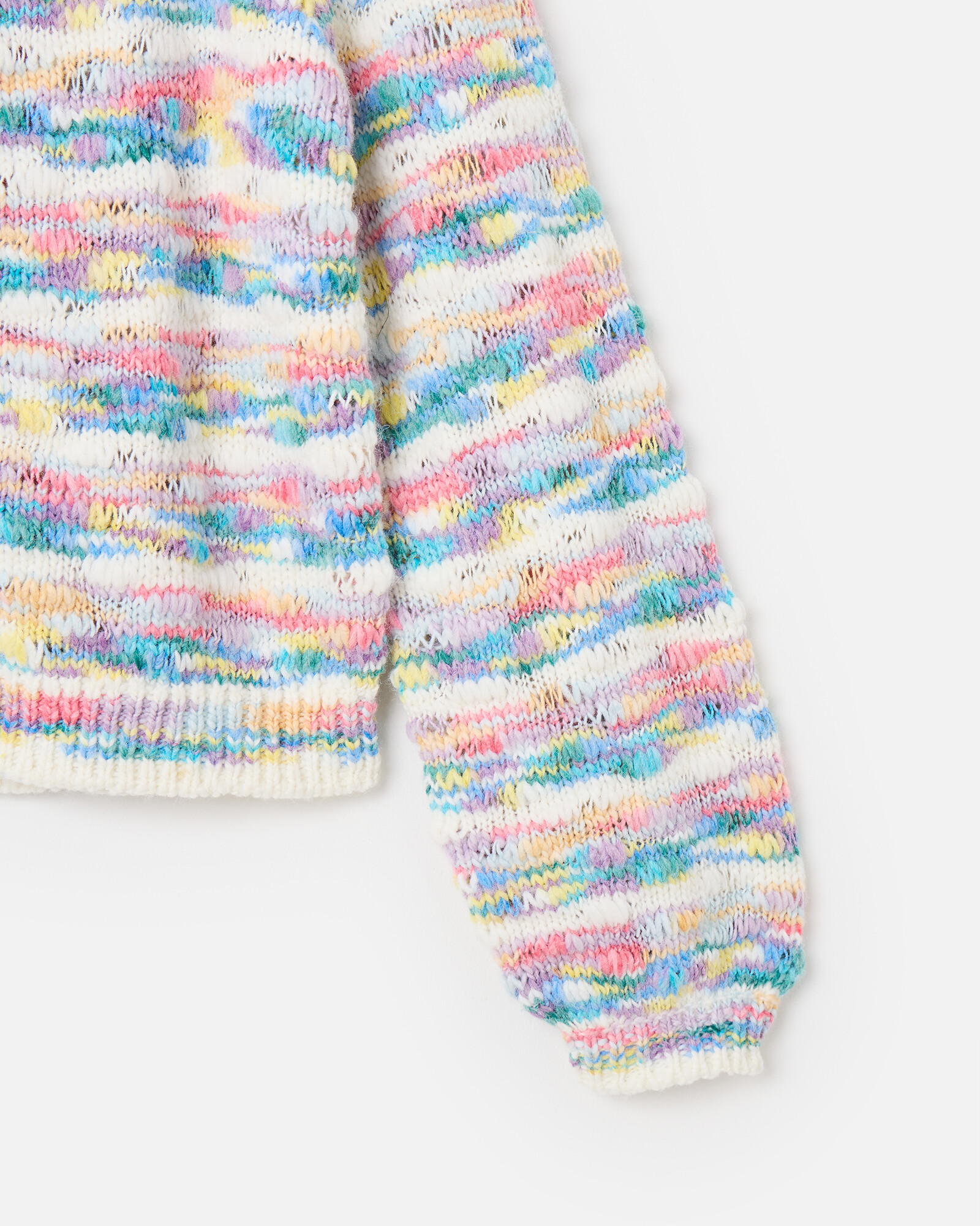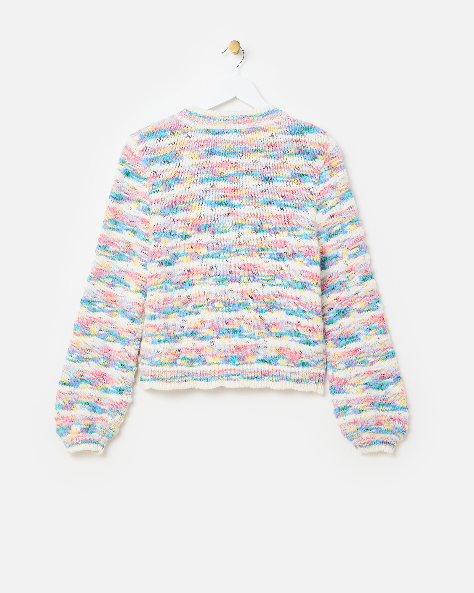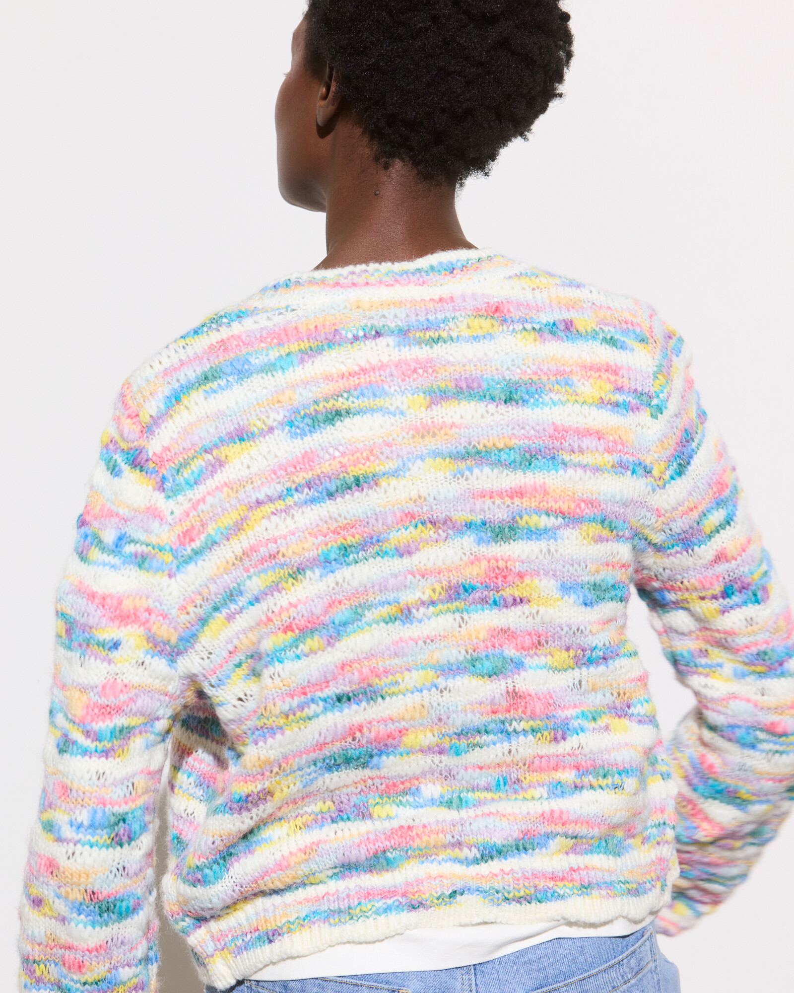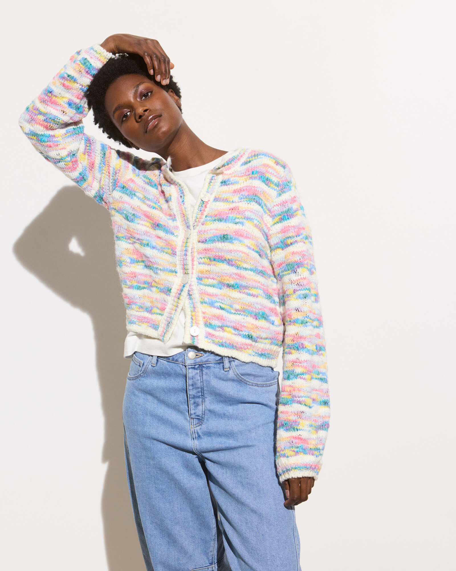 White textured cardigan knitted in a pastel abstract striped pattern with a crew neckline and white buttons down the front in a pearlescent finish.