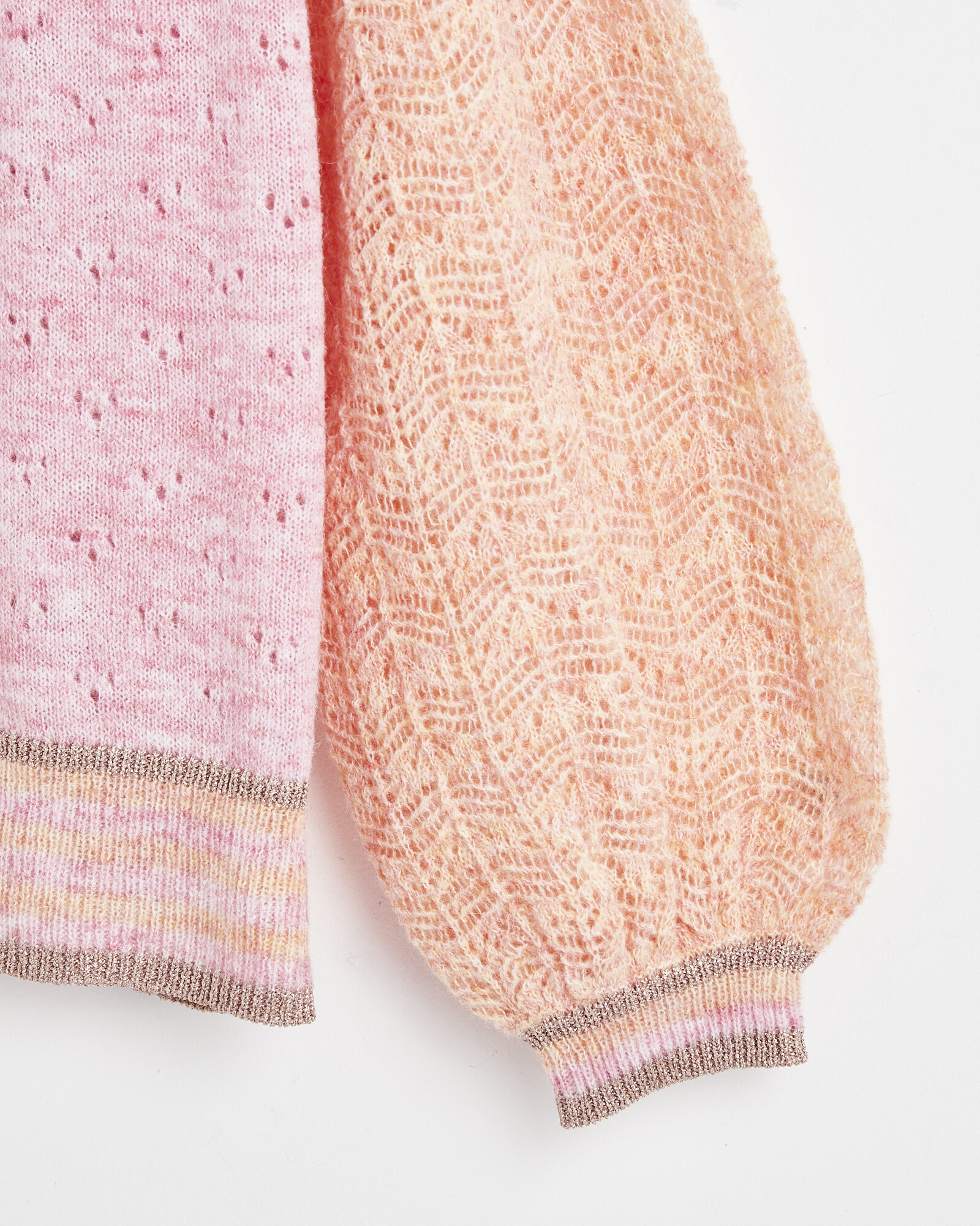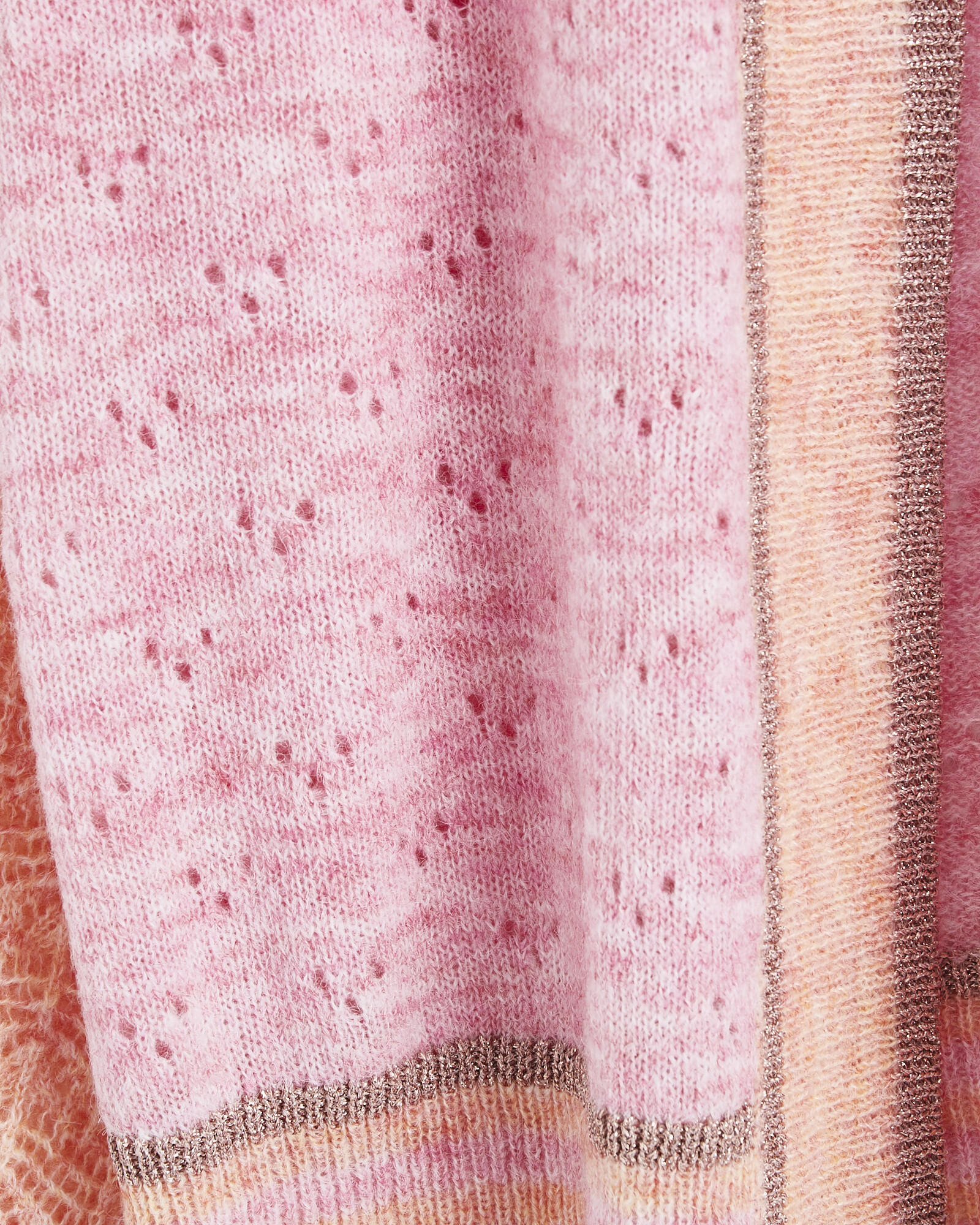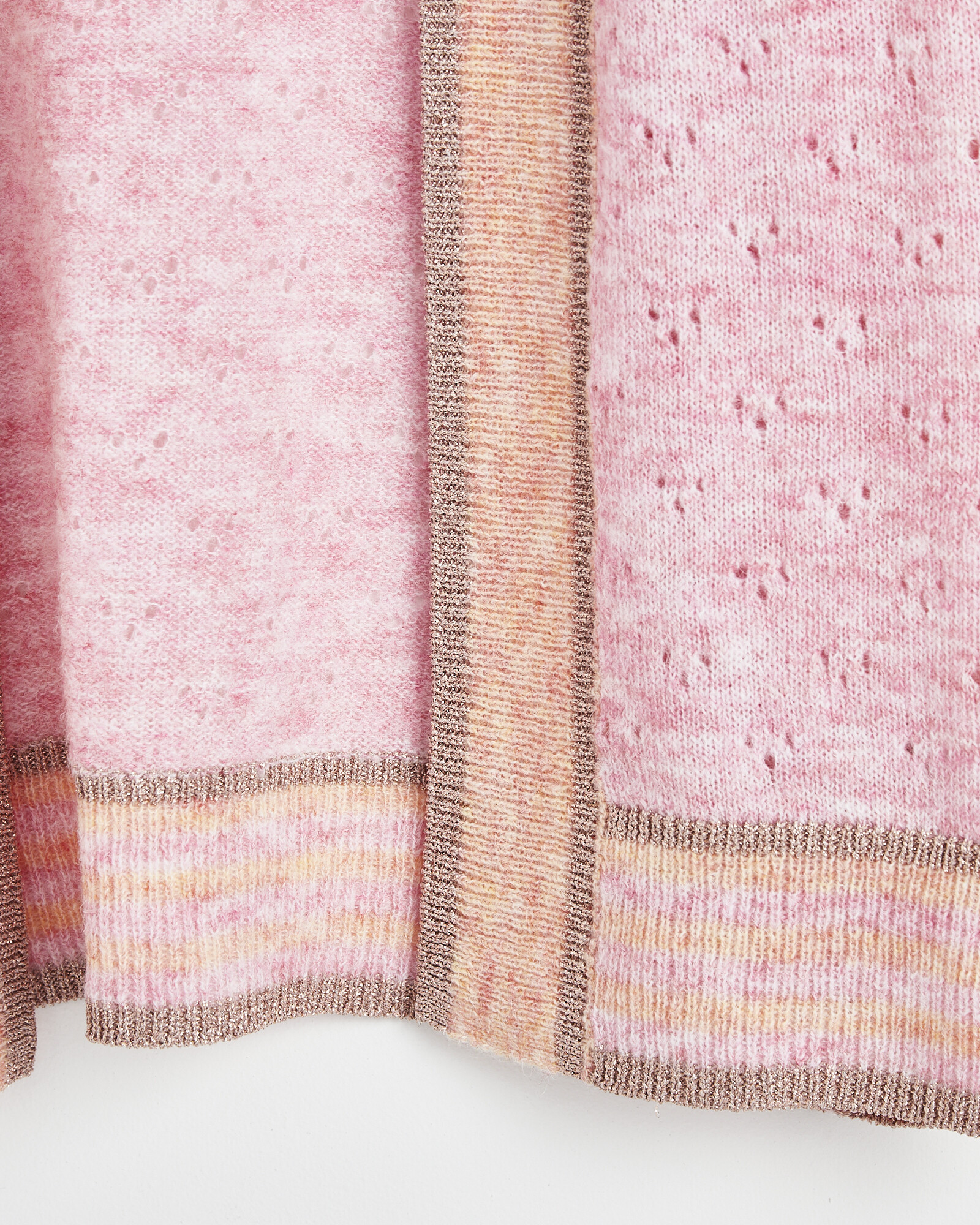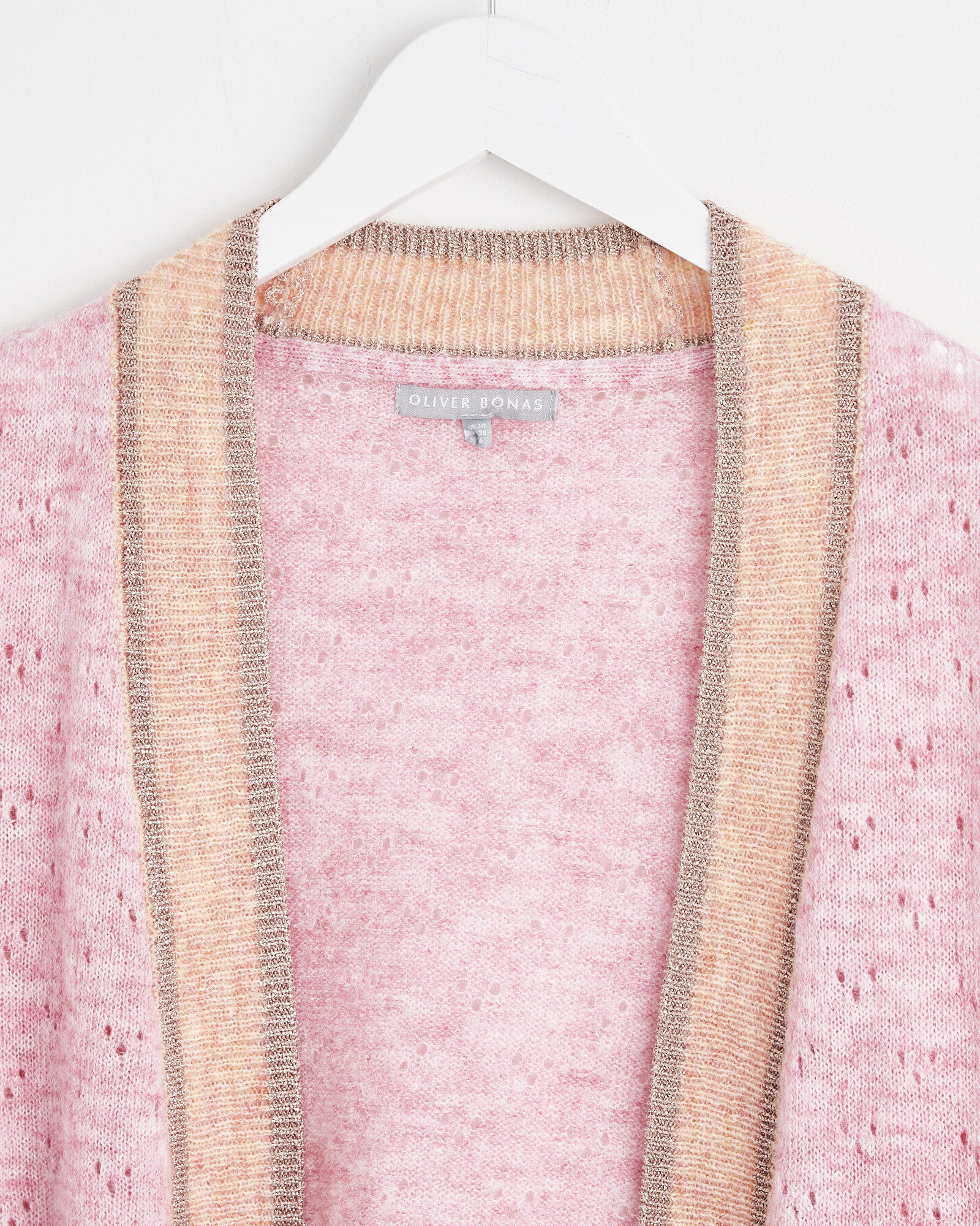 Add a springtime touch to your outfit with this knitted cardigan. Pairing shades of pink and orange, it features intricate lacework on the sleeves and a ribbed cuff for a voluminous look. A gold toned stripe sits at the trim for a metallic touch, and the open fit lends itself to seasonal dressing.