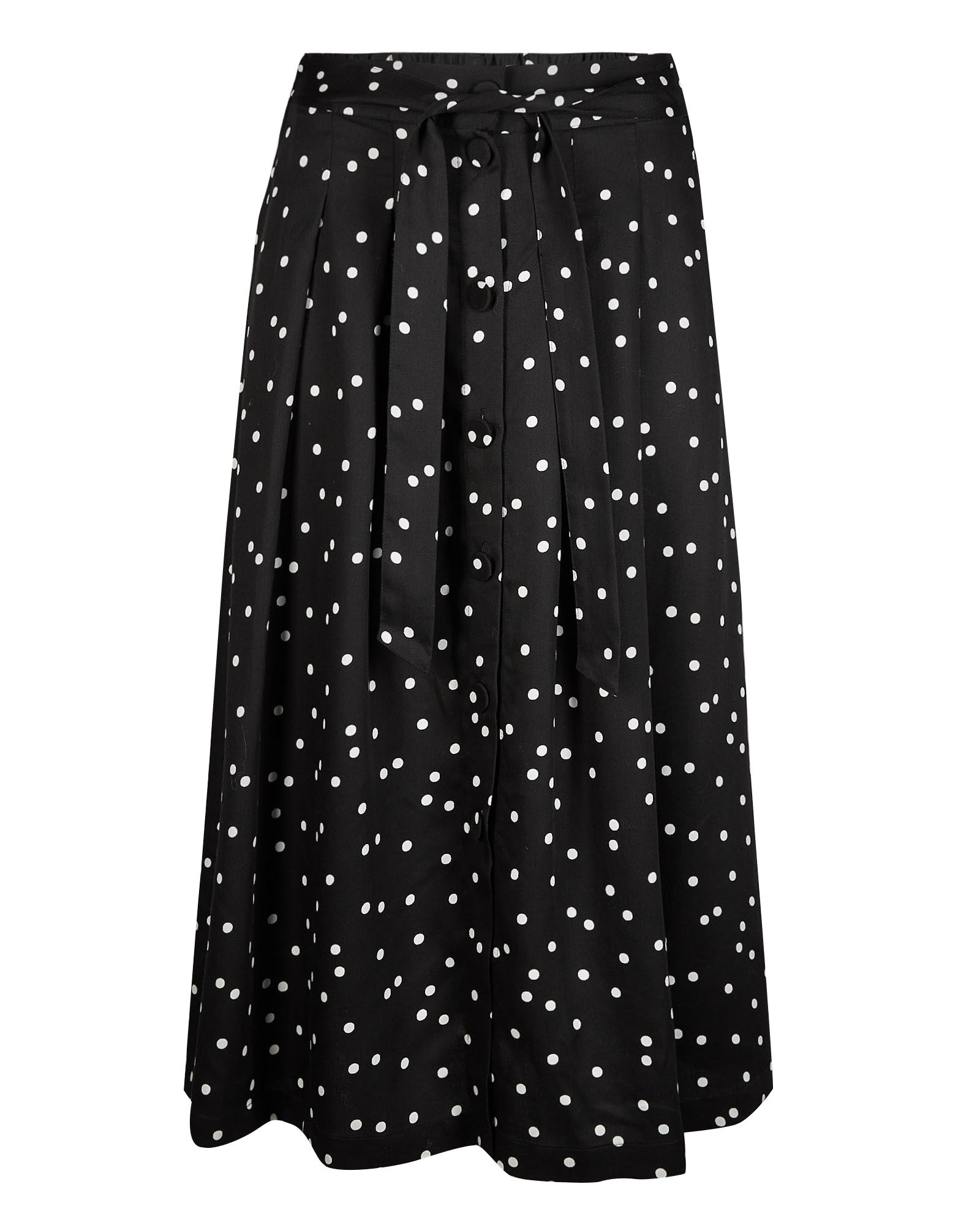 Sitting below the knee, this black midi skirt is an A-line cut and features an all-over white polka dot print, completed with a button front and a flattering tie at the waist.