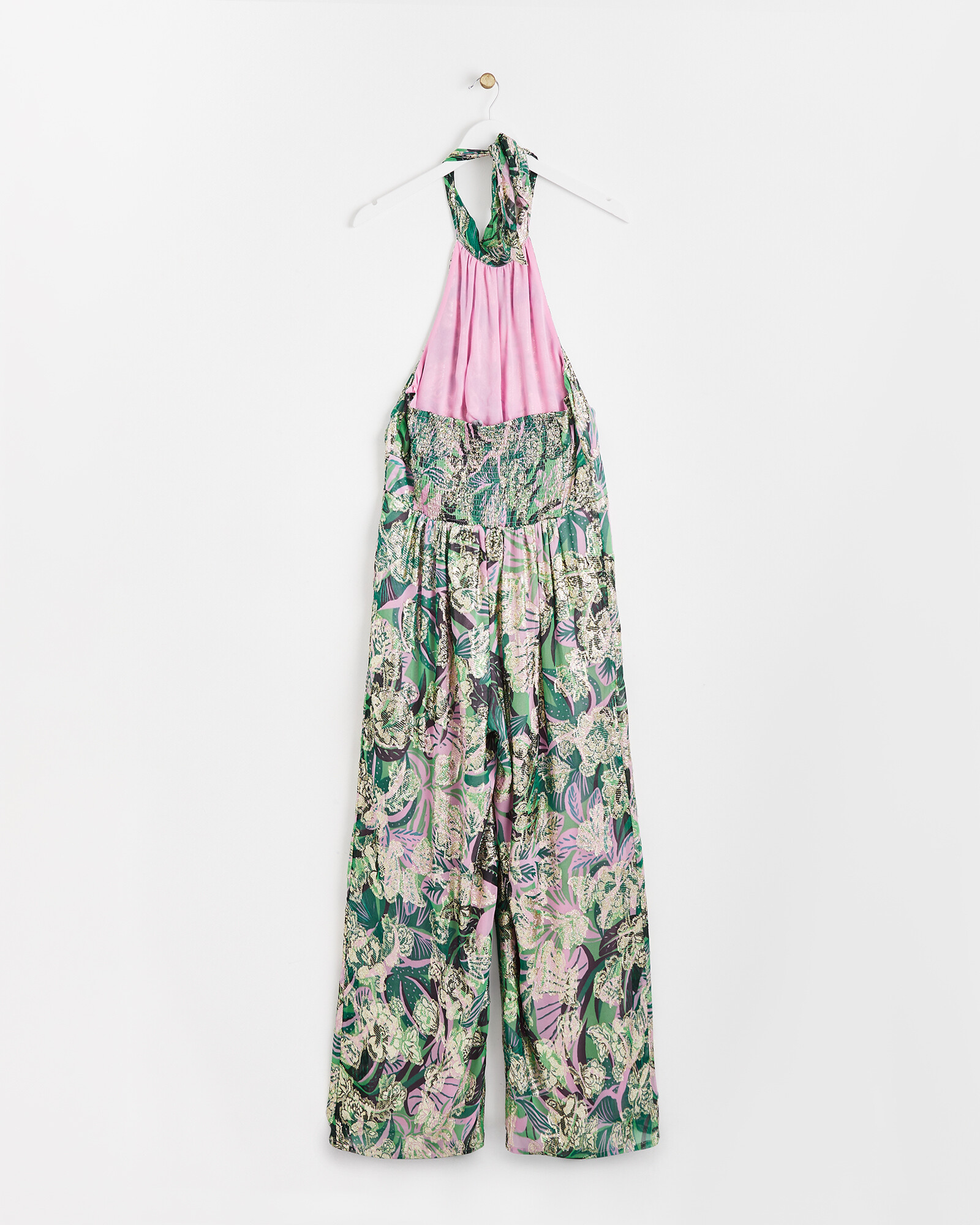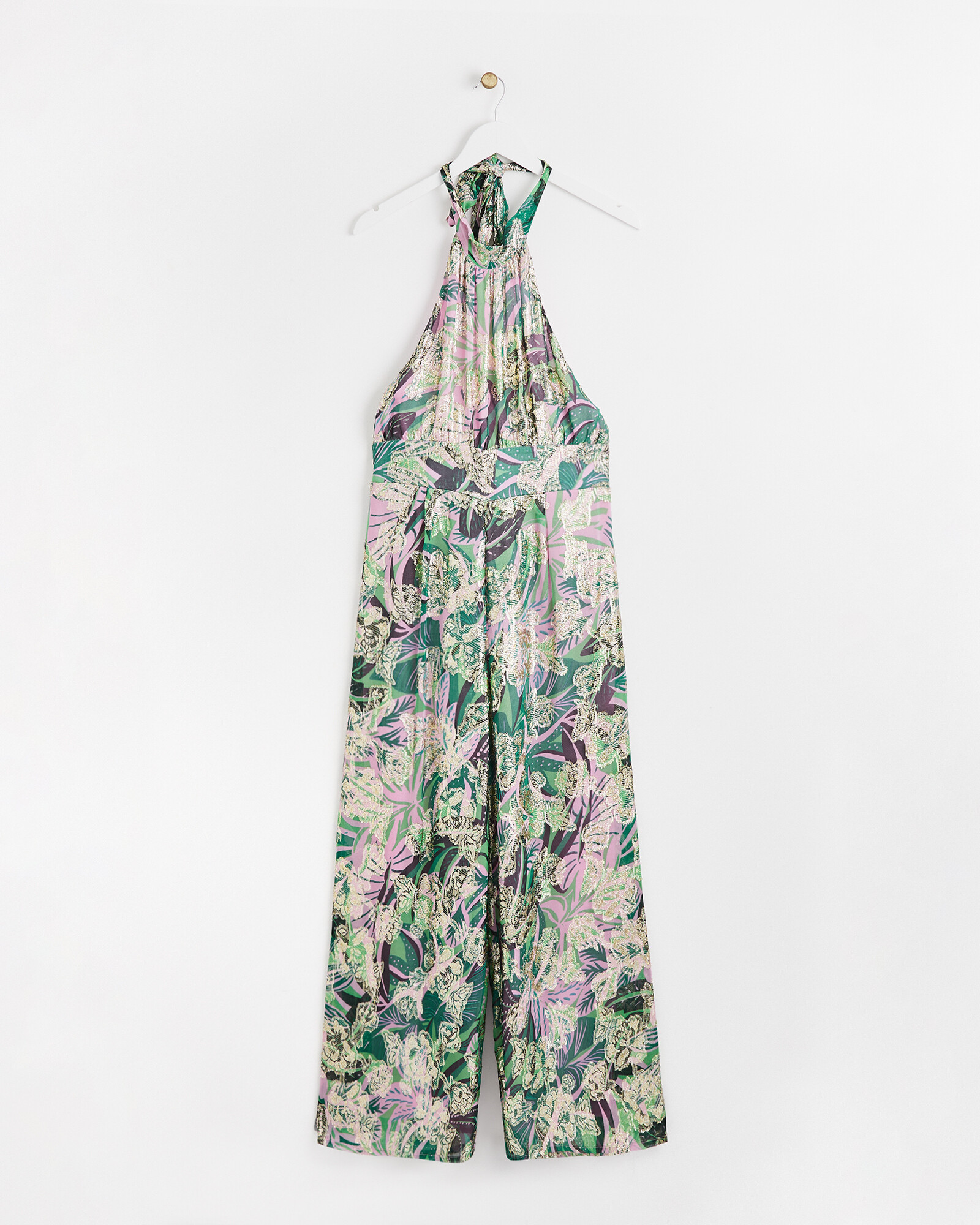Tropical Floral Metallic Green Jacquard Jumpsuit
