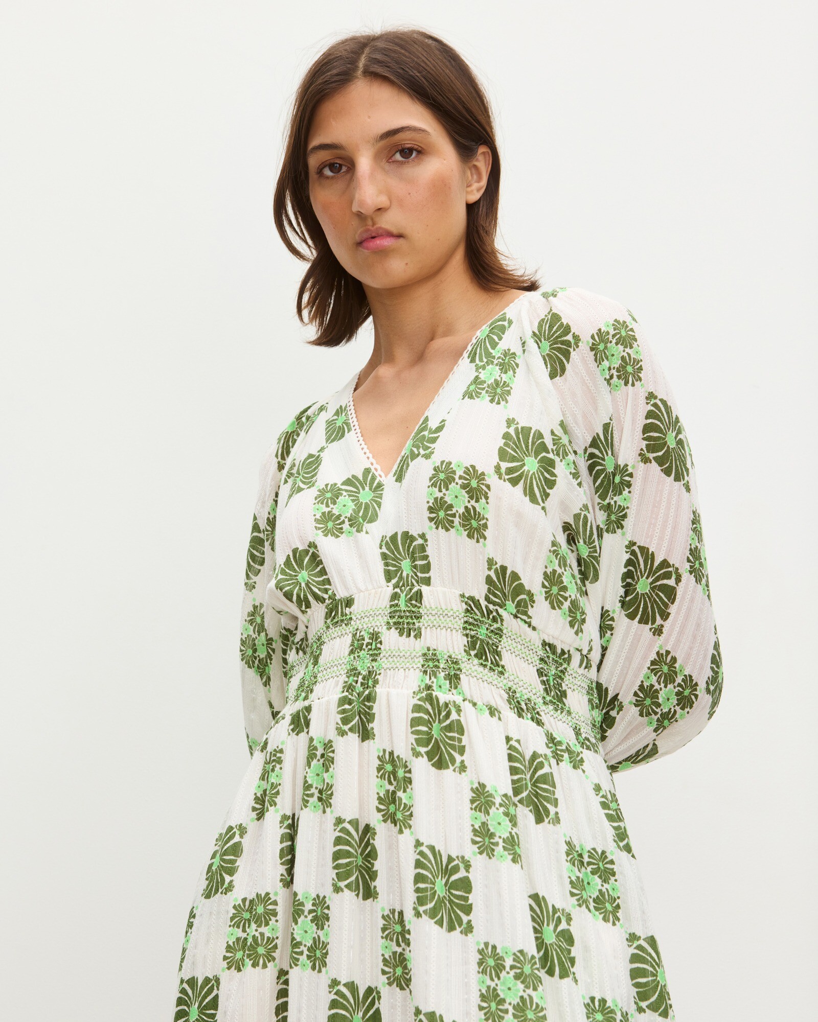 White & Green Floral Tile Print V-Neck Tiered Midi Dress
