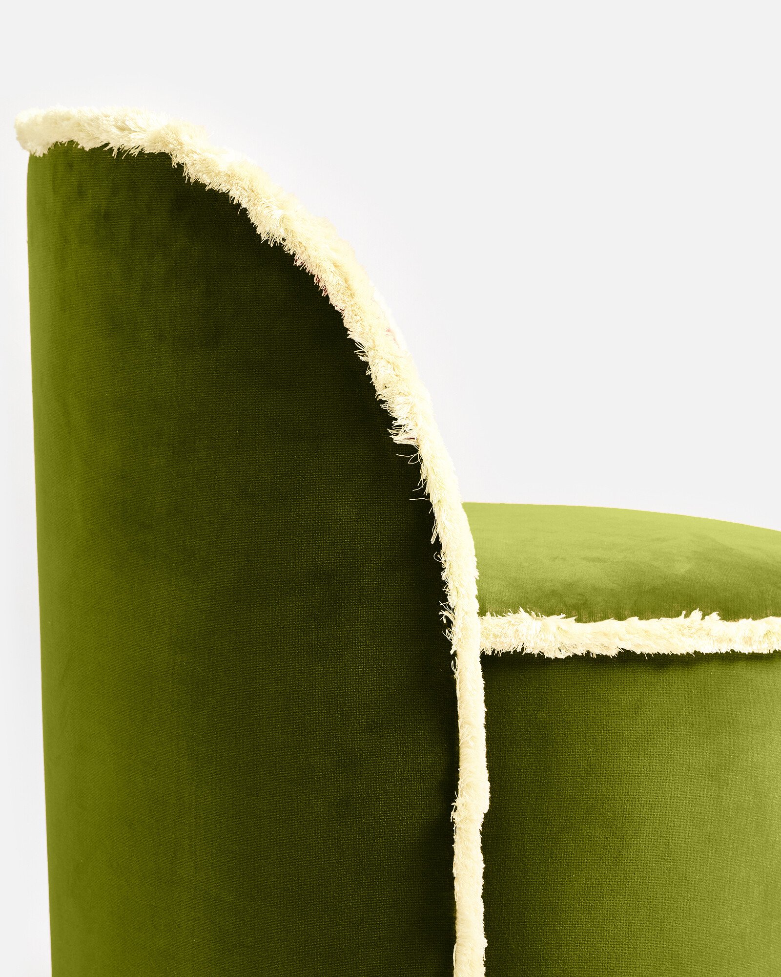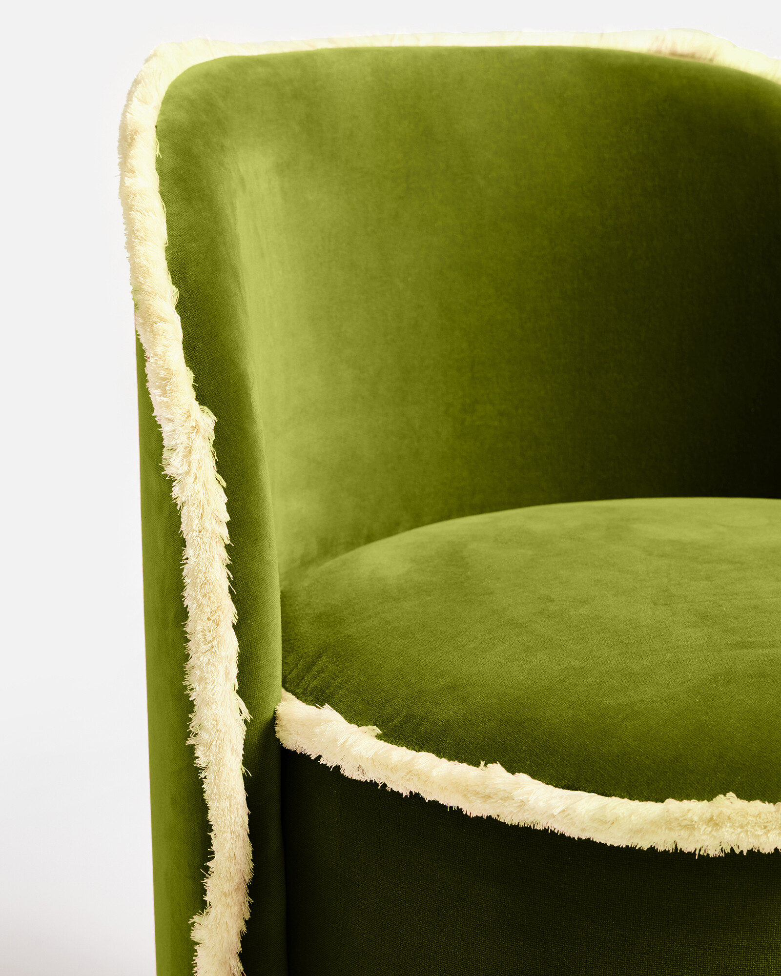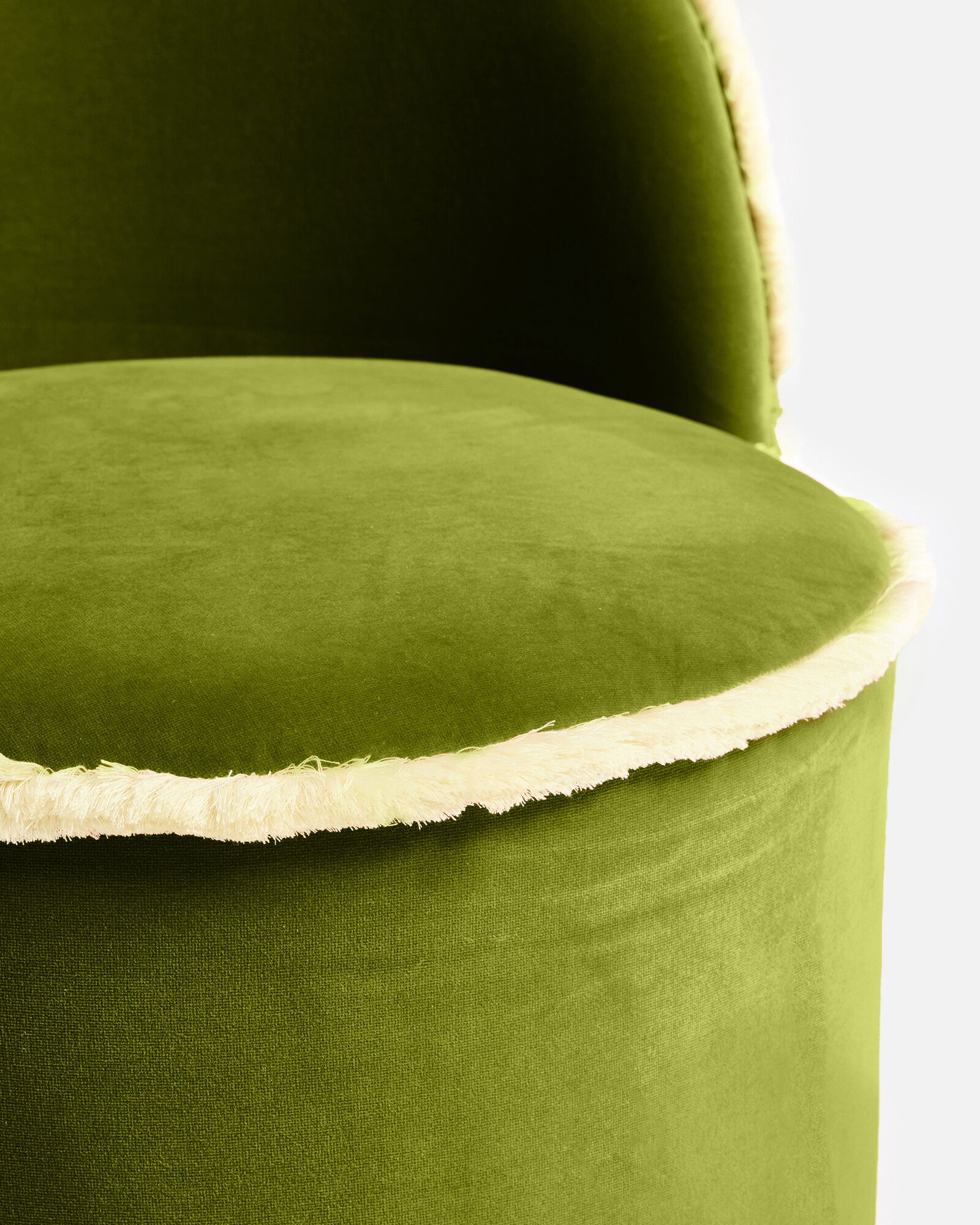 This low, rounded dressing table chair is made from a soft green velvet, with a cream ruffle trim along the back and around the seat. Featuring four low wooden feet, a smooth, curving back panel and a plush, round seat, this tub chair adds a stylish statement to your bedroom or living space, and a warm colour finish. Style alongside other homeware and textiles from our bestselling Issey range for cohesive home decor.