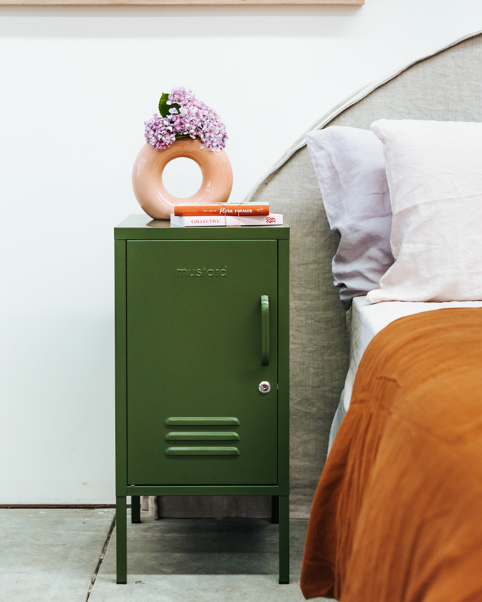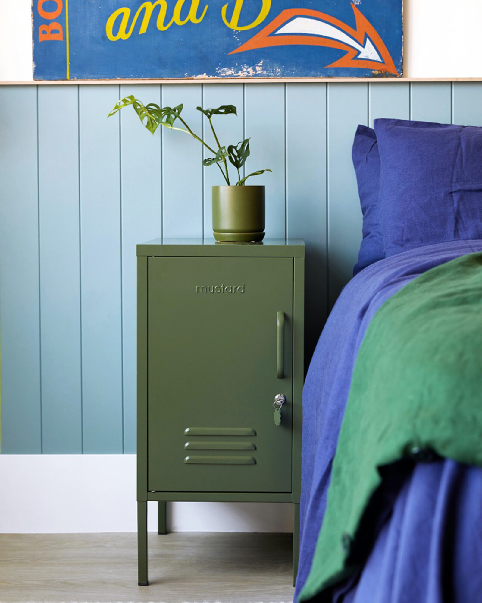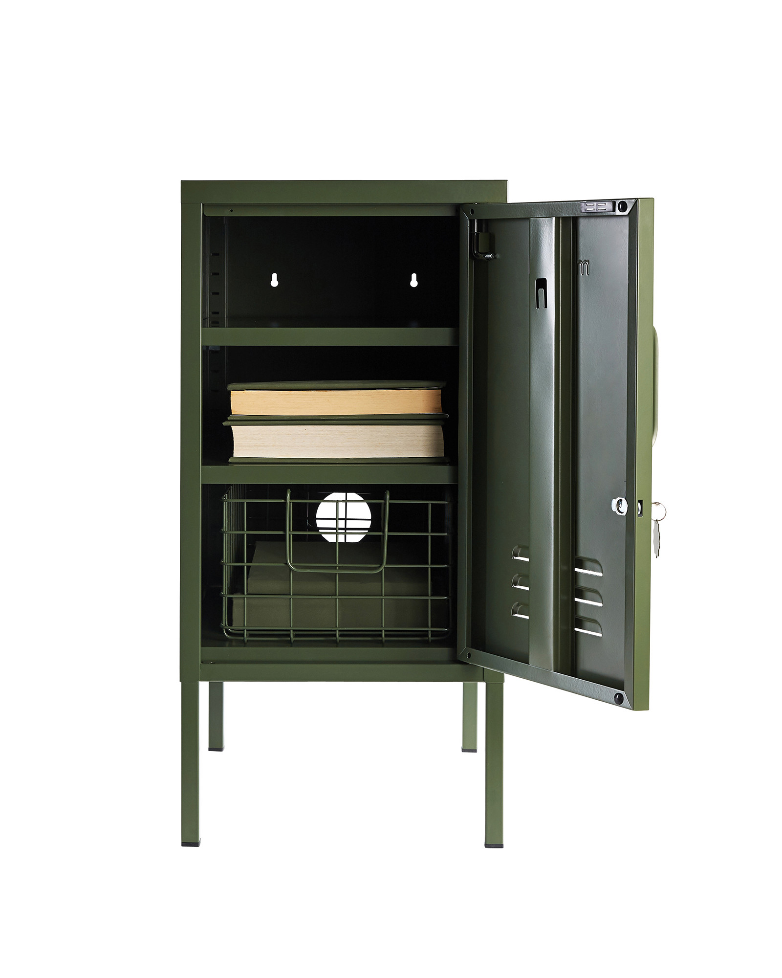Bring an urban industrial vibe to your living space with the Mustard Olive Green Skinny Locker, a storage solution with a difference. Made from steel, this locker has two adjustable shelves, one hook and a cable hole on the inside, providing efficient but eye-catching storage space for magazines, accessories, books and much more. Ideal for slim spaces or city living, this locker can be used as a bedside table or handy side table.