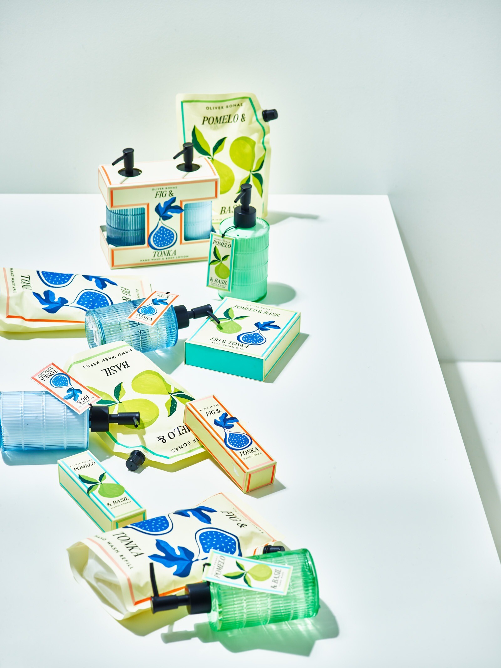 Hand wash and moisturiser gift set scented with sweet fragrance notes of Fig, Tonka Bean and Vanilla, packaged together in luxurious reusable blue glass bottles with matte black pumps. This pair of hand soap dispensers are perfect for gifting as a housewarming gift, or for adding a pop of colour to your bathroom and kitchen sinks.