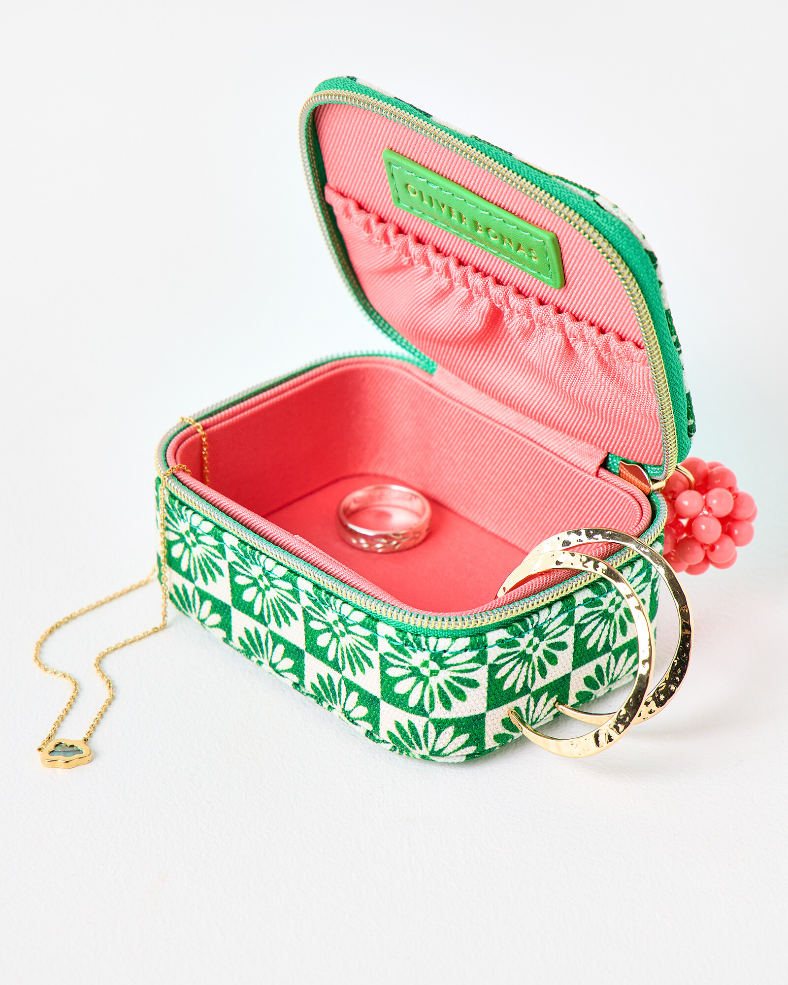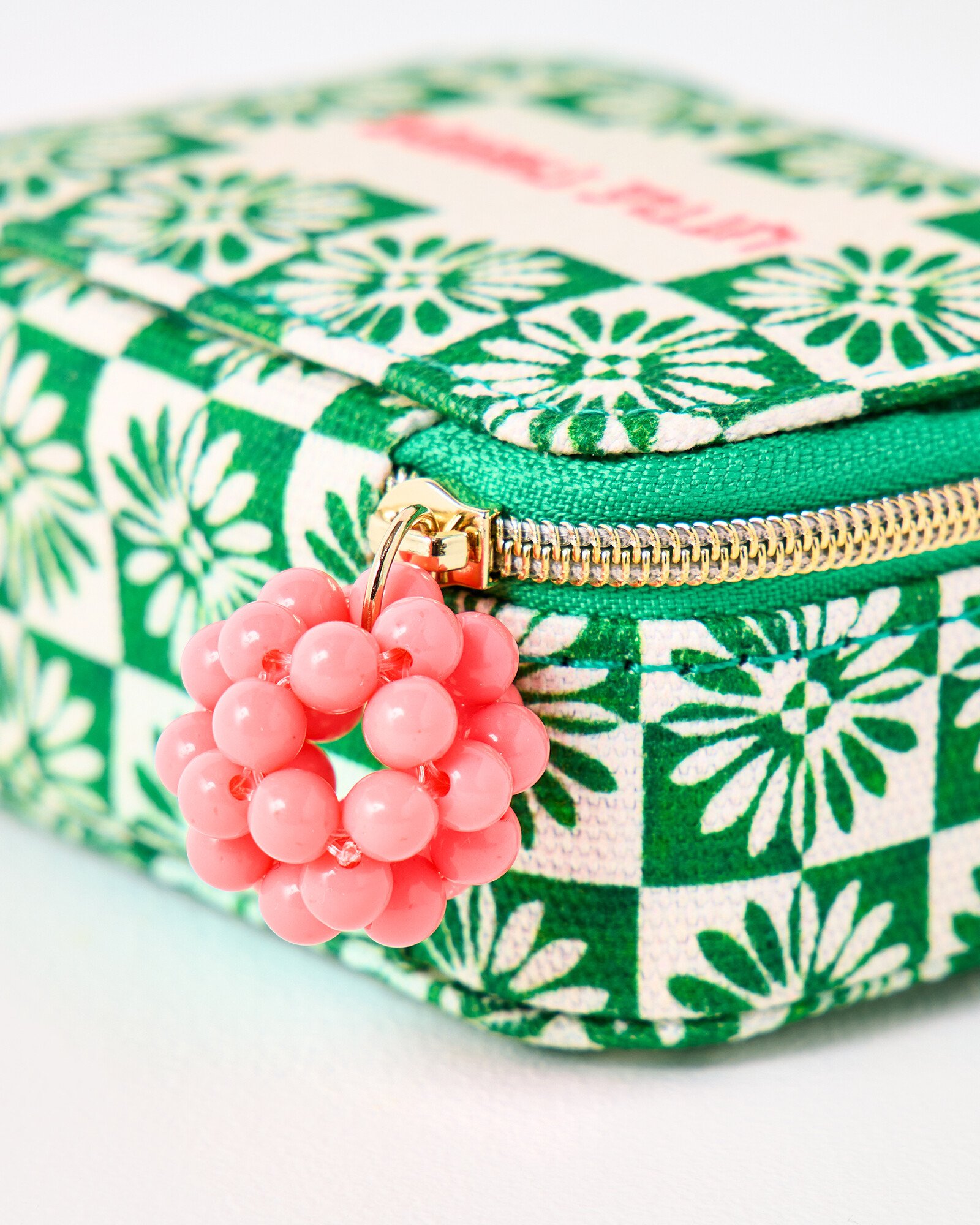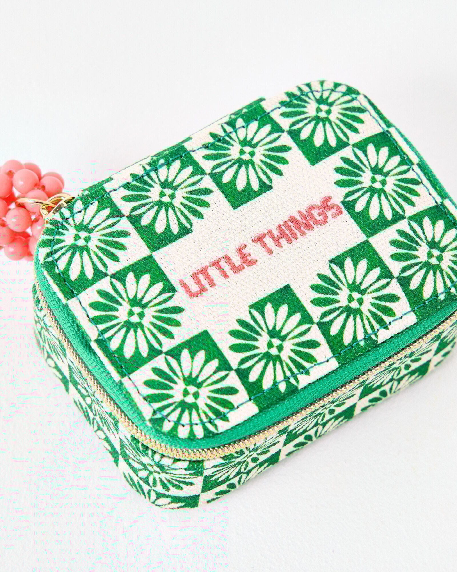 Small rectangular travel jewellery box in a green and white floral chequerboard pattern, and 'Little Things' embroidered in pink across the top. Lined in a pink fabric, this compact jewellery box features one main compartment and a small elasticated pouch behind the lid, to store your jewellery essentials whilst on the go. Finished with a zip closure and beaded pink toggle.