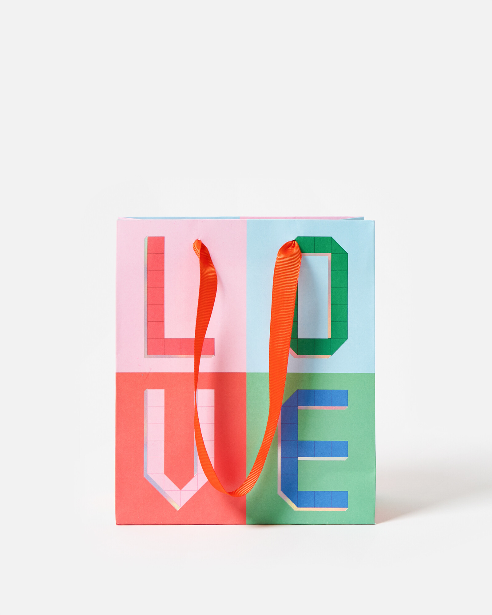 Medium-sized gift bag based on our LOVE patchwork bedspread, with silver foil detailing and red ribbon handles.