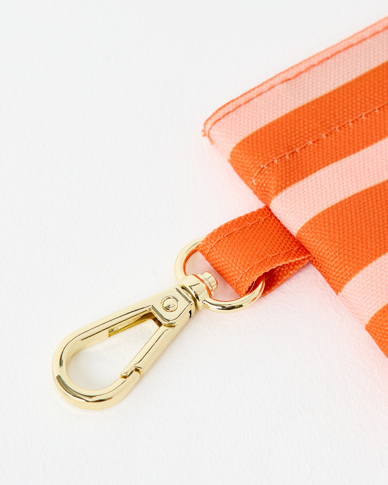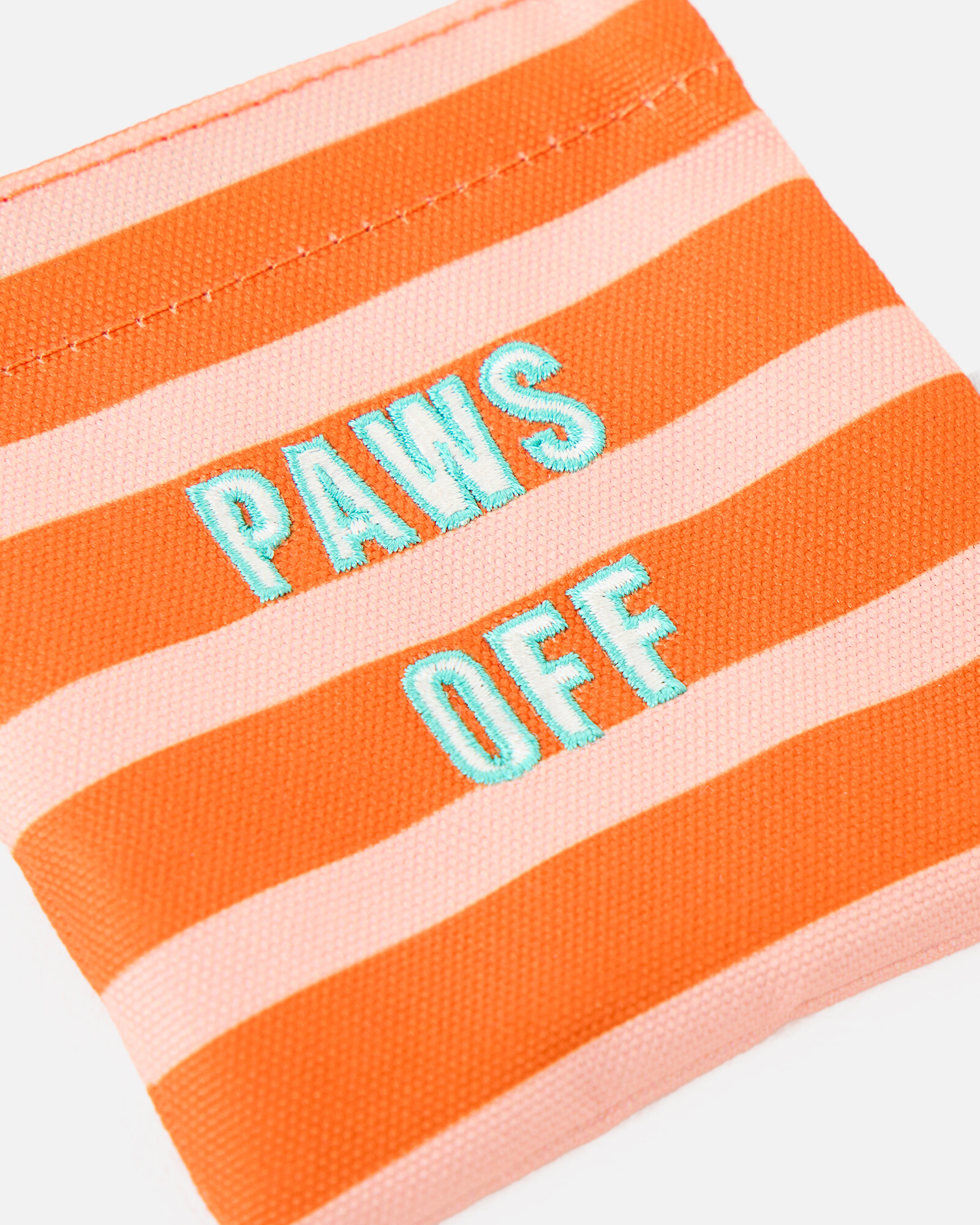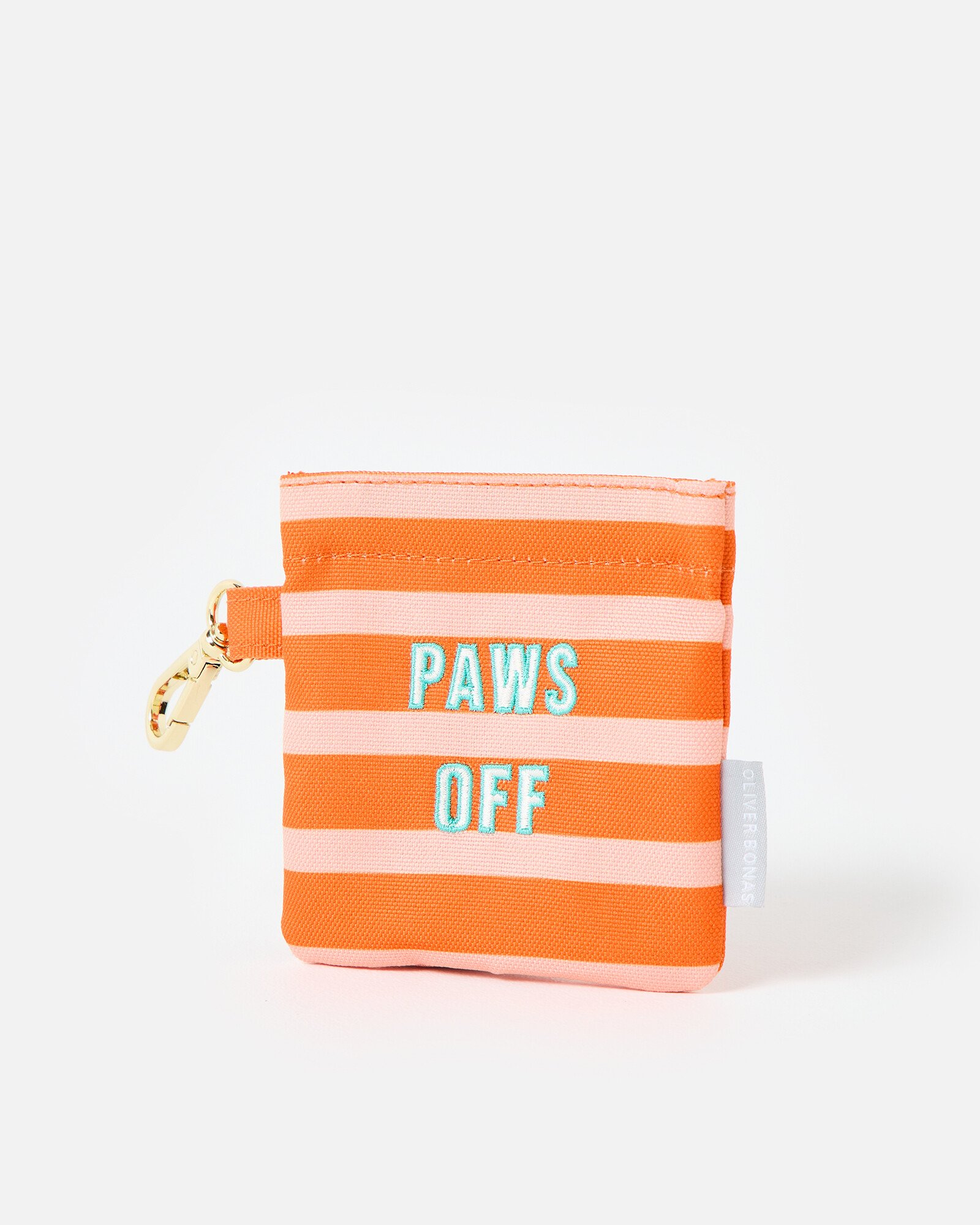 Colourful fabric pet treat bag with a pink and orange stripe pattern, and a written 'Paws Off' motif in white embroidery across the front. Features a golden clip and pop closure, perfect for keeping treats close at hand on walks.