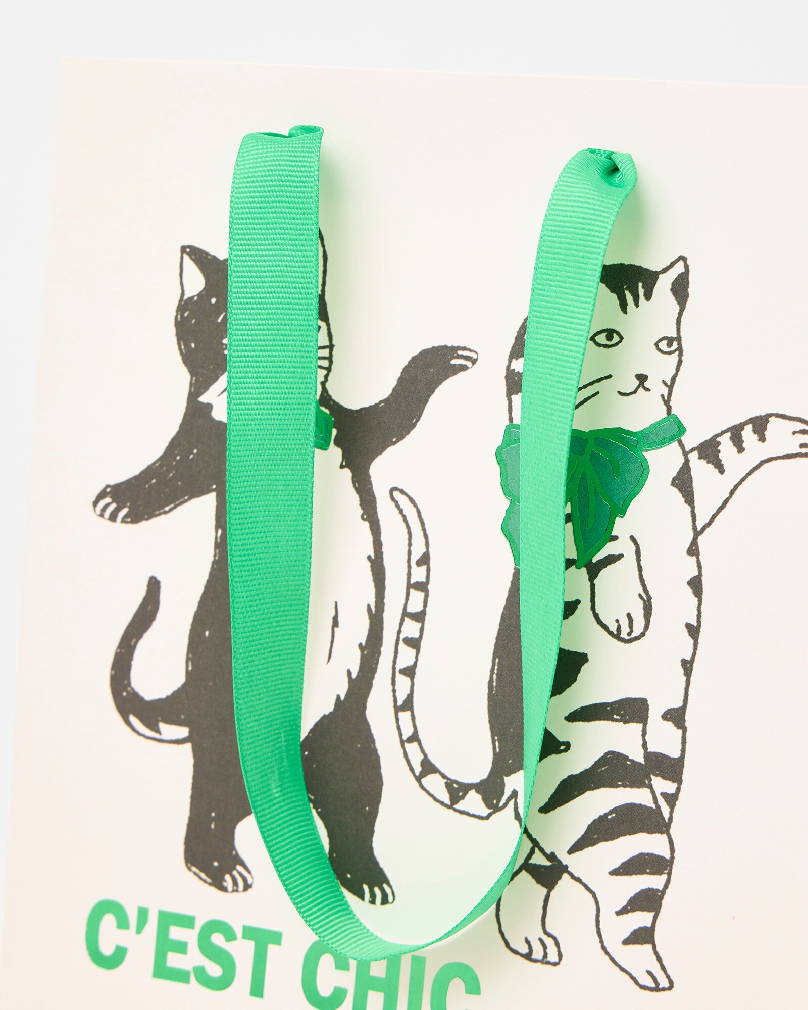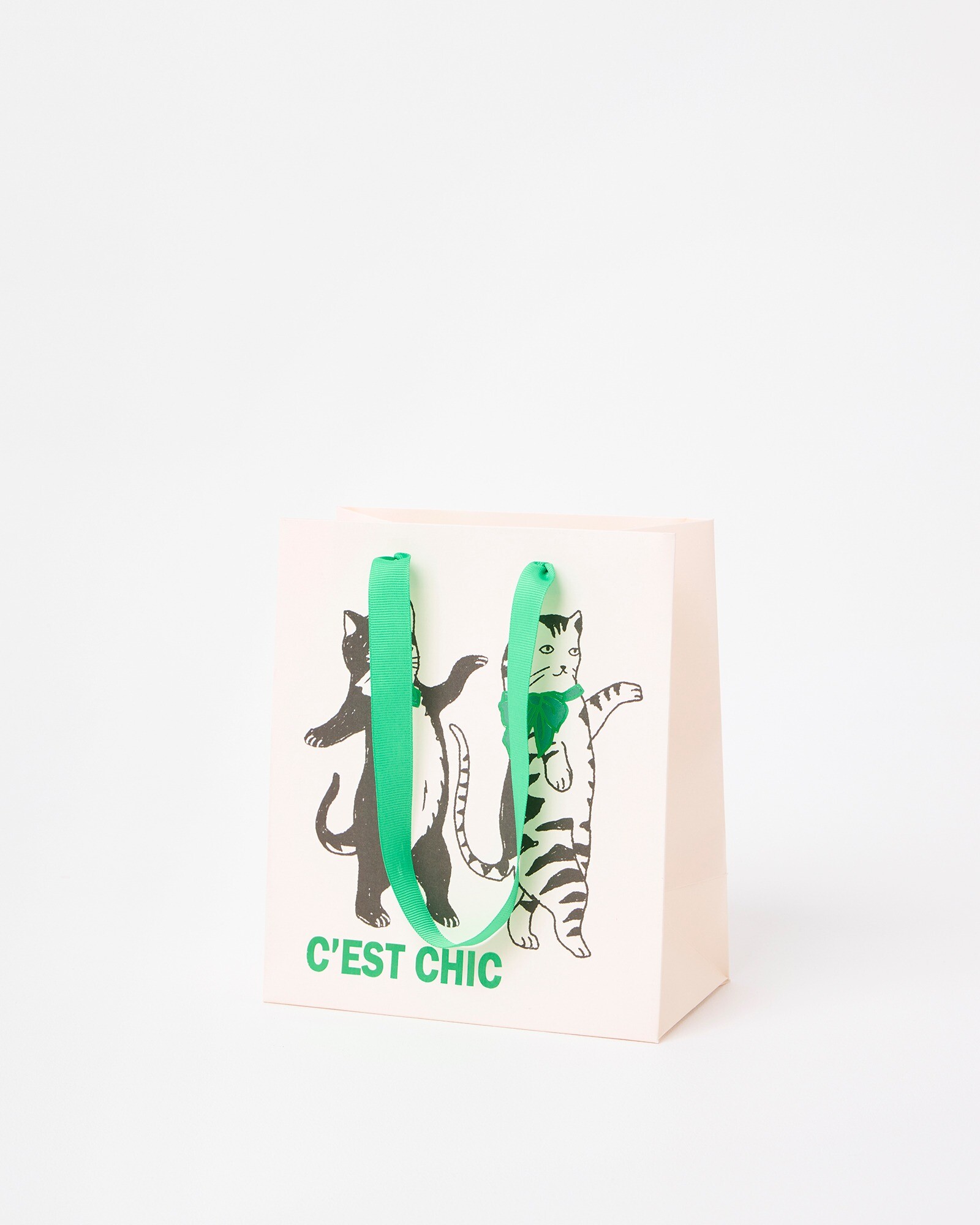 Medium gift bag with a cream background and Pierre the cat illustration with 'C'est Chic' in green lettering, and matching green ribbon handles. Ideal for thoughtful birthday gifts, this medium gift bag would easily carry a card and small plant, bottle of wine or small housewarming gift.
