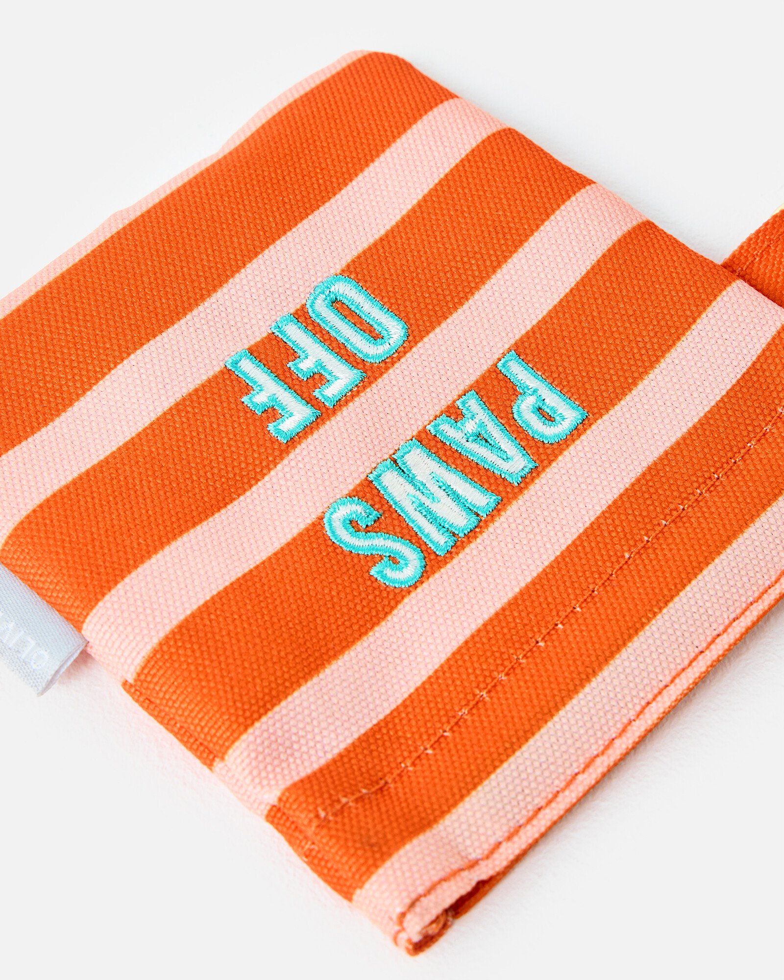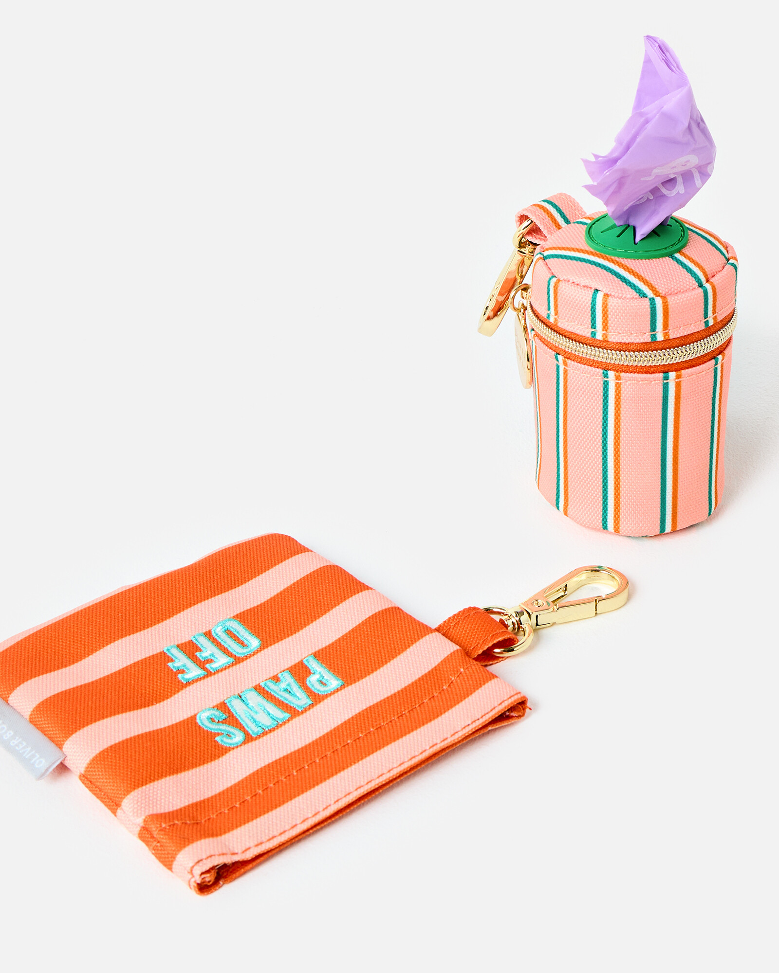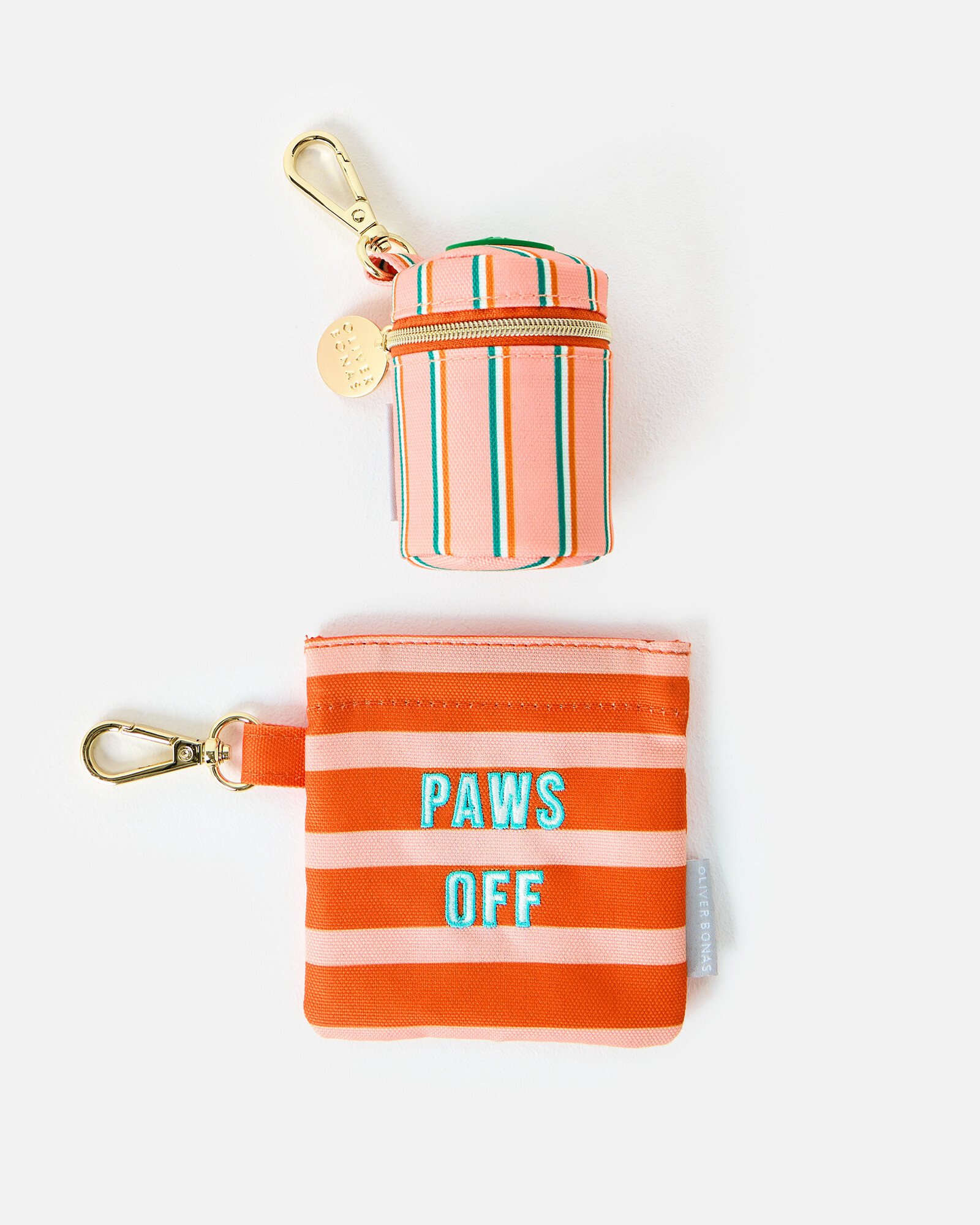 The perfect gift set for dog lovers, featuring a colourful treat bag and poop bag combo in a pink, orange and green stripe pattern. The treat bag has a small plastic clip and white 'Paws Off' embroidery on the front, and the poop bag has a zip closure, golden clip and a rubber opening at the top. Arrives in a custom designed gift box with a bone shaped cutout window.