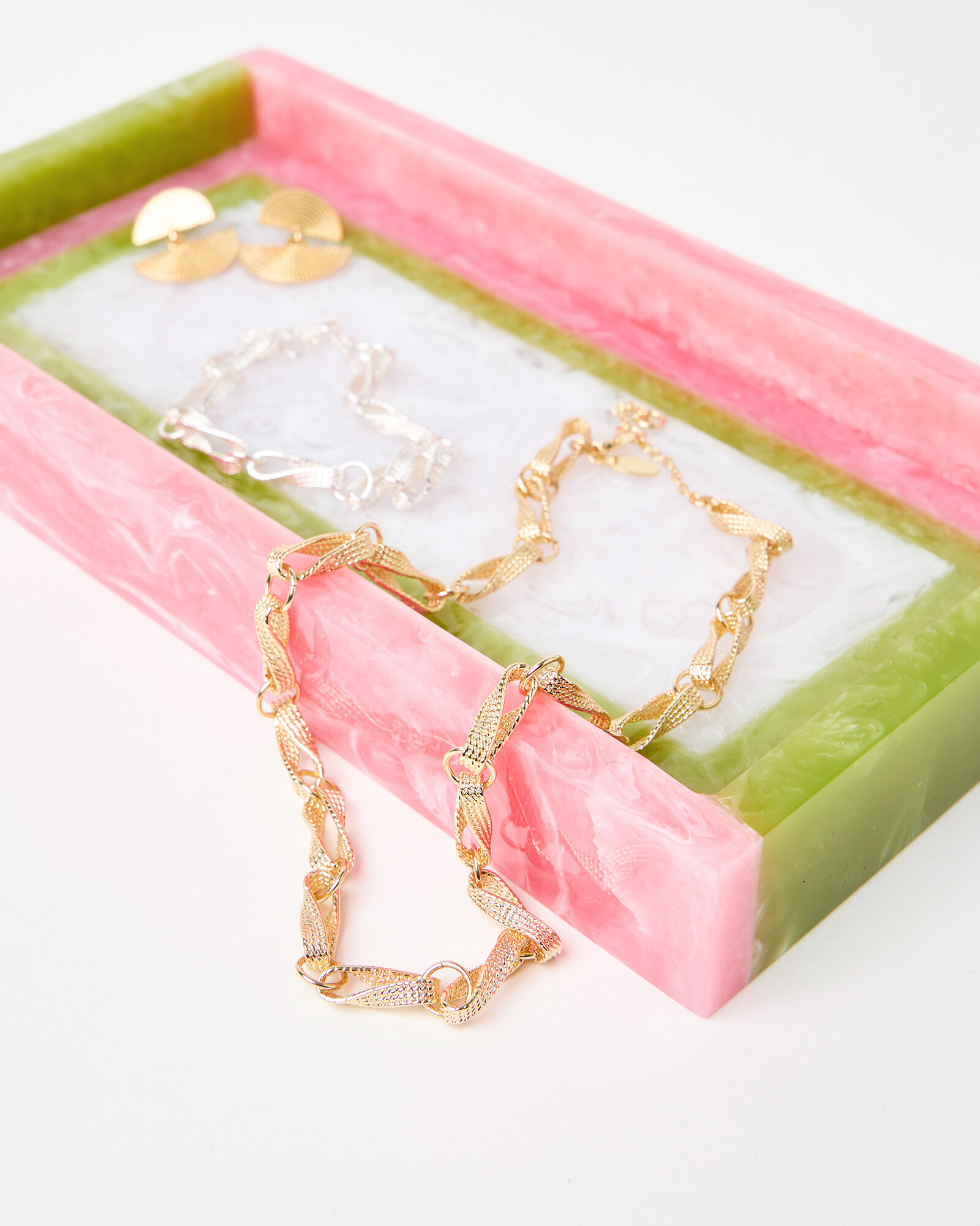Pink and green resin storage tray with a colour block design. The colour is mixed by hand to create a distinctive marble effect on each piece.