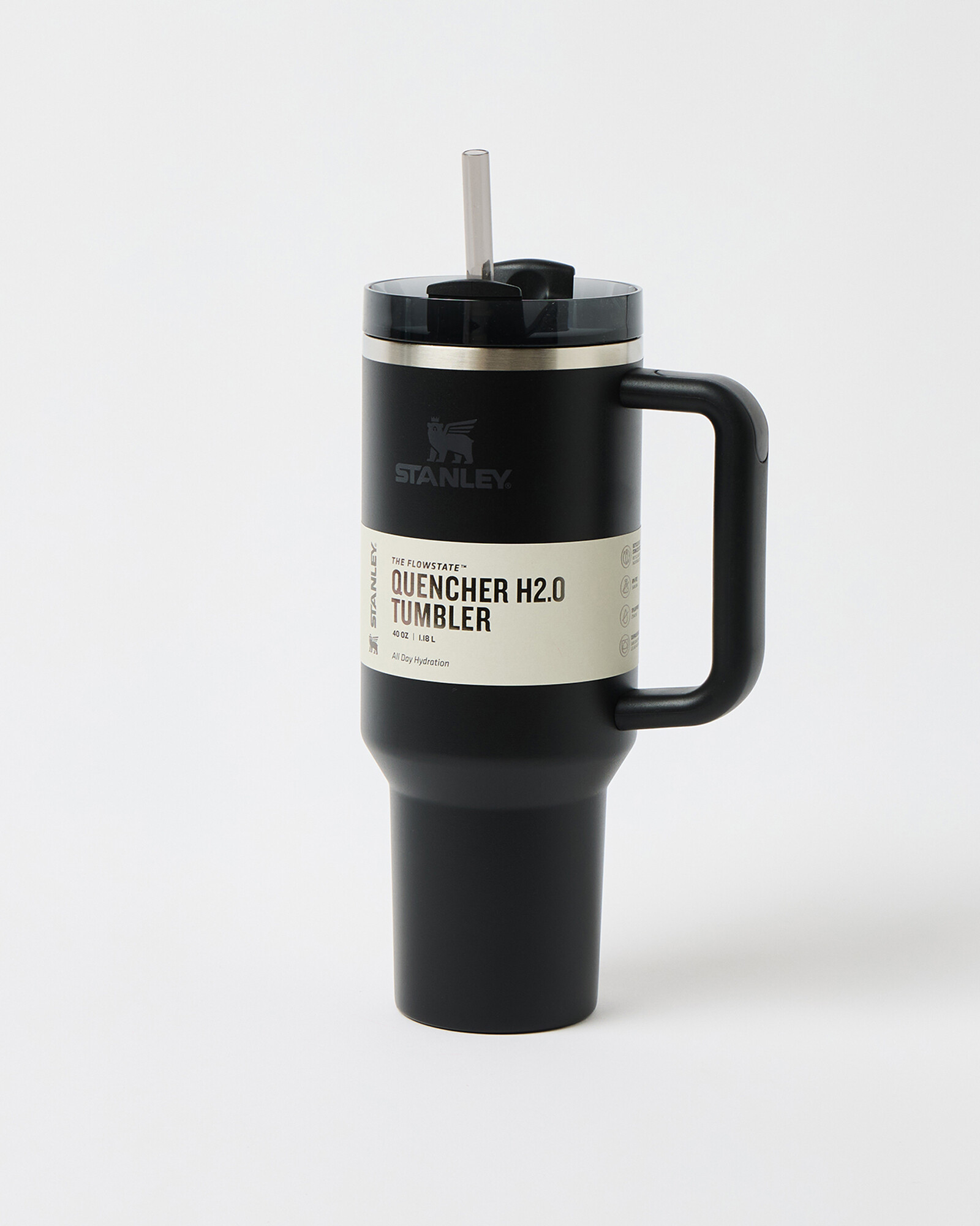 Made from recycled stainless steel with Stanley's vacuum insulation, the black 1.18 litre Quencher H2.0 will keep your water cold for up to 11 hours, and hot for up to 7 hours. The advanced FlowState lid features a rotating cover with three positions: a straw opening designed to resist splashes while holding the reusable straw in place, a drink opening, and a full-cover top. The ergonomic handle includes comfort-grip inserts for easy carrying, and the narrow base fits just about any car cup holder.
