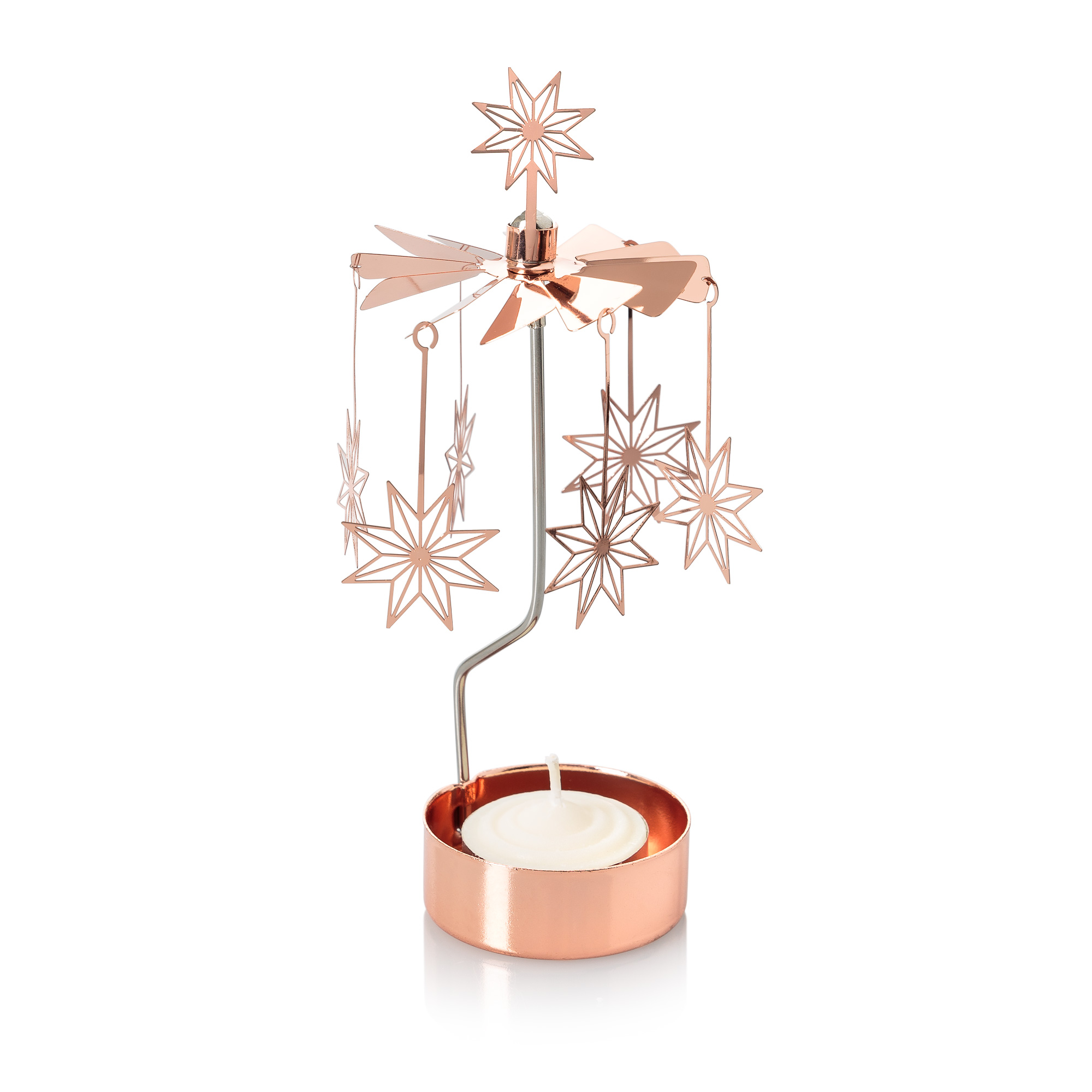 Create a sparkling centrepiece to your festive table setting with this Star Rotary Tealight Holder in copper. Six stars with cut out details hang around a rotating wheel and glimmer in the flame of the tealight.