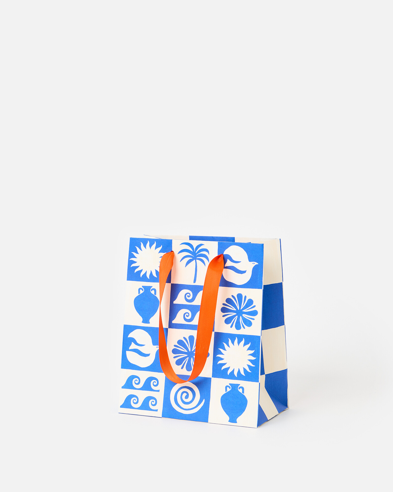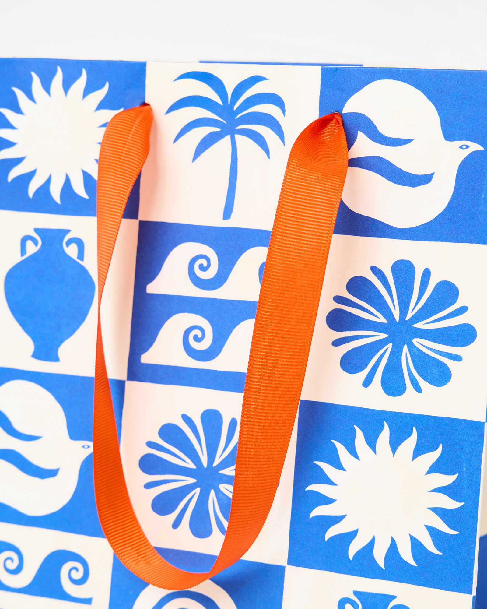 Medium-sized paper gift bag featuring a hand-drawn summer tile pattern, with blue and white block coloured tiles and contrasting wave, palm, sun and flower motifs. Finished with orange ribbon handles.