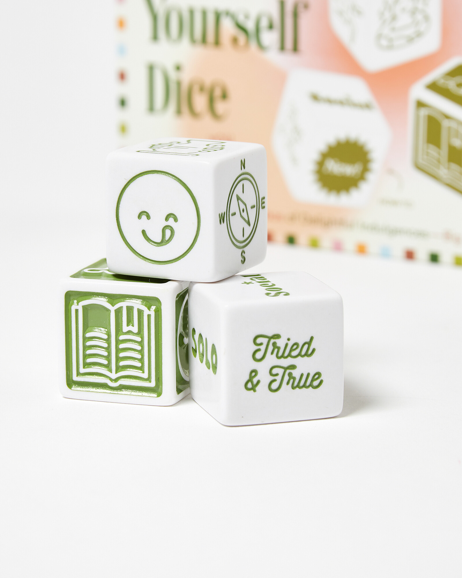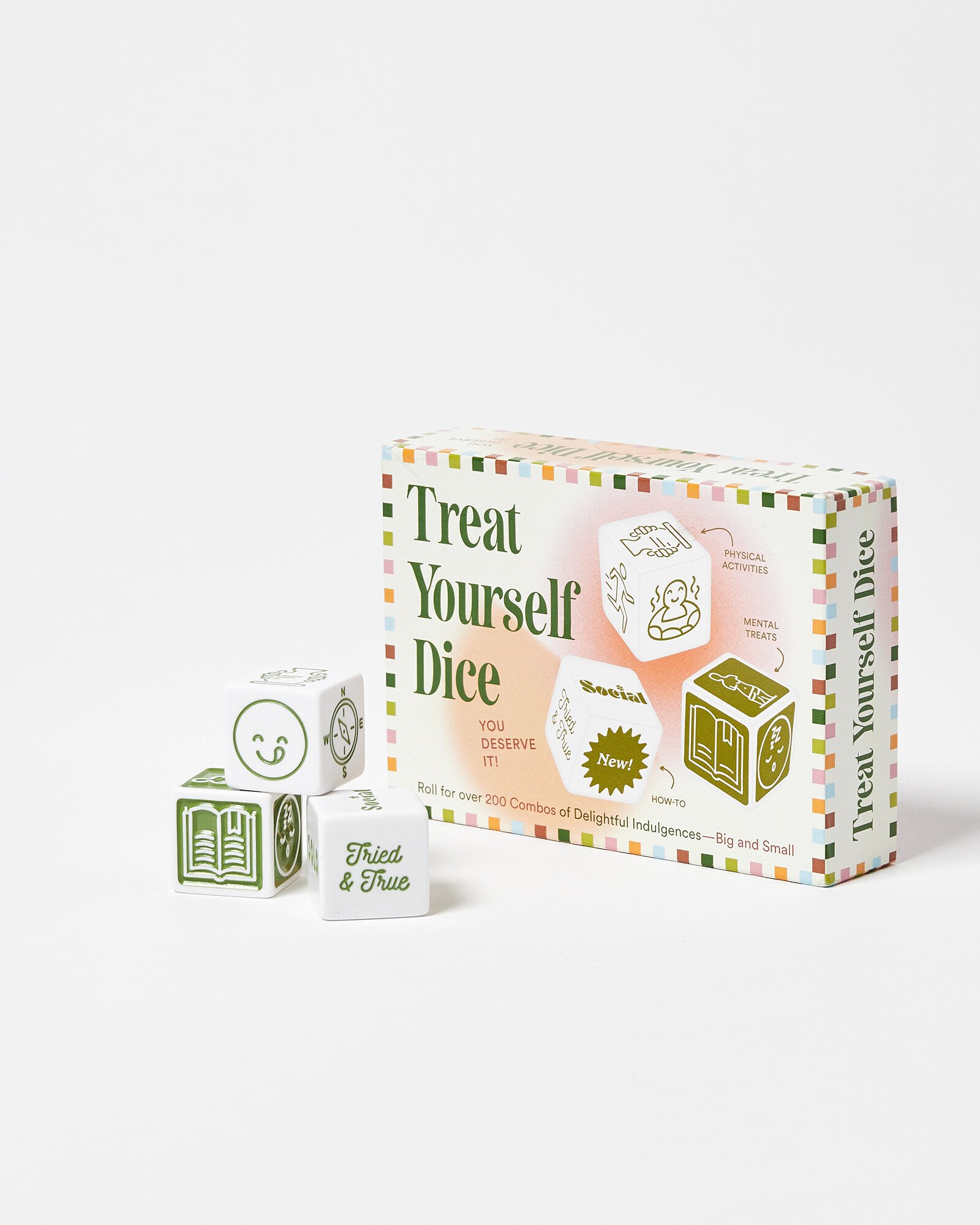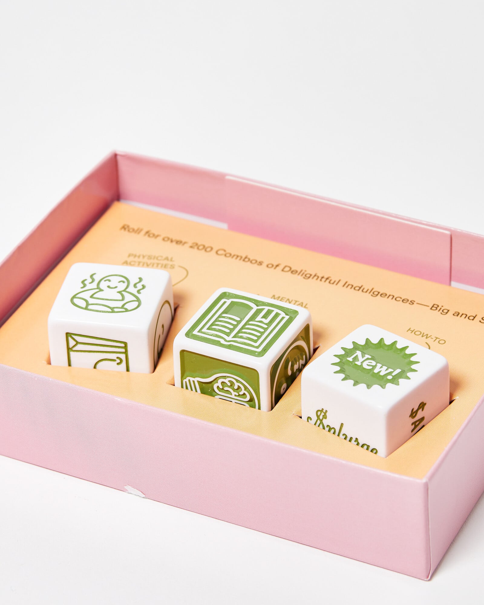 Looking to do something nice for yourself? Simply roll the dice and reward yourself with a treat. With six indulgences for the body, six treats for the mind, and six ways to shake things up, these dice offer 216 possible activity combinations. The accompanying booklet includes suggestions for a range of budgets and time frames, making it easy to customize your treat to what you need.