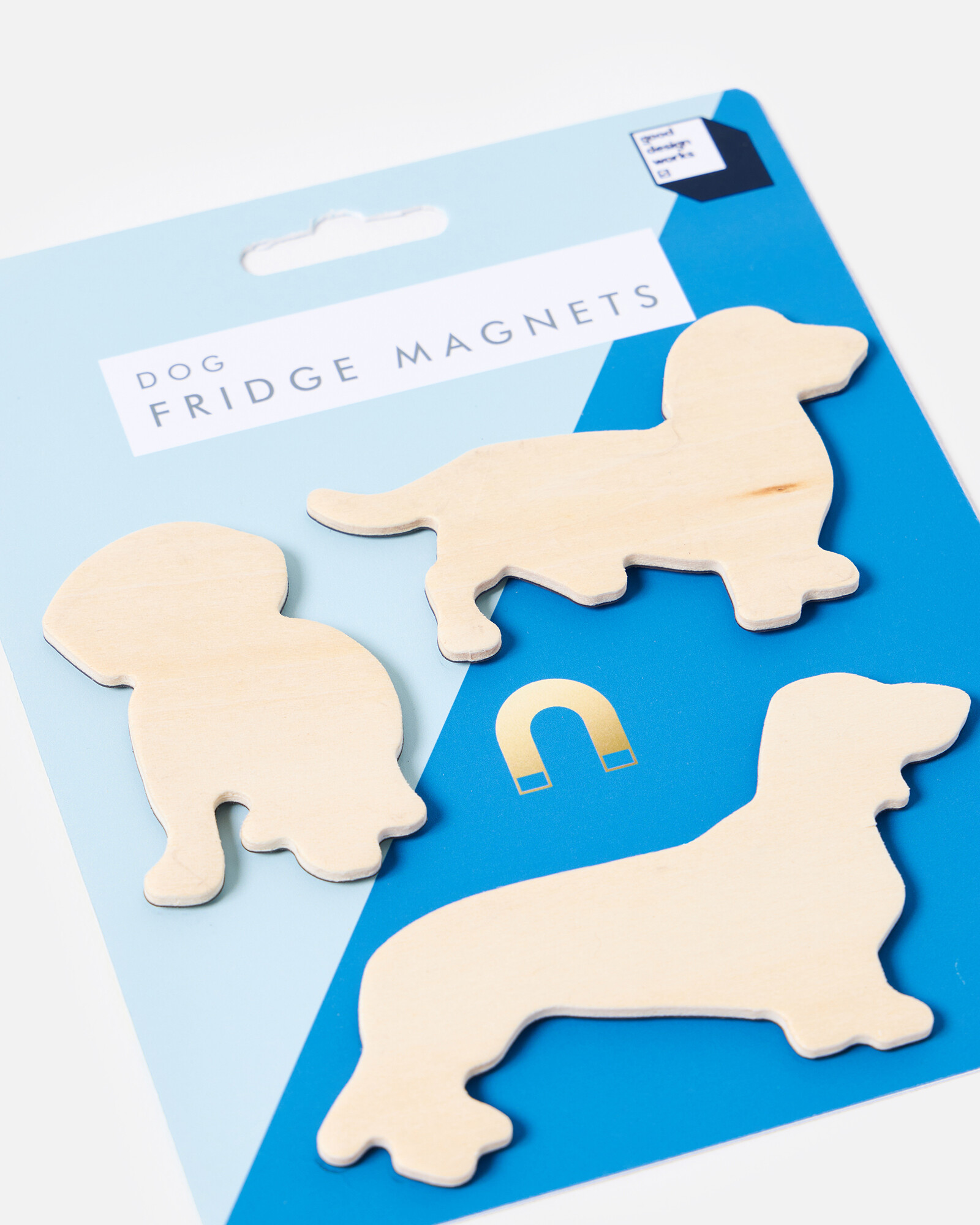 Set of three wooden fridge magnets in dog silhouette shapes, perfect for holding postcards, photos and to-do lists secure on your fridge door.