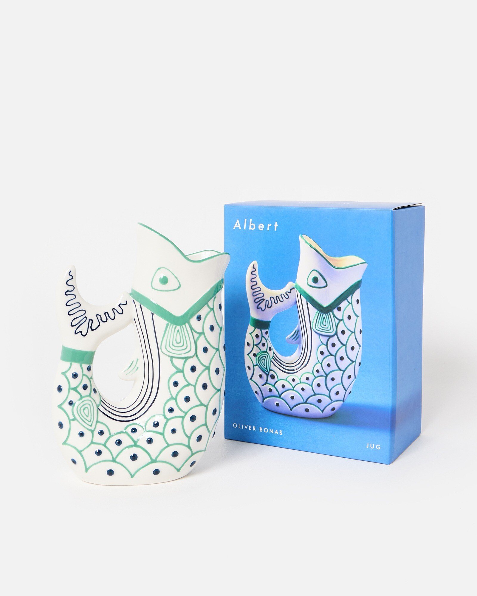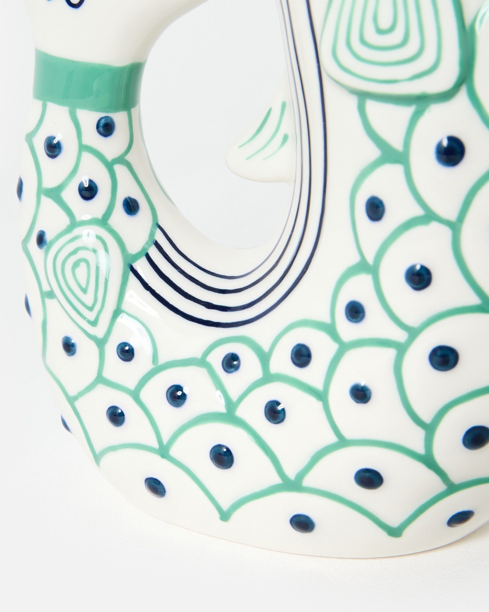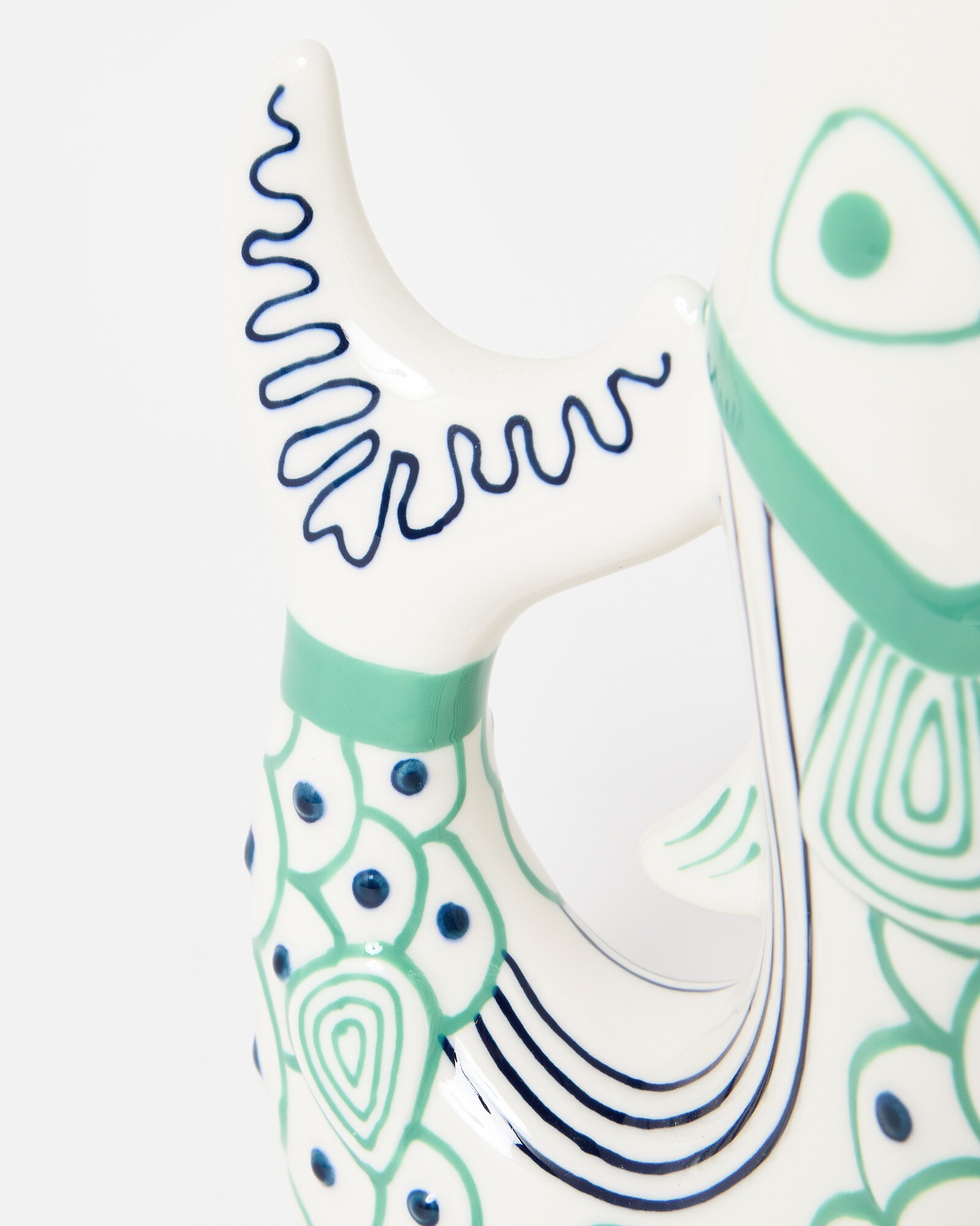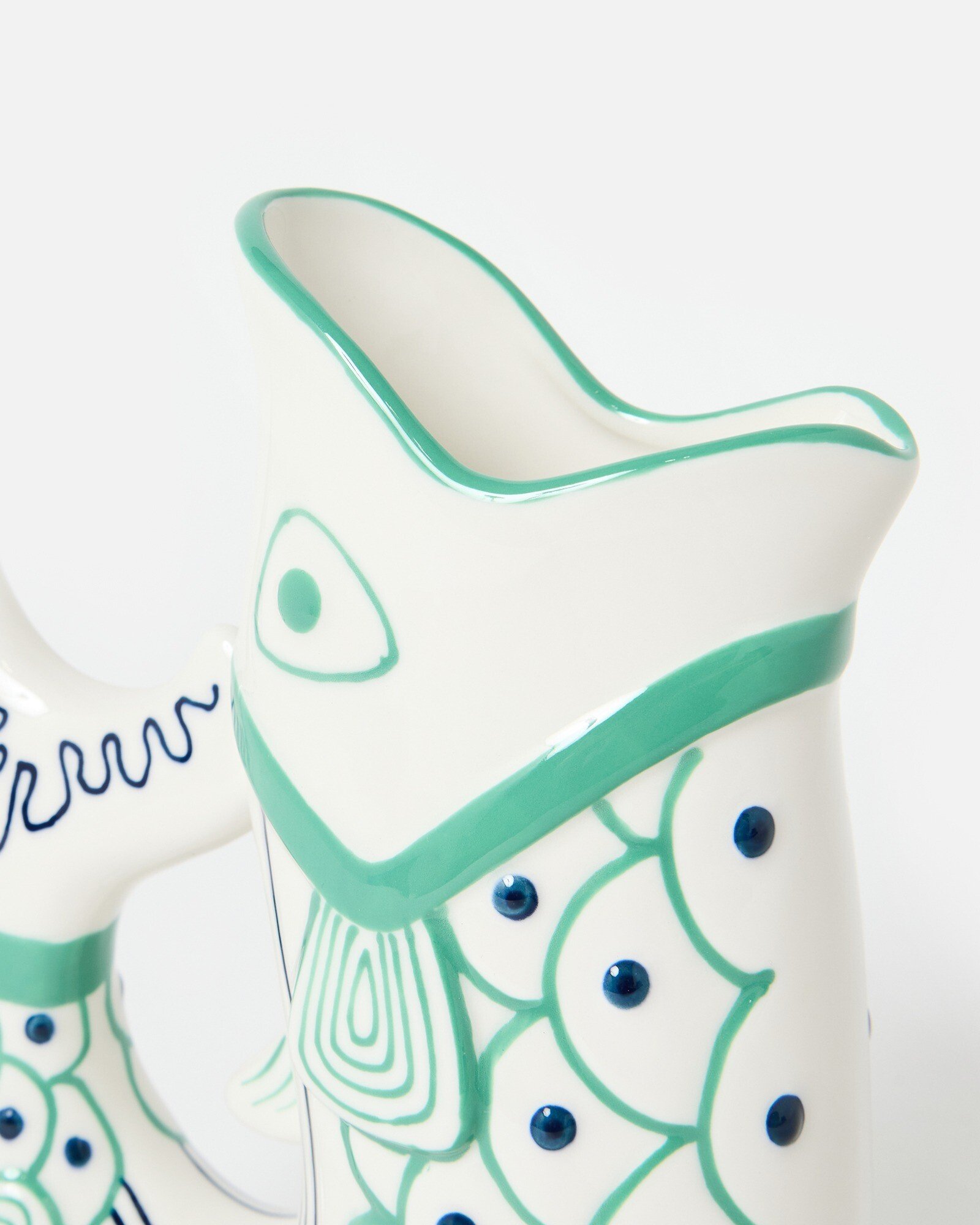 Large fish jug inspired by our favourite traditional gluggle jugs, designed in the OB creative studios with a bold new pattern. This ceramic jug features a white base, with decorative blue and green scale details for a highly textured finish. Ideal for summer table setting or gifting to friends, this fish jug can be used to hold water, soft drinks or fresh flowers, and arrives in a custom gift box.