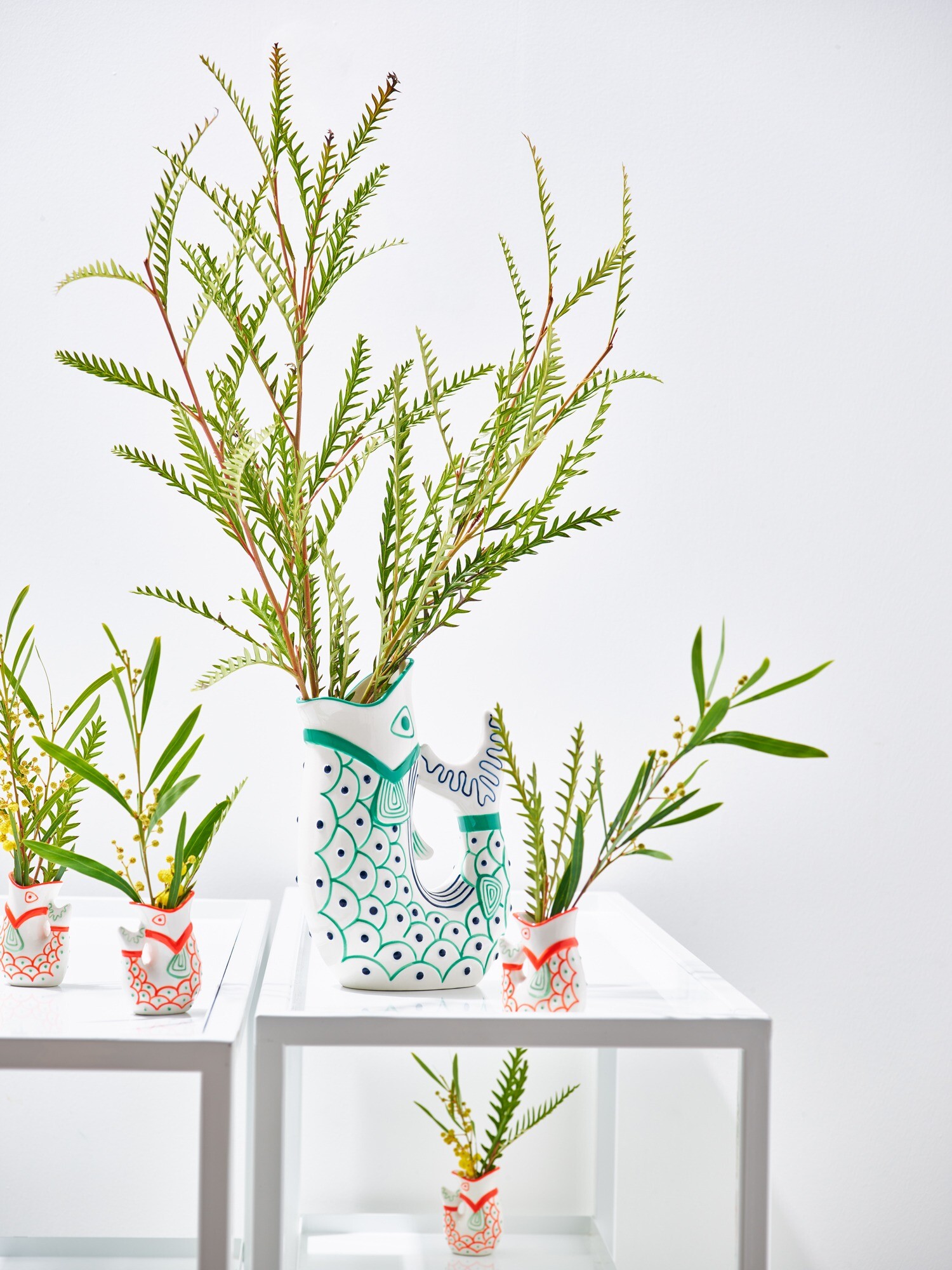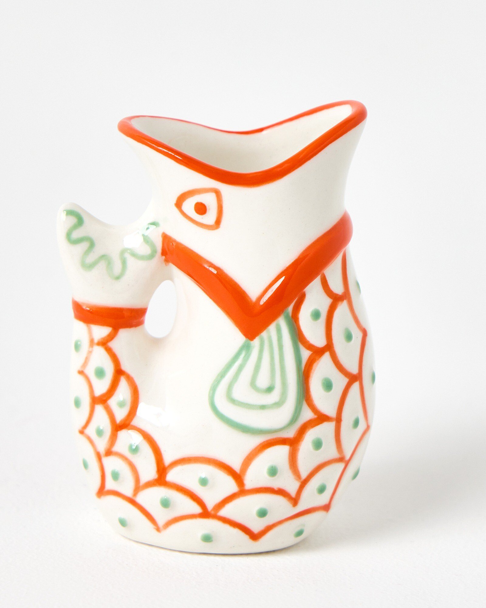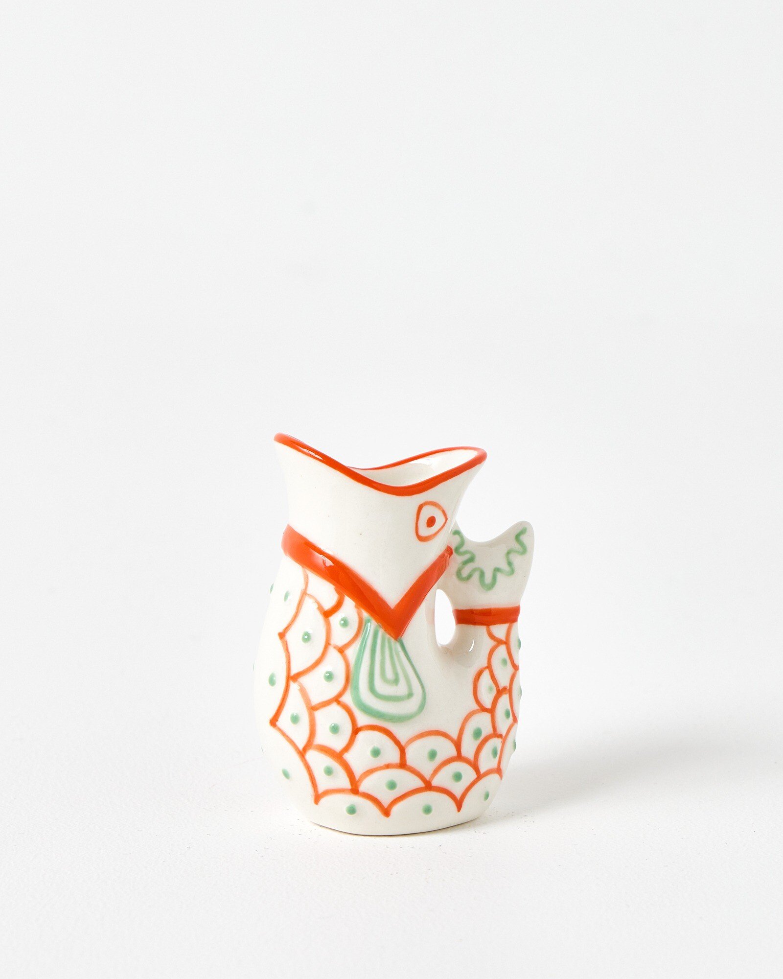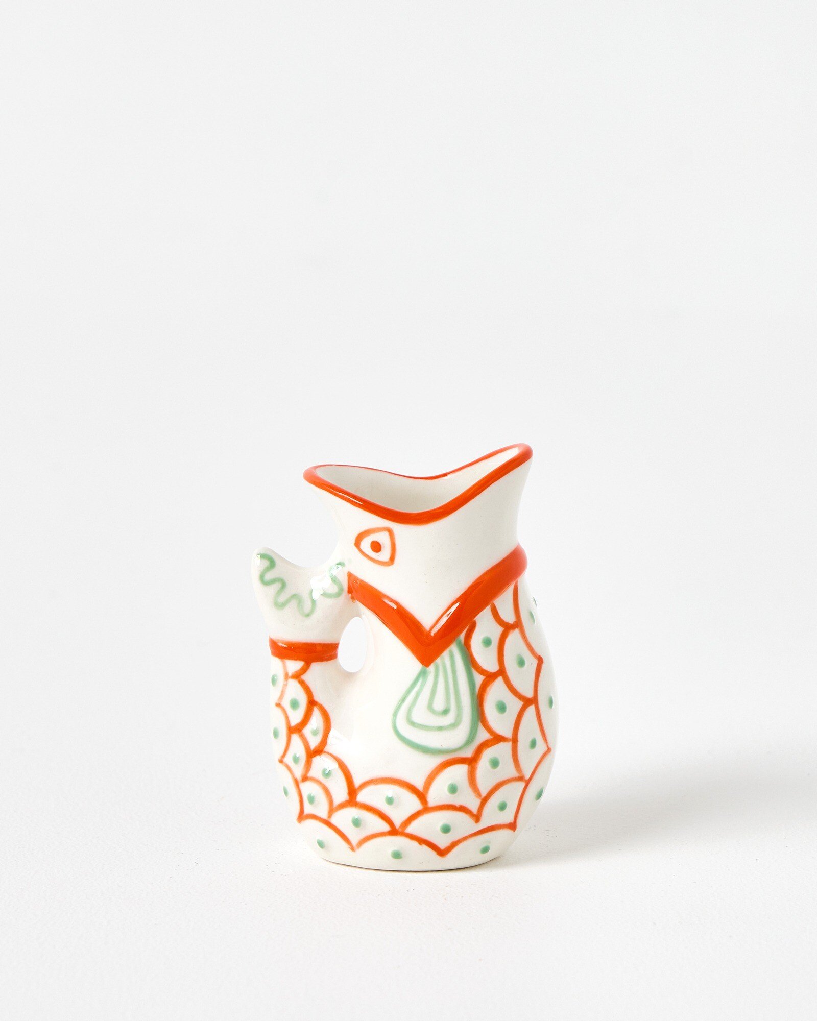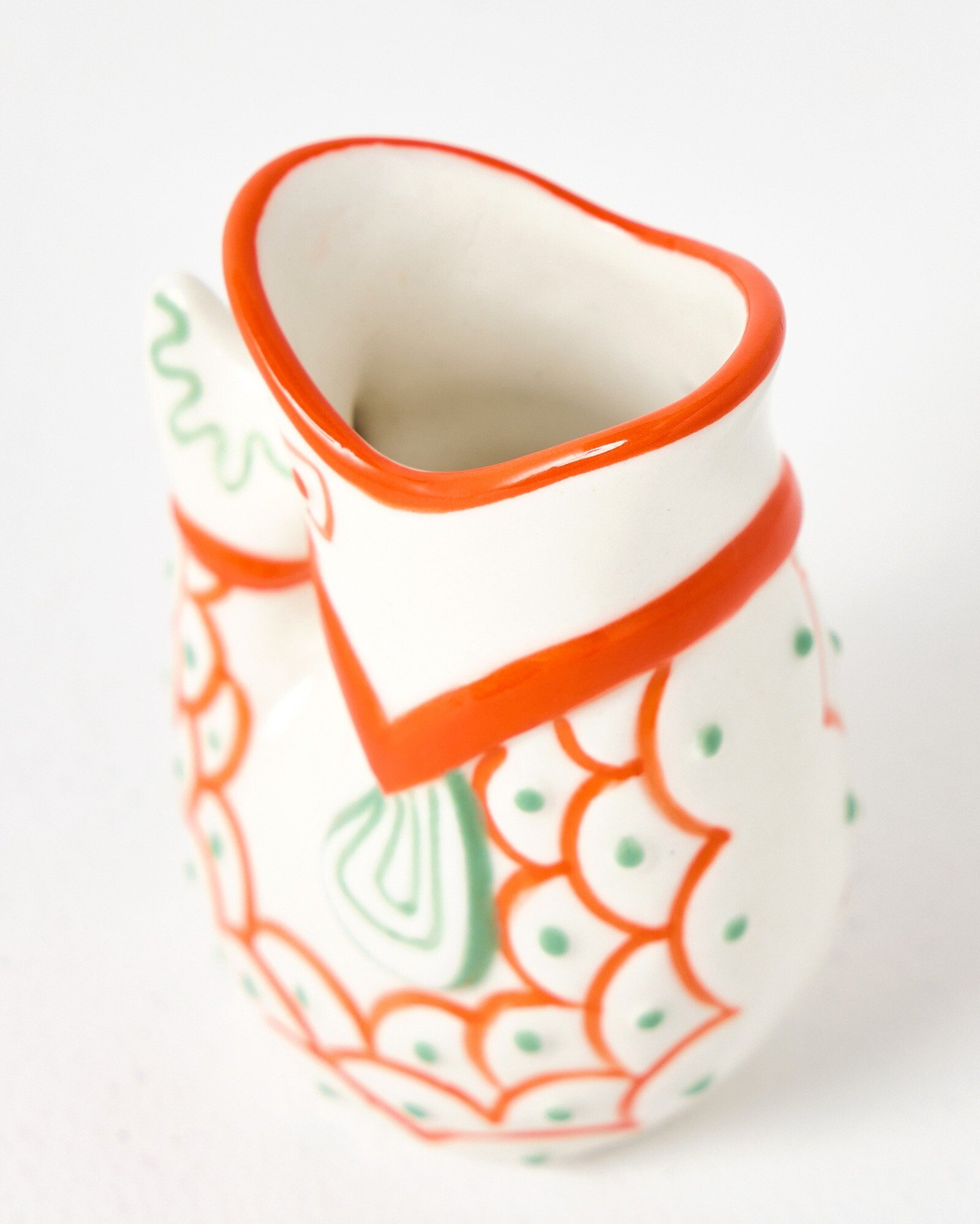 Mini fish jug inspired by our favourite traditional gluggle jugs, designed in the OB creative studios with a colourful pattern all over. This ceramic jug features a white base, with decorative orange and green scale details for a highly textured finish. Ideal for summer table setting or gifting to friends, this small white fish jug can be used as an ornament or bud vase to hold fresh flowers.