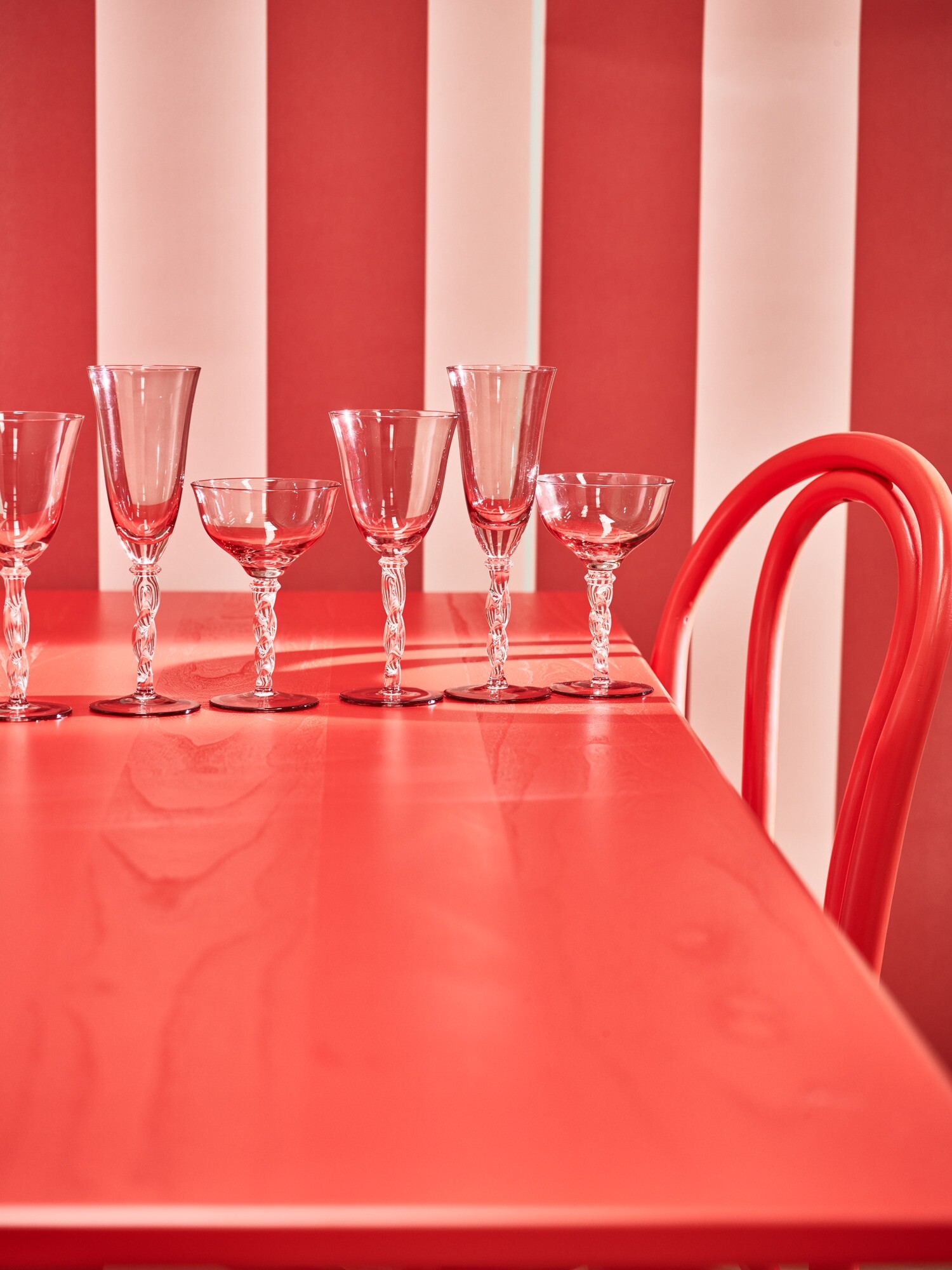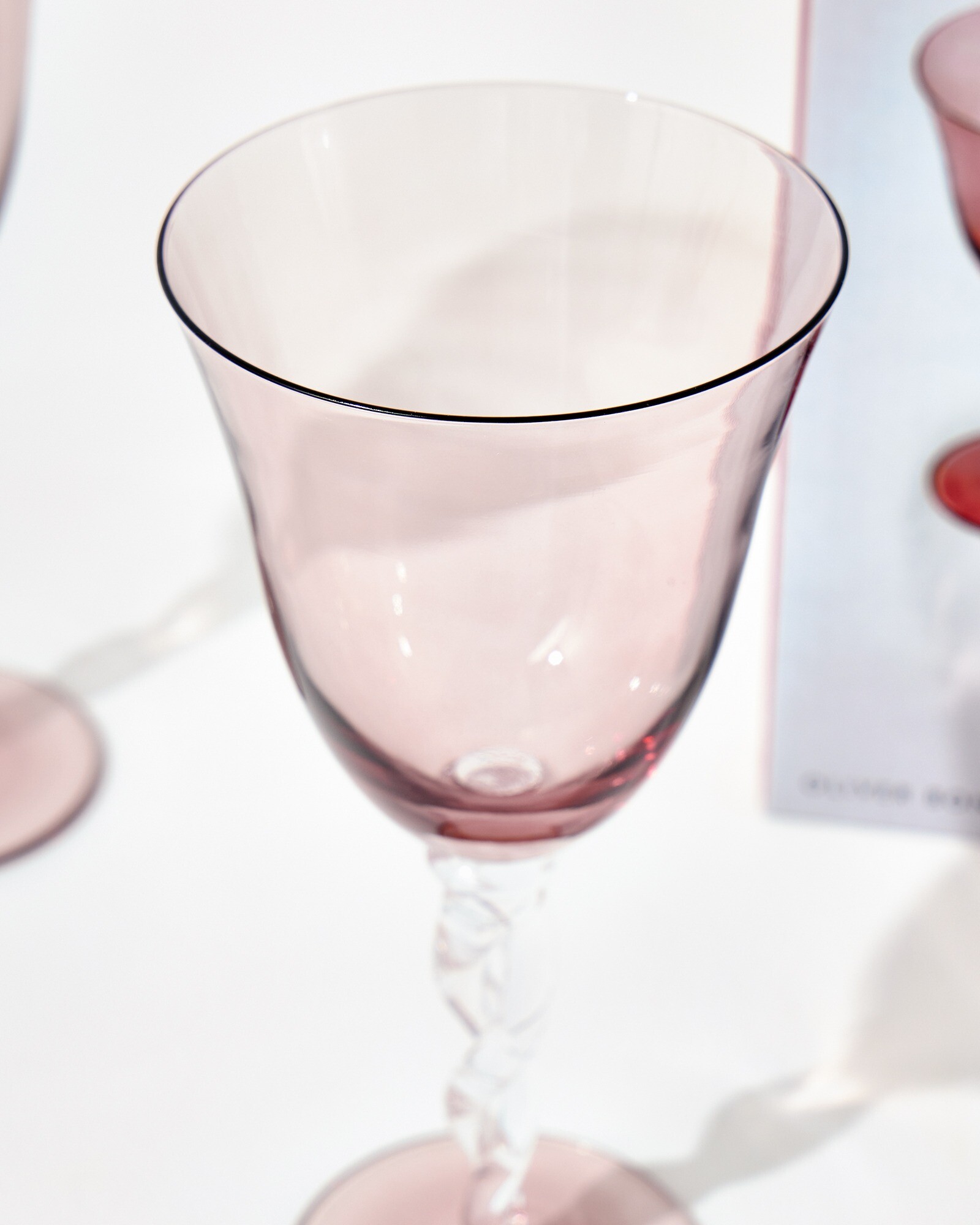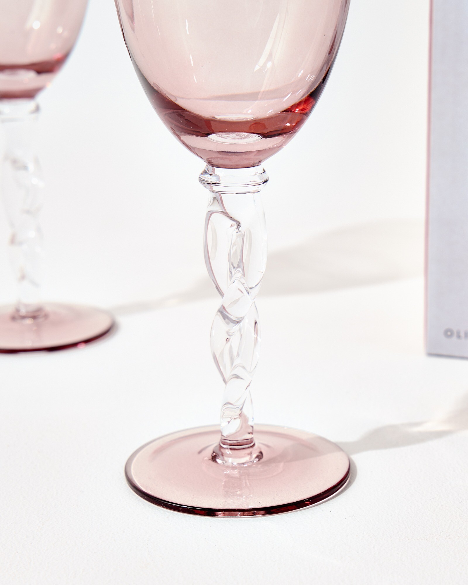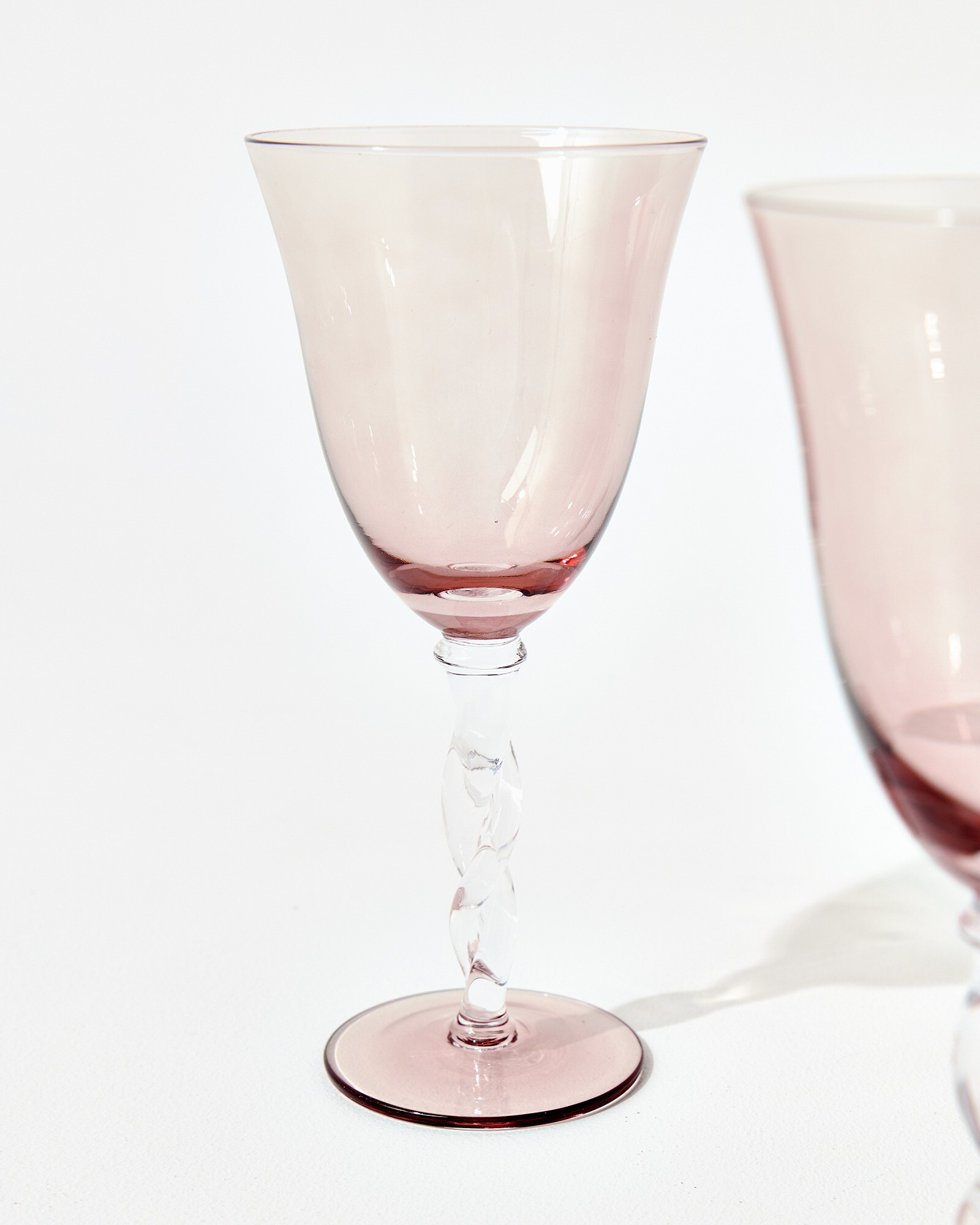 Pair of elegant wine glasses set in a smooth pink glass, with subtly fluted bowls and a clear, twisted stem. Arriving in a custom gift box, these wine glasses boast a timeless quality and would make a memorable birthday or housewarming gift. Whether hosting a cocktail evening with friends or hosting dinner parties at home, use these colourful glasses to decorate your table and serve drinks in style.