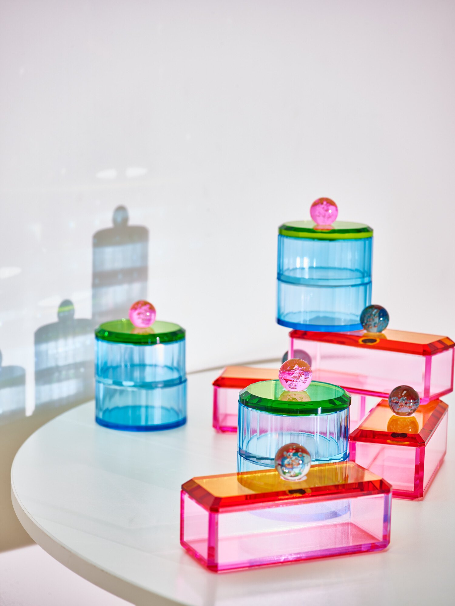 Two-tiered circular glass stacking storage pot, in a clean-cut design made from bright blue glass with a green lid and pink bobble top. Use to store jewellery and small accessories to keep organised and tidy.