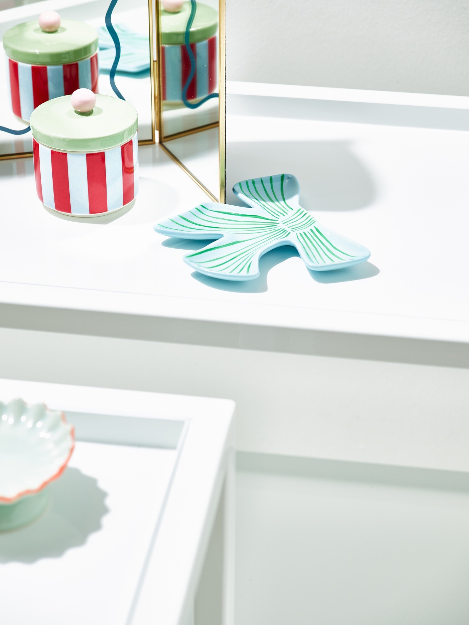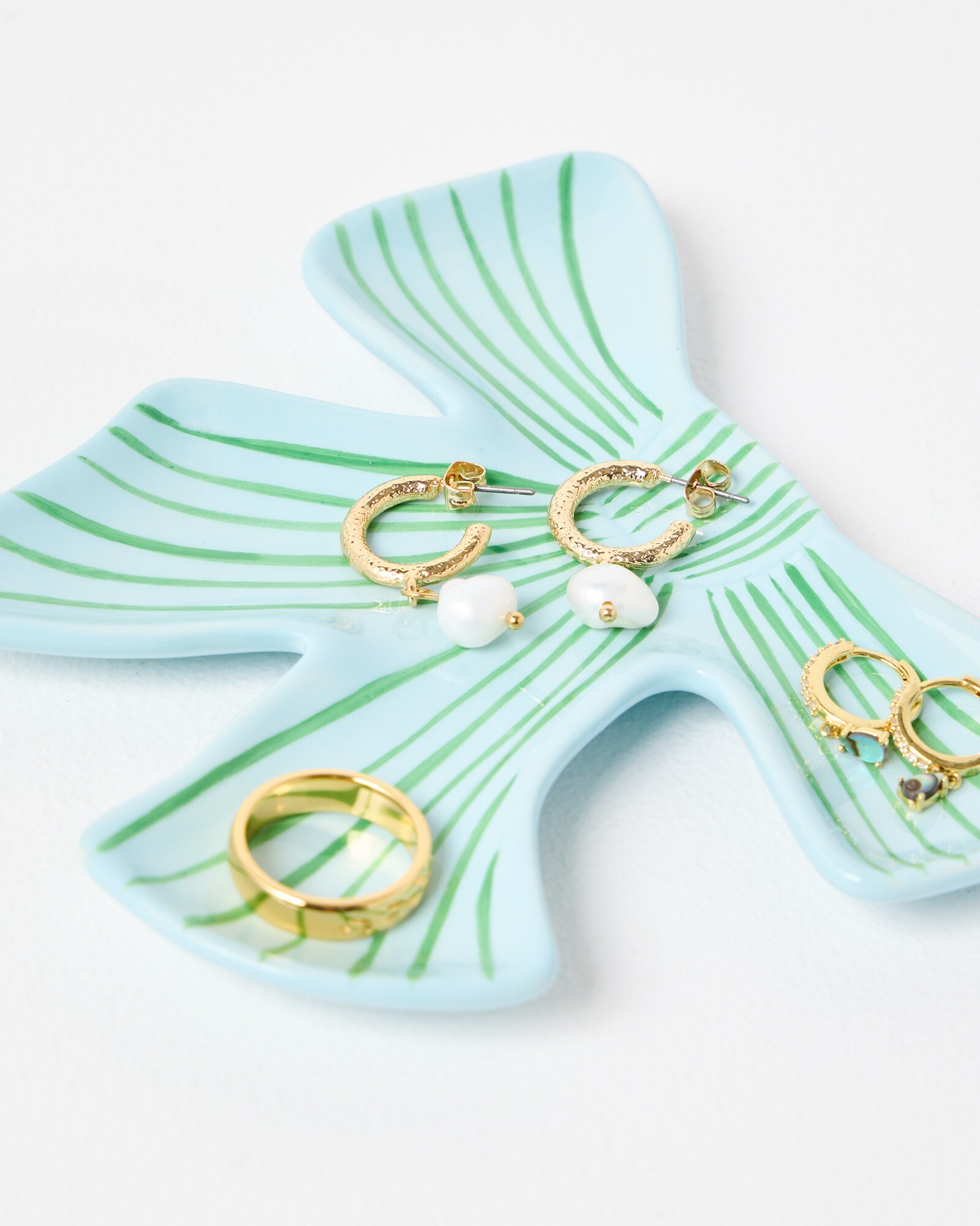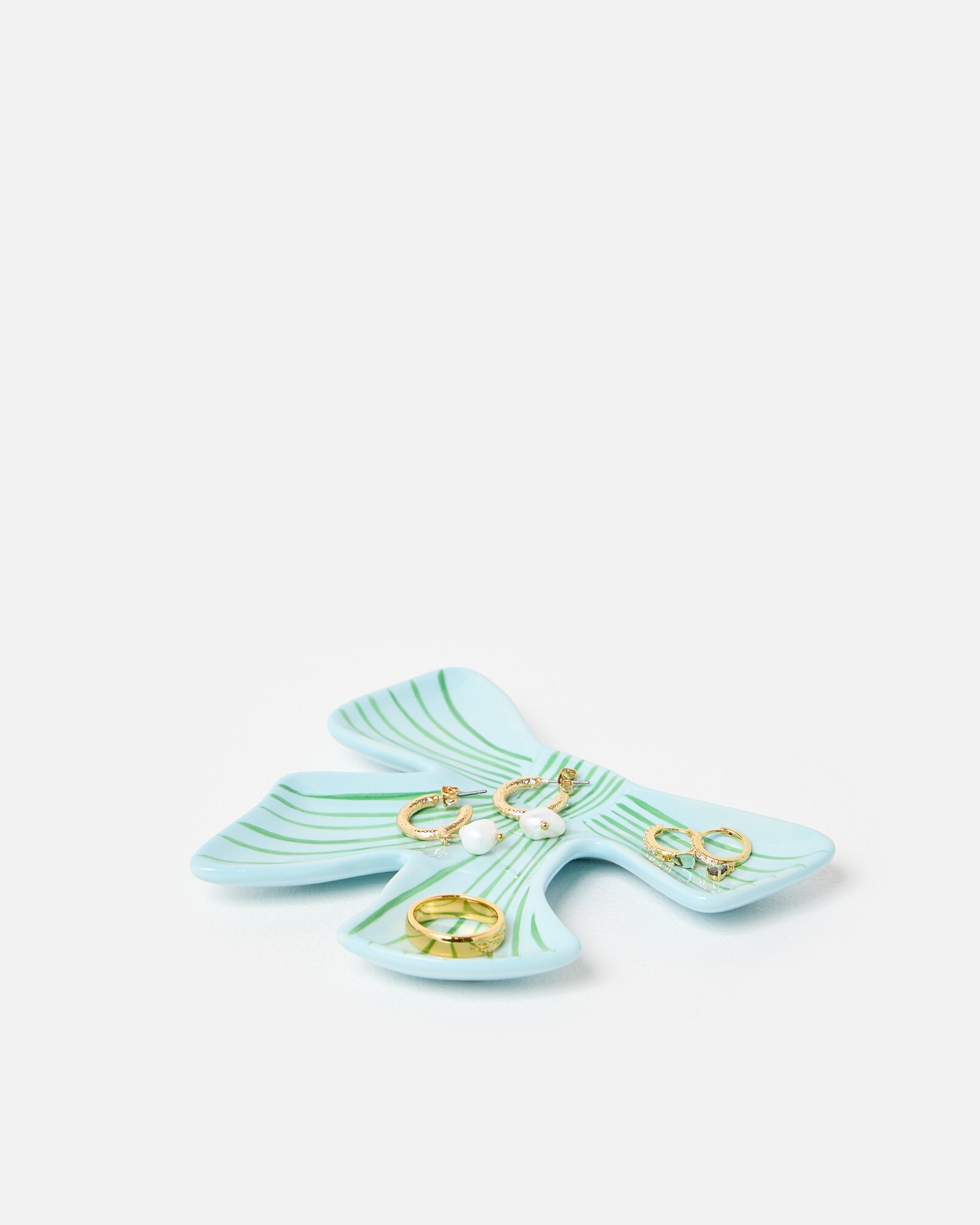 Blue ceramic trinket dish in a bow shaped profile, decorated with green stripes and soft edges. Perfect for keeping on your kitchen counter or bedside table to hold everyday jewellery essentials and daily items such as keys, chargers and earphones to keep your home surfaces tidy and organised.