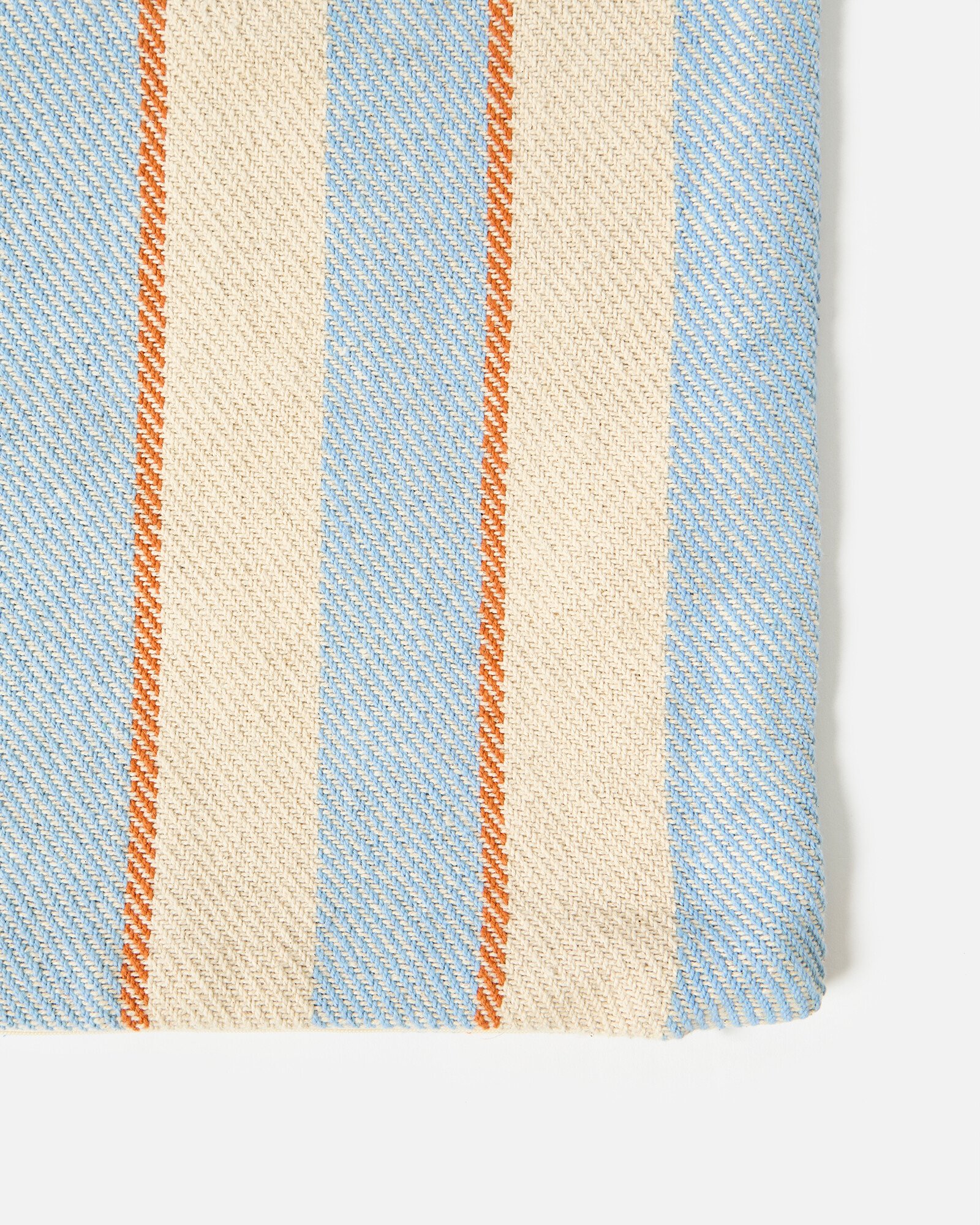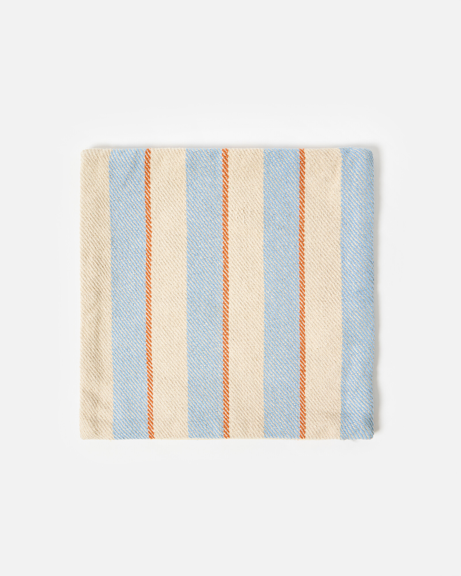 Square cushion cover made from 100% cotton, woven by loom. Featuring wide blue and natural stripes with slim orange stripes in-between, use this cushion to add a warm colour accent to your living space for a natural, comforting feel. Perfect for indoor and garden use.
