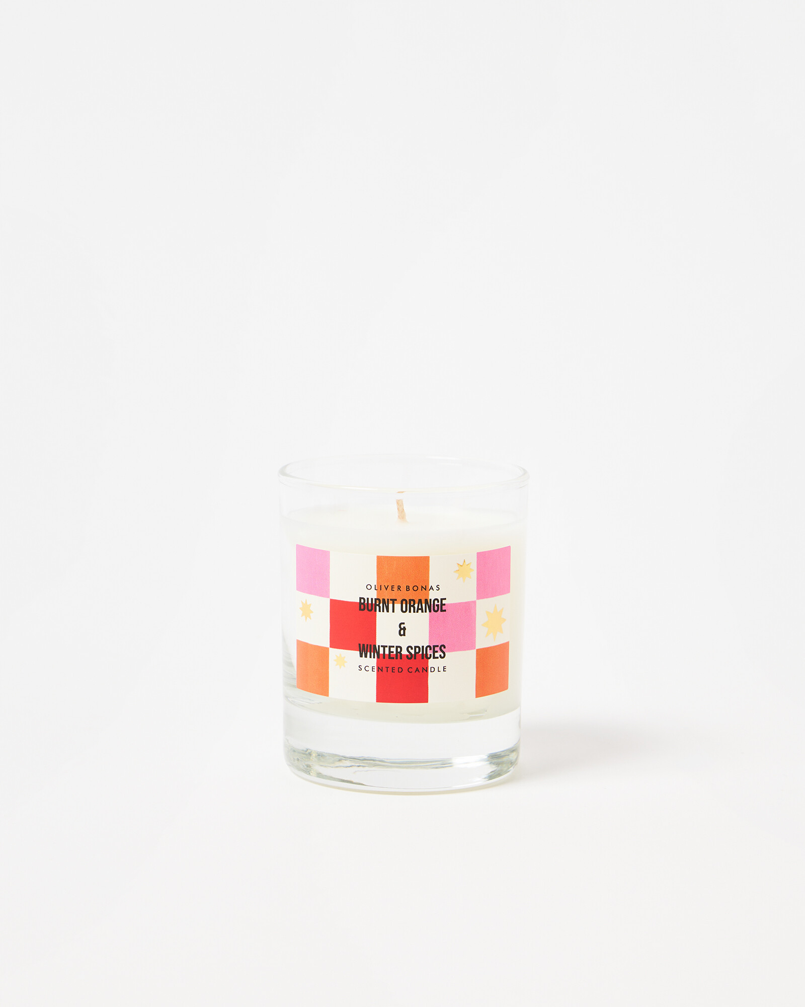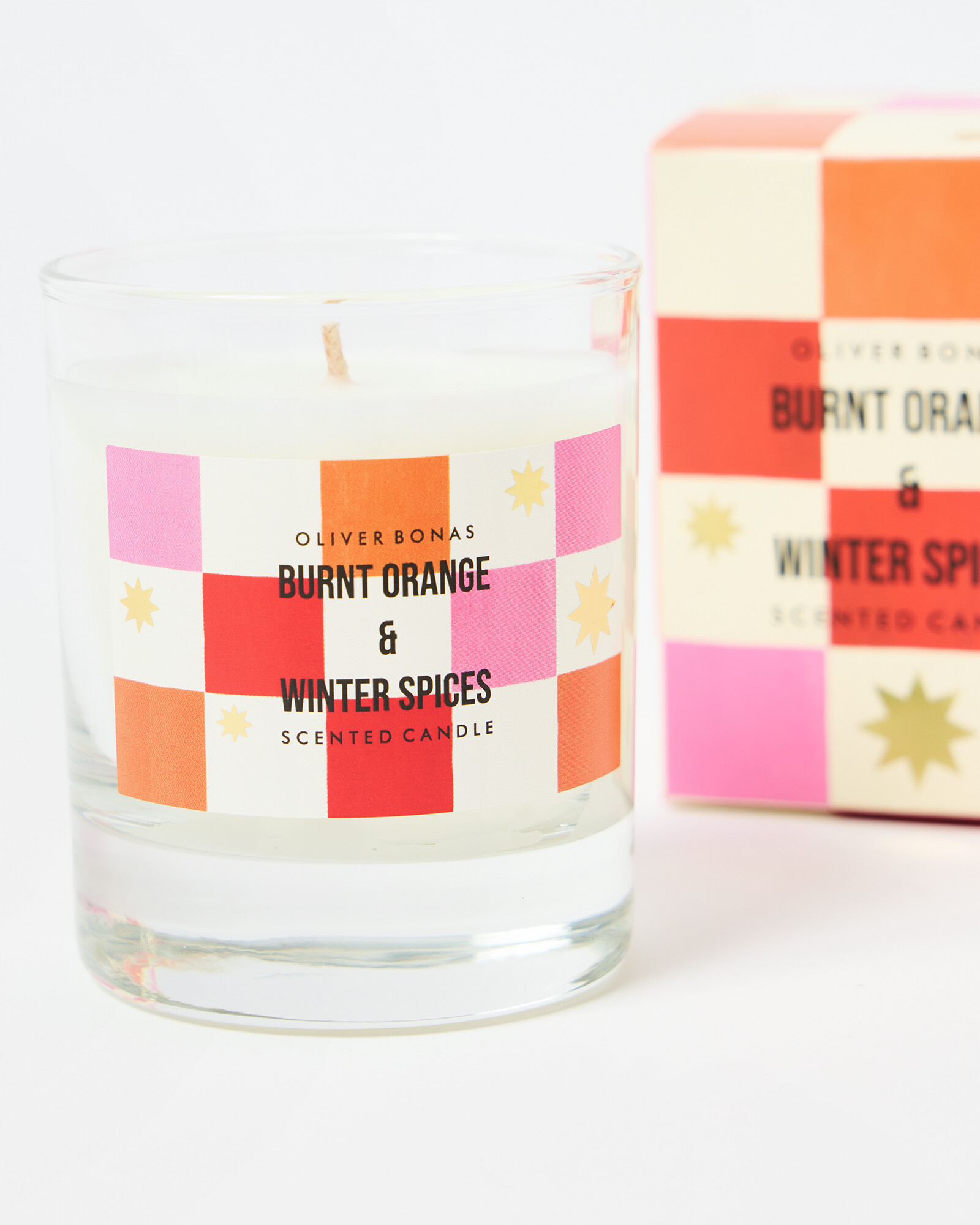 Hand-poured candle scented with Christmas-inspired notes of clove, burnt orange and winter spices. The chequerboard packaging is hand-painted in the OB creative studios and inspired by our original patchwork bedspread, with gold foil details and warm tones.