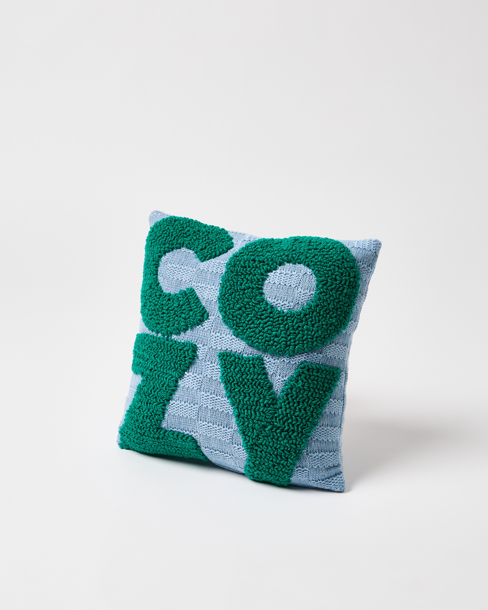 Slogan cushion cover knitted in contrasting blue and green tactile stitches.