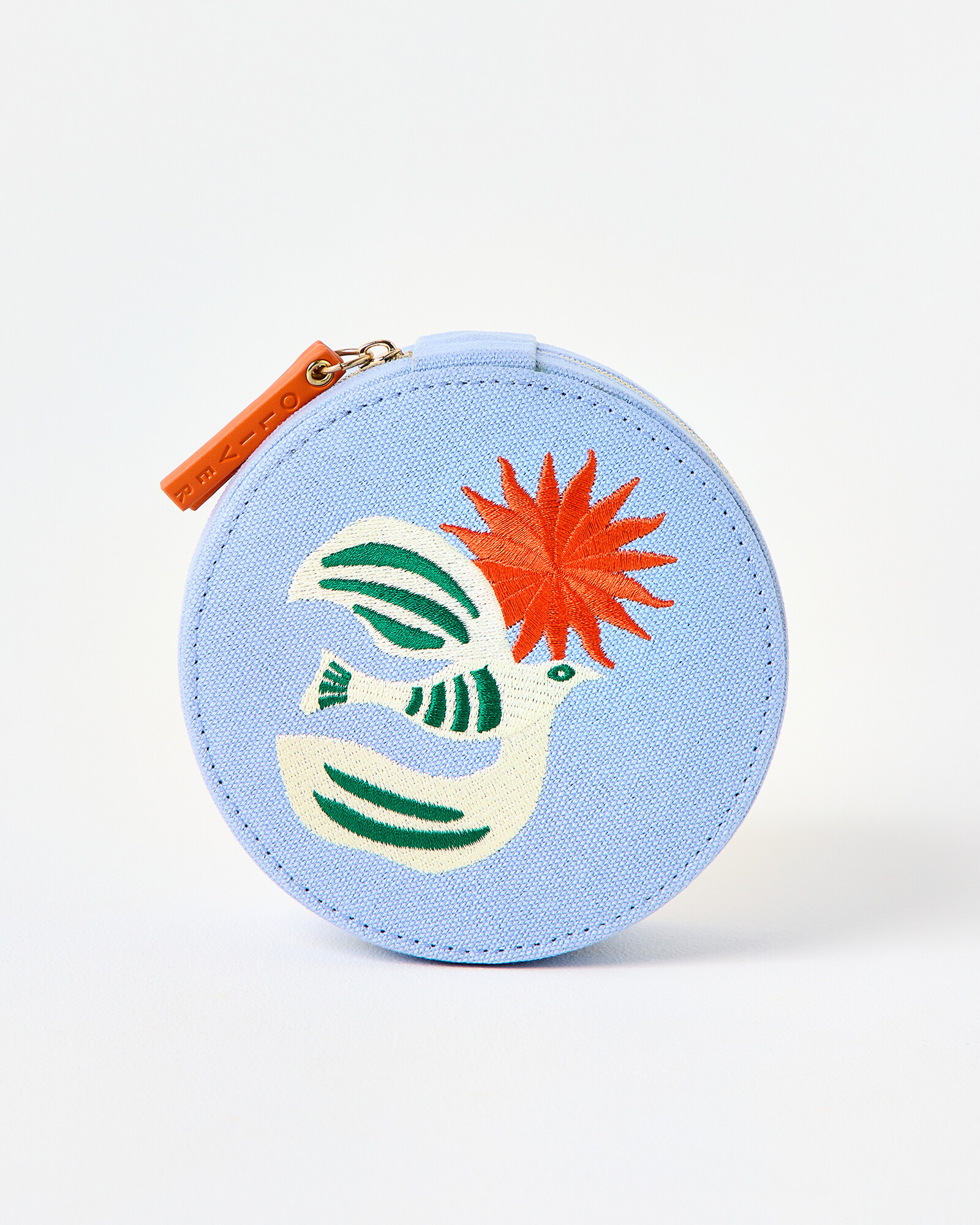Round jewellery box in a powder blue cotton material, featuring an embroidered white bird and orange sun motif designed in the OB creative studios. Inside this travel jewellery box has one large compartment with a drawstring closure, and two removable strips for earrings and necklaces. Finished with a zip closure and two embossed orange Oliver Bonas toggles. Perfect for organising your jewellery essentials when travelling, and storing keepsake pieces at your bedside or dressing table.