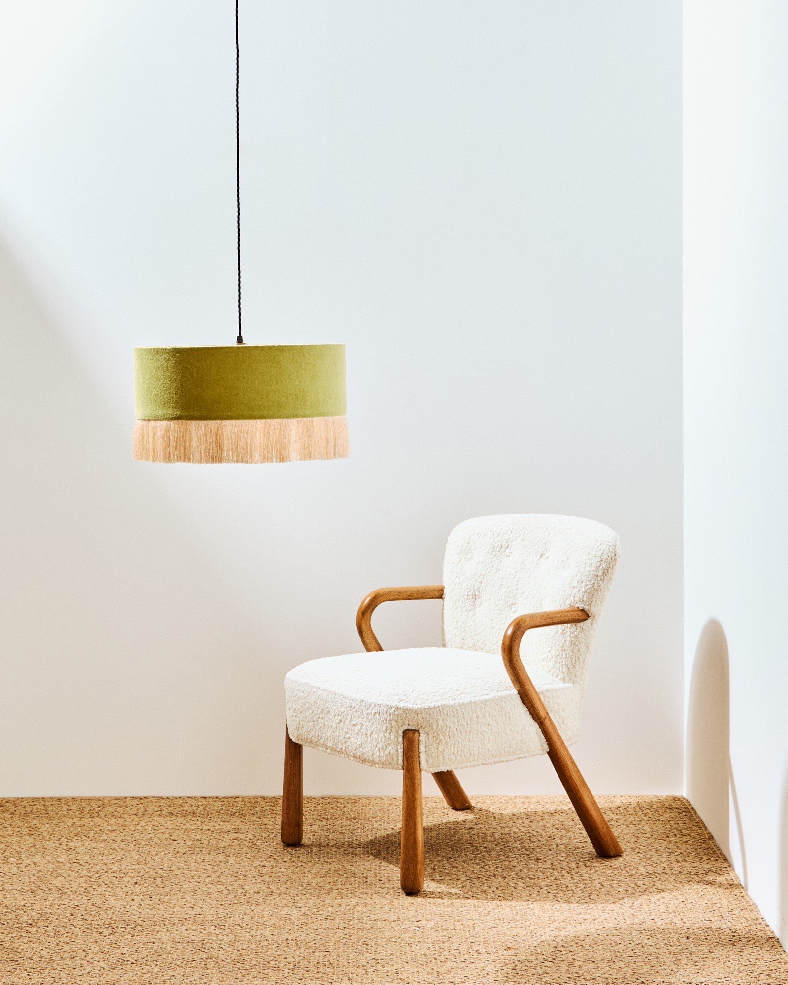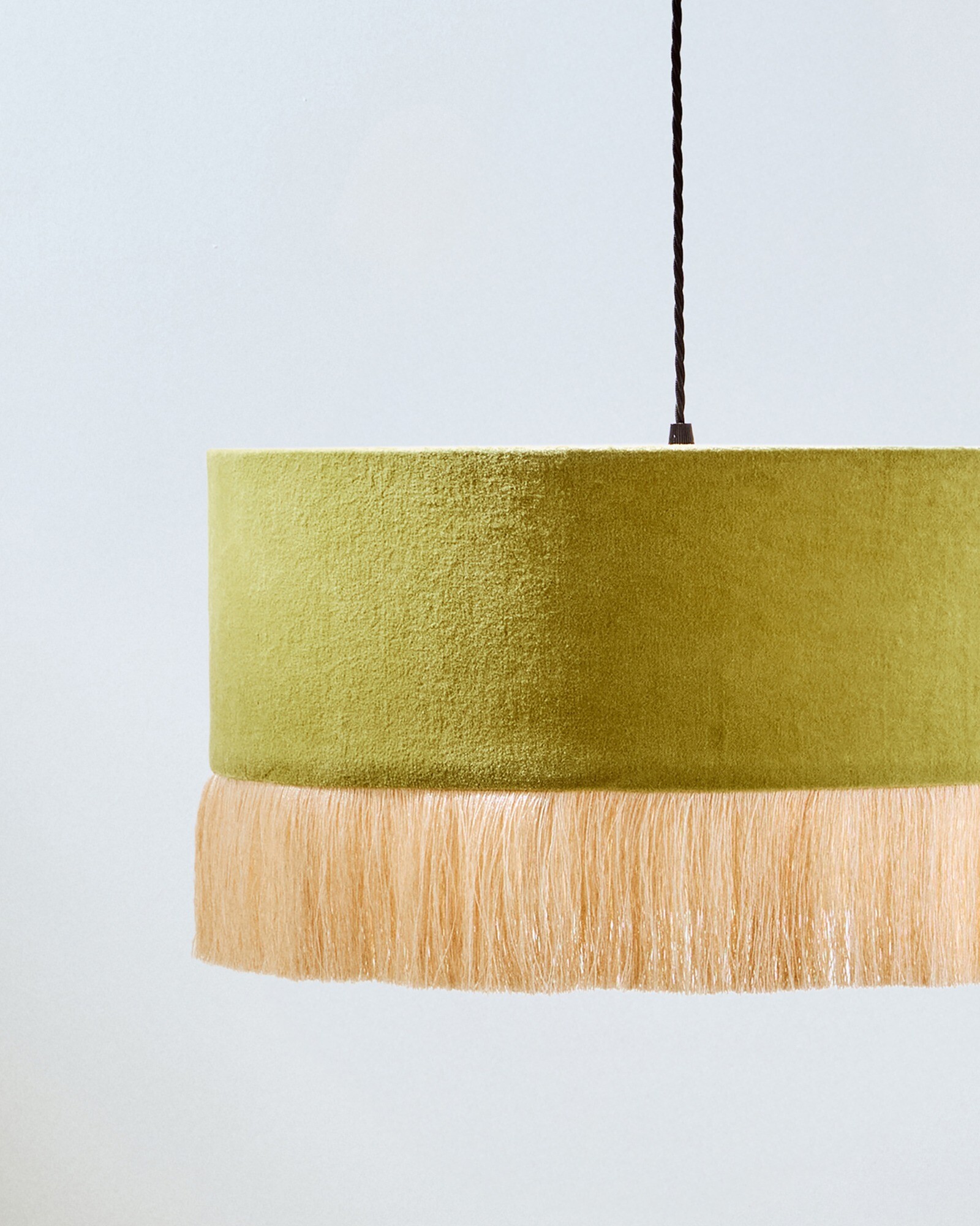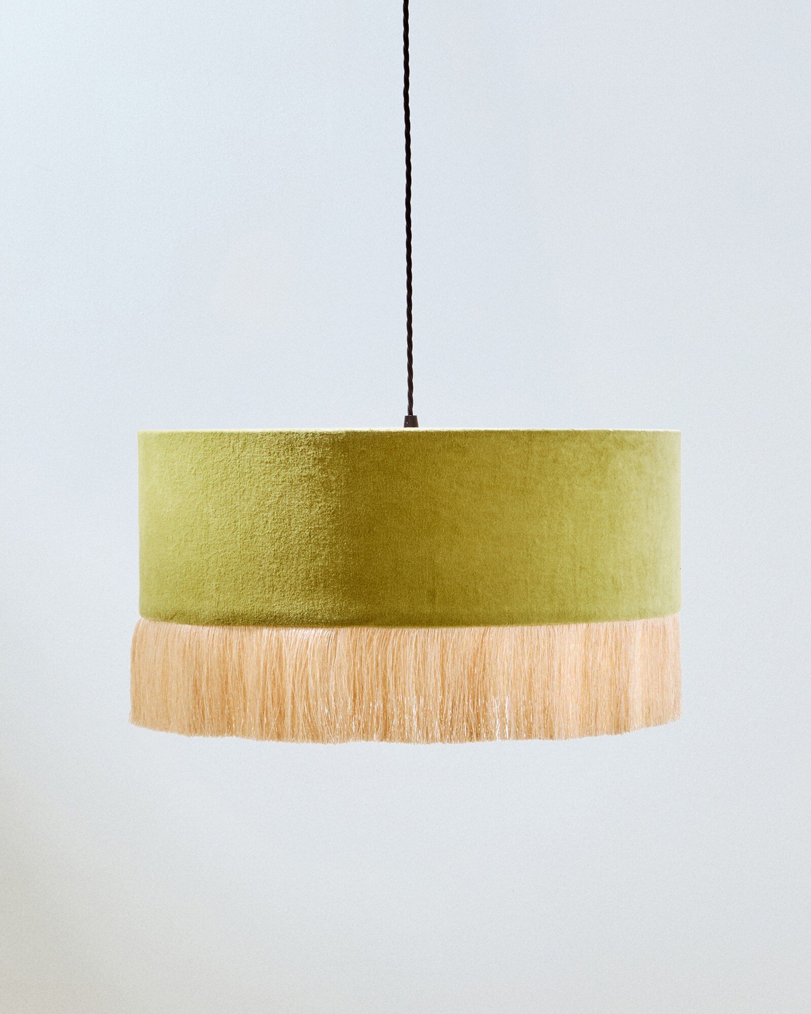 Our bestselling Ero drum pendant lampshade in a new, warm green velvet, with an ecru tassel fringe around the base. Perfect for adding a touch of colour to your living room or dining room.