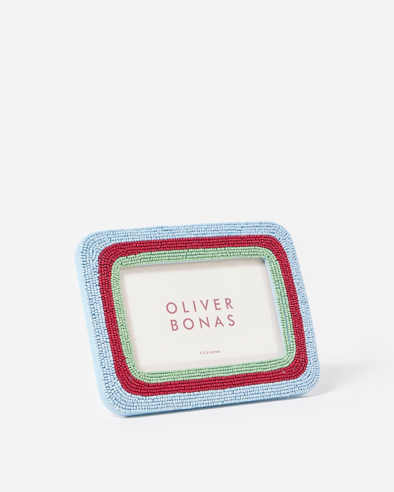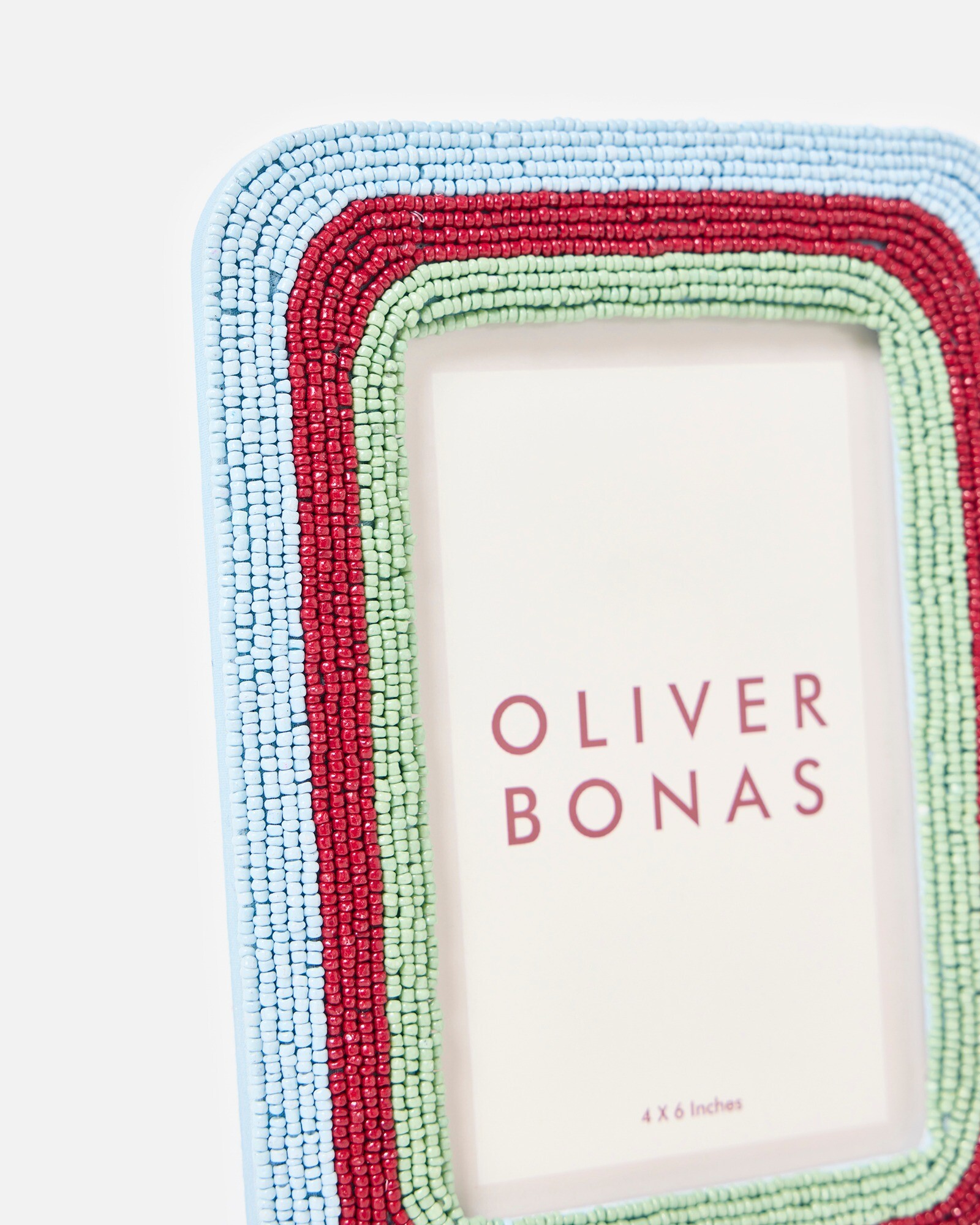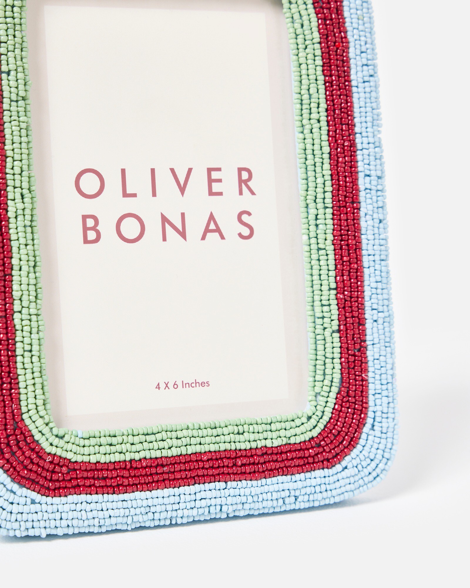 Textural beaded photo frame with a striped border in mint green, burgundy and blue hues, with rounded edges and a 6x4 inch window. This striking photo frame can sit either portrait or landscape to suit the orientation of your photo, perfect for placing on a bedside table, shelf or mantle piece.