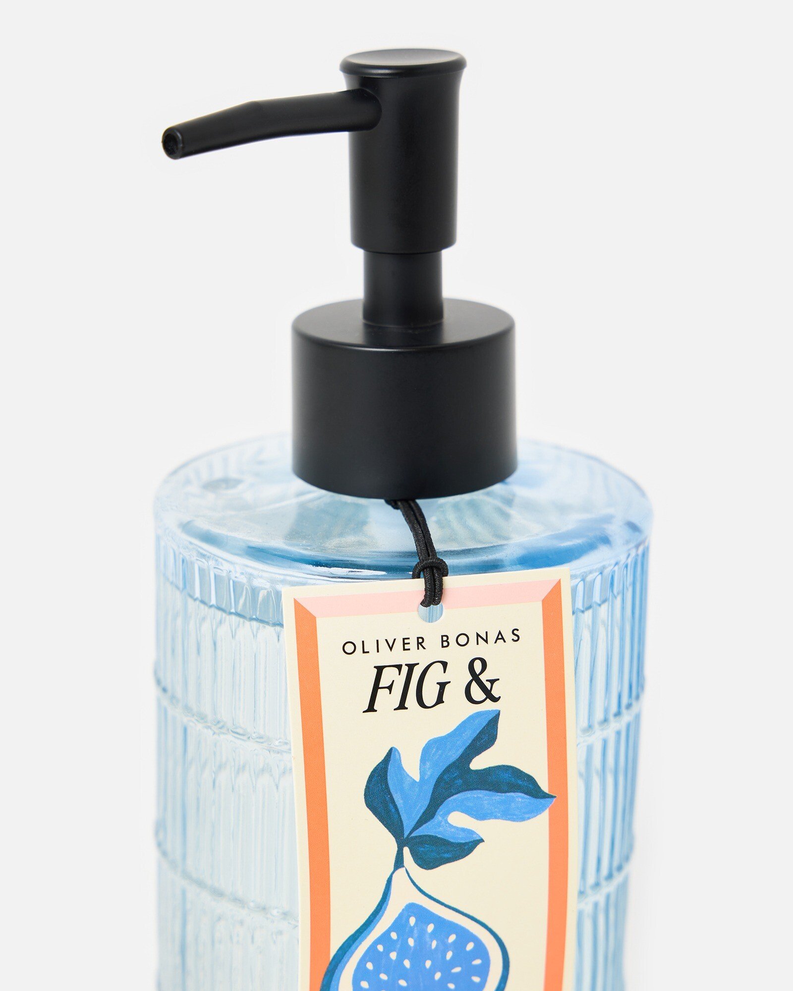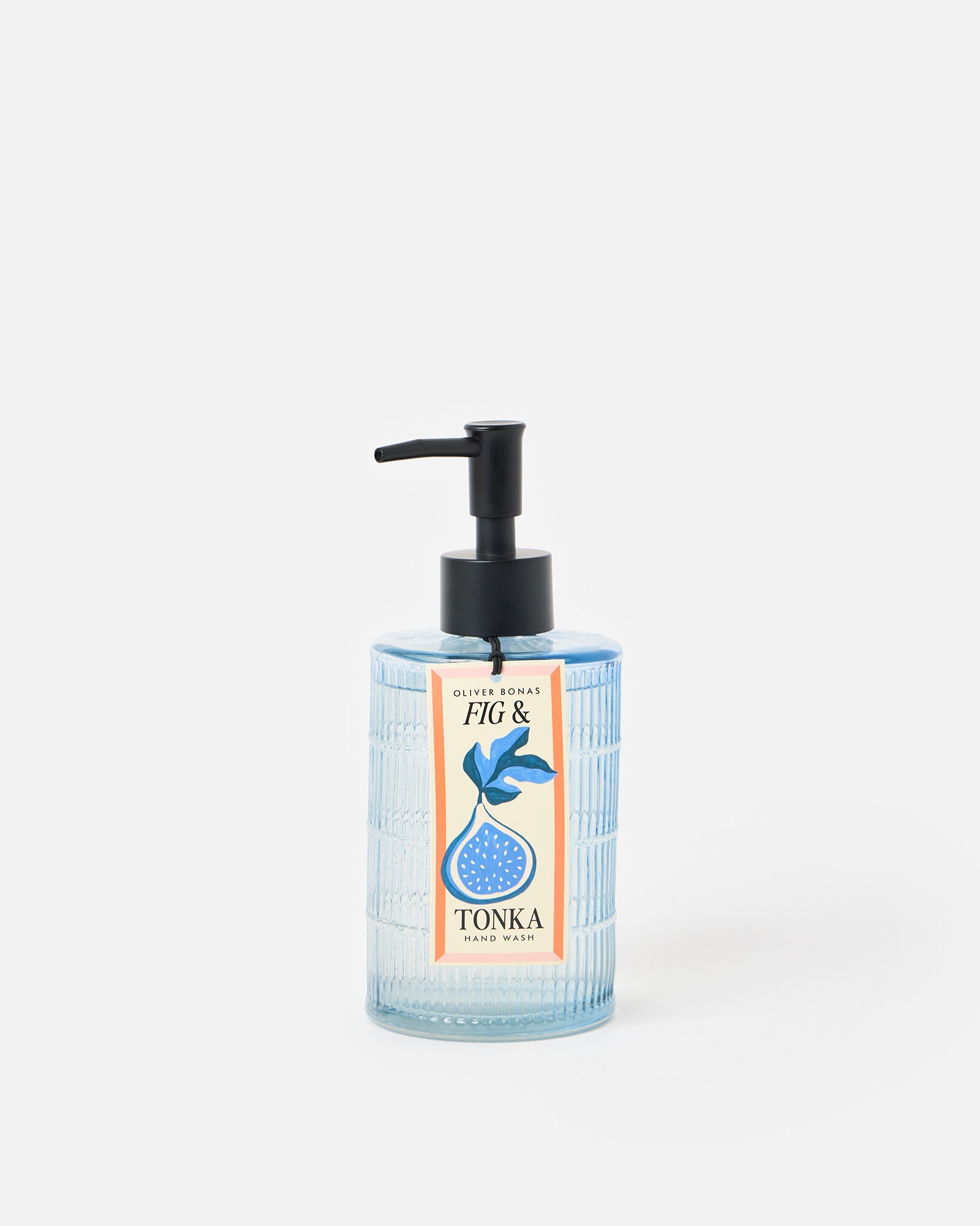 Fig and tonka bean scented hand wash with notes of fig, muguet, musk and vanilla. Packaged in a cut glass bottle with a gold pump and abstract floral illustrations hand-drawn in the OB creative studios.
