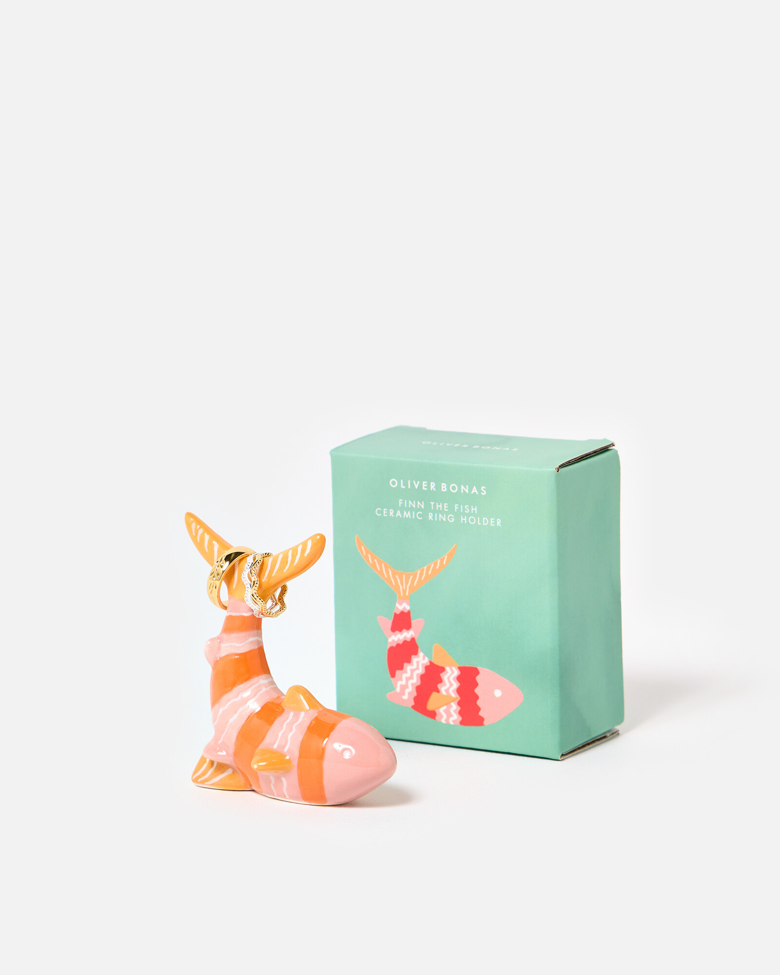 Playful fish-shaped ceramic ring holder in a pink and orange stripe with white line details. There's plenty of space to hang your rings on both tail fins, keeping them organised and easy to find.