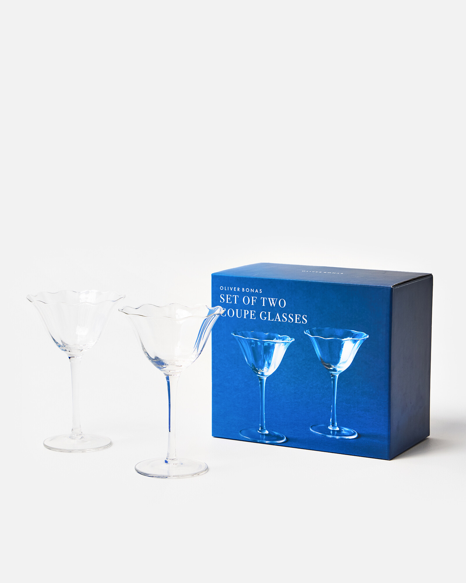 Set of two clear glass champagne coupes with fluted bowls and lightly waved rims. Each piece is finished by hand, and invokes a sense of floral femininity with its elegant curves and subtle details. Style and gift with other glassware from the Fleur range, for a sophisticated drinking experience. Perfect for gifting, hosting cocktail parties, and celebrating special occasions.
